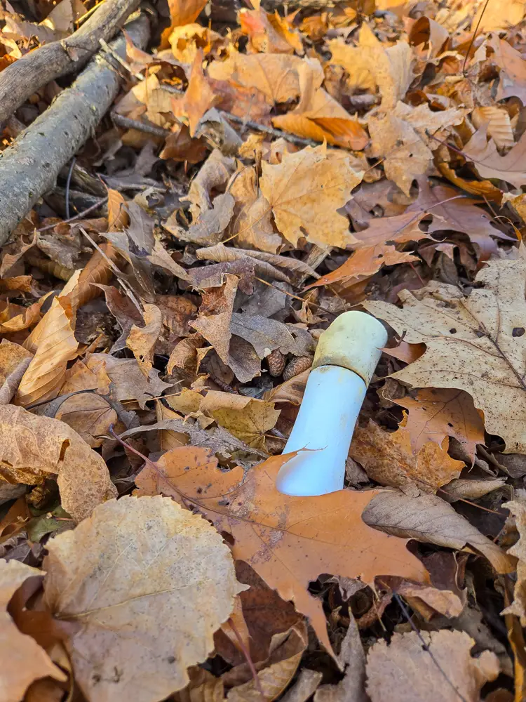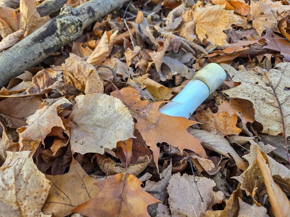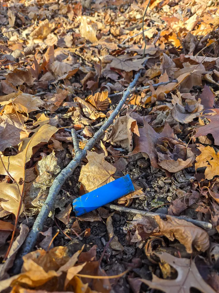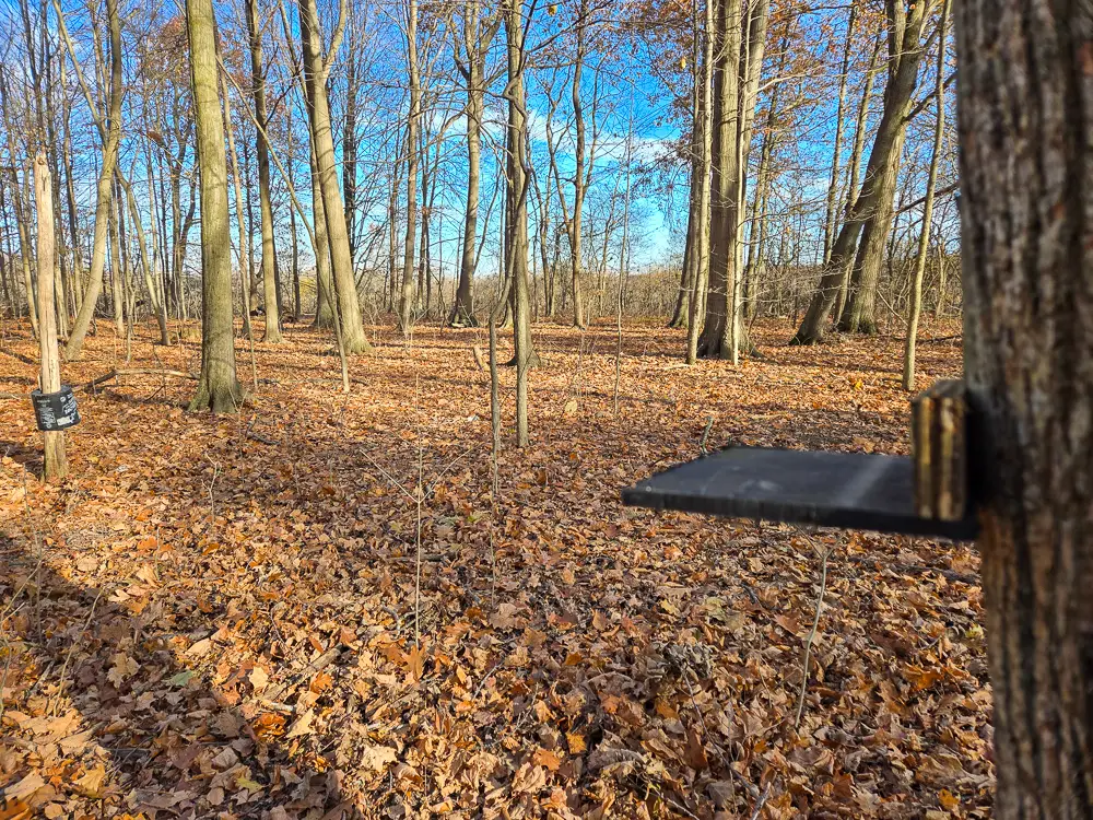 A plank attached to a tree resembles a trail camera mount, positioned unusually close to the road and tracks