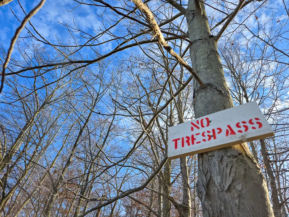 The property perimeter is marked by hand-painted “No Trespassing” signs