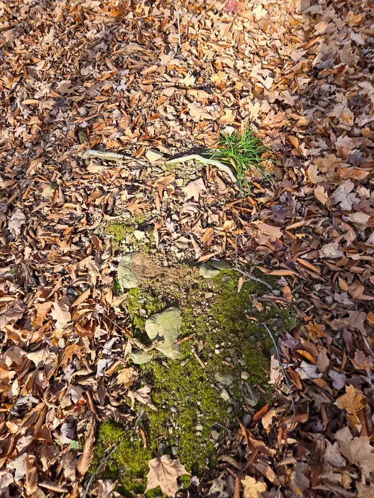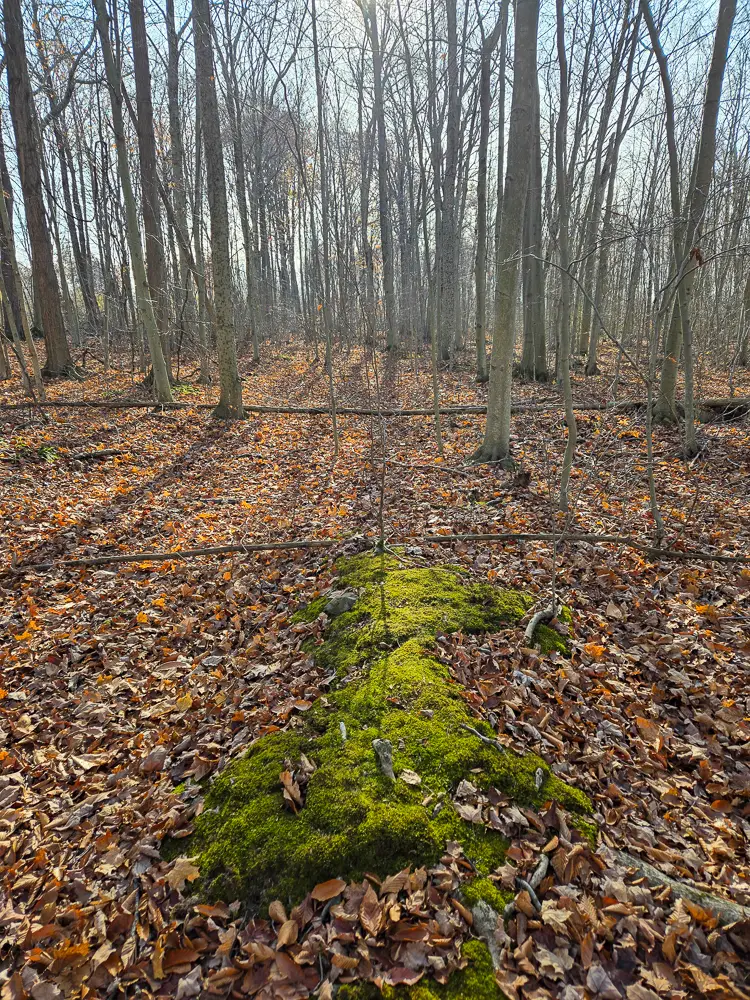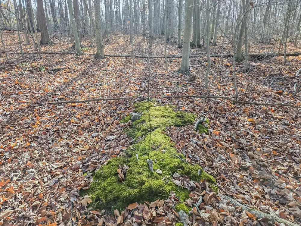 Large boulders and rocks appear placed unnaturally on moss-covered mounds