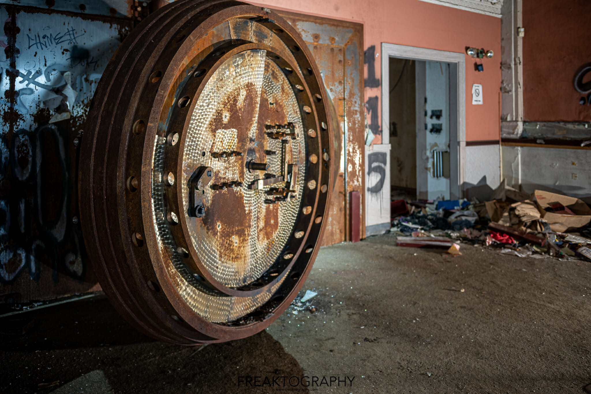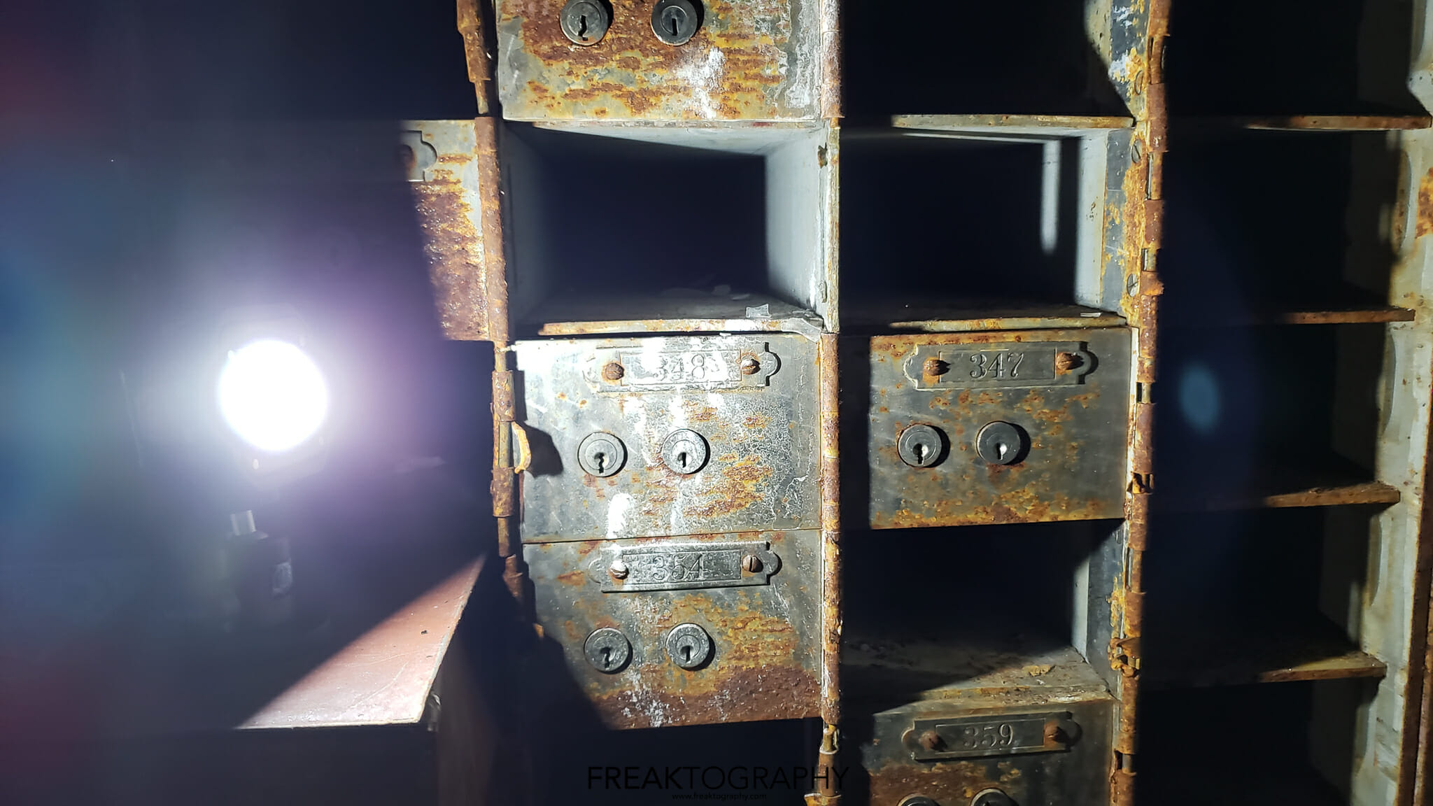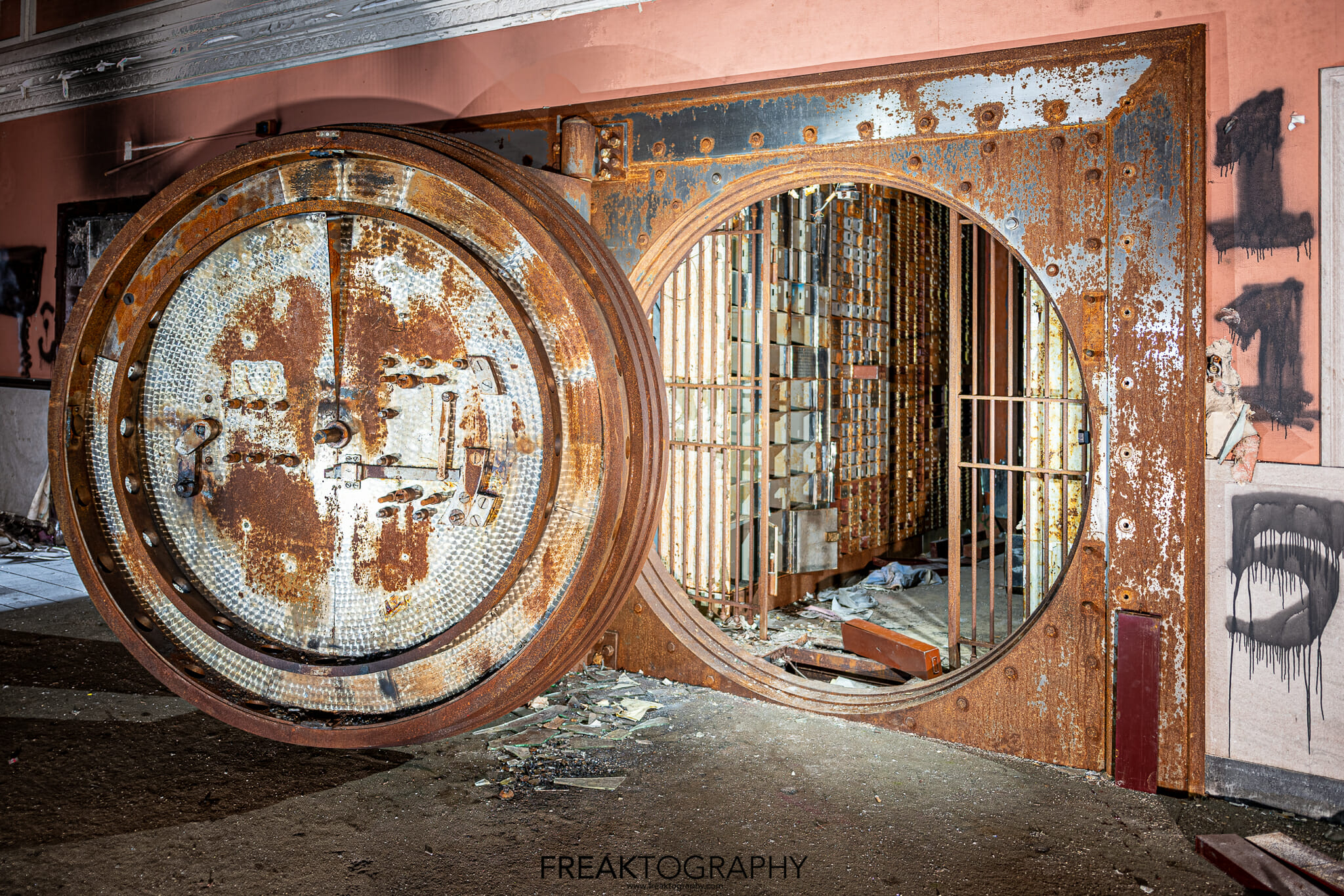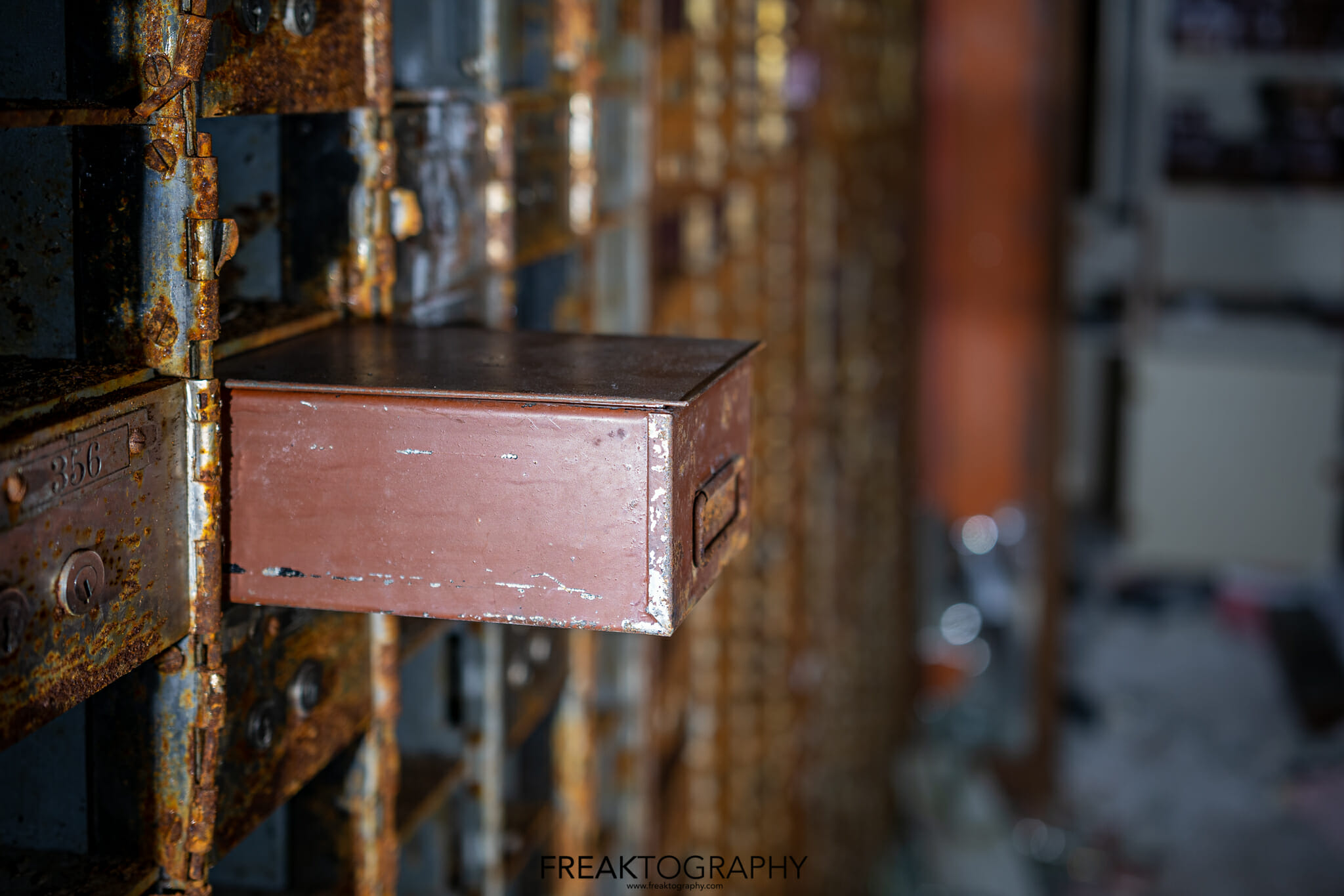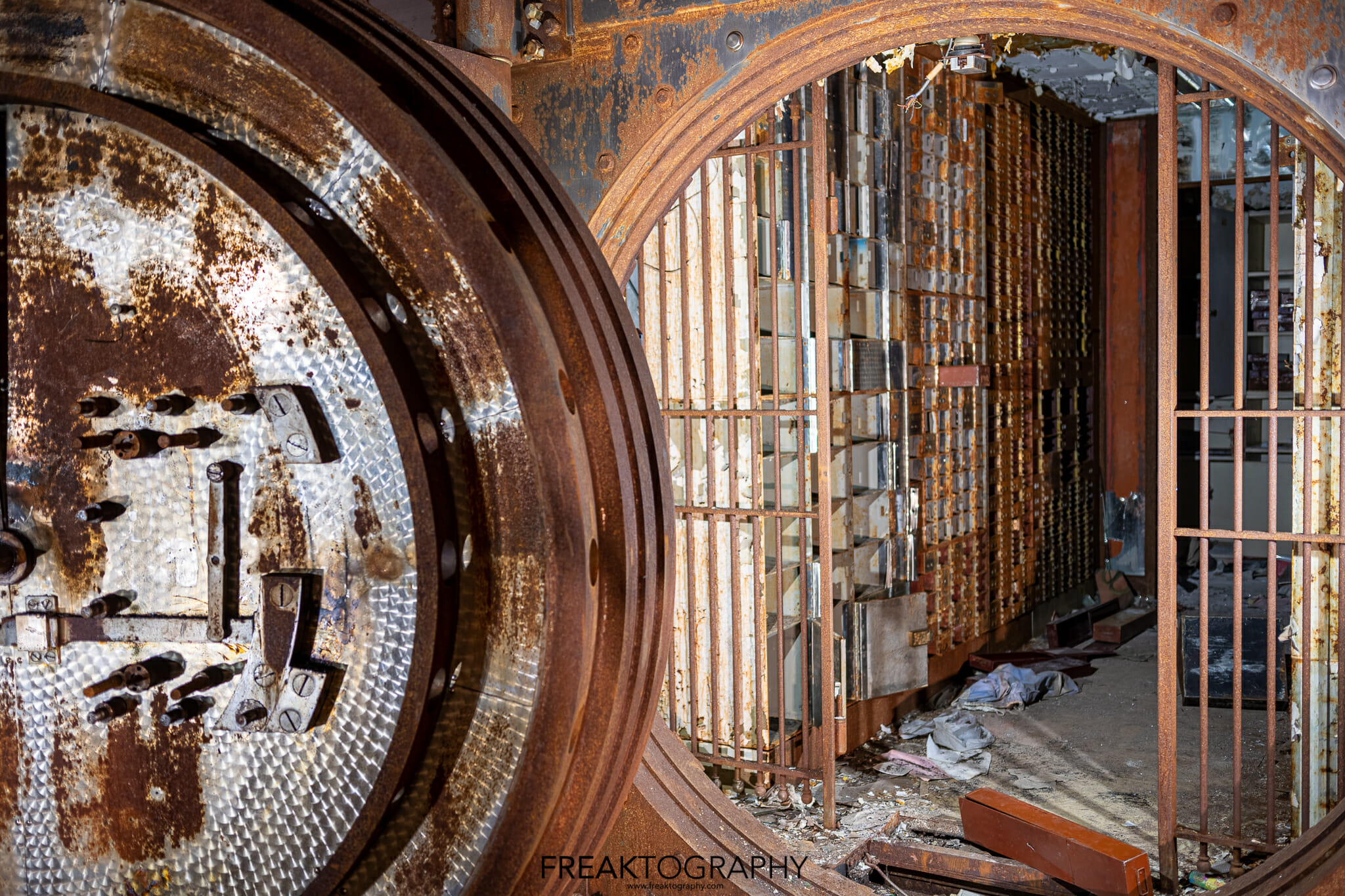 These photos were taken in an abandoned bank in Gary, Indiana where the massive vault is still there and left with most of the safe deposit boxes inside as well.