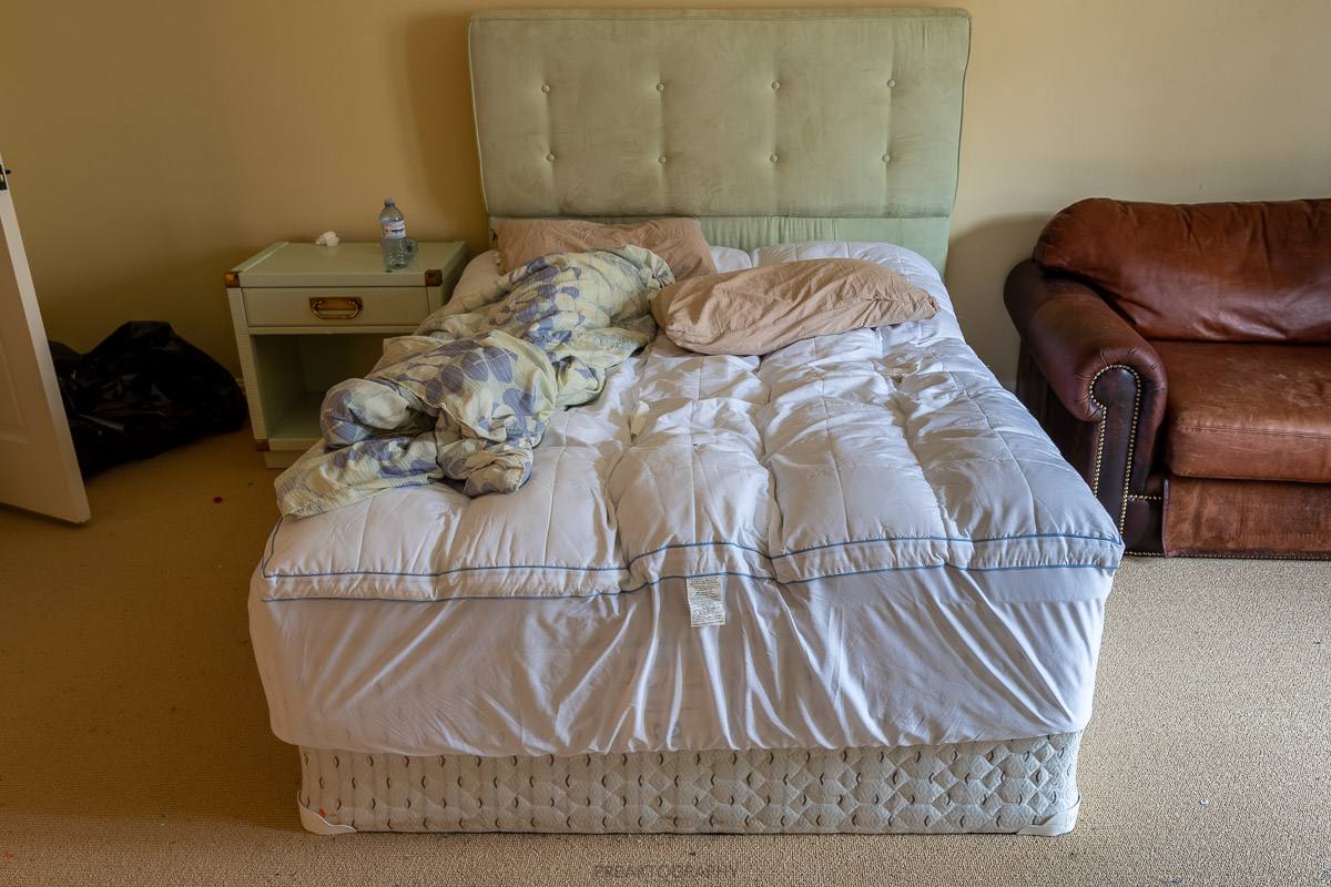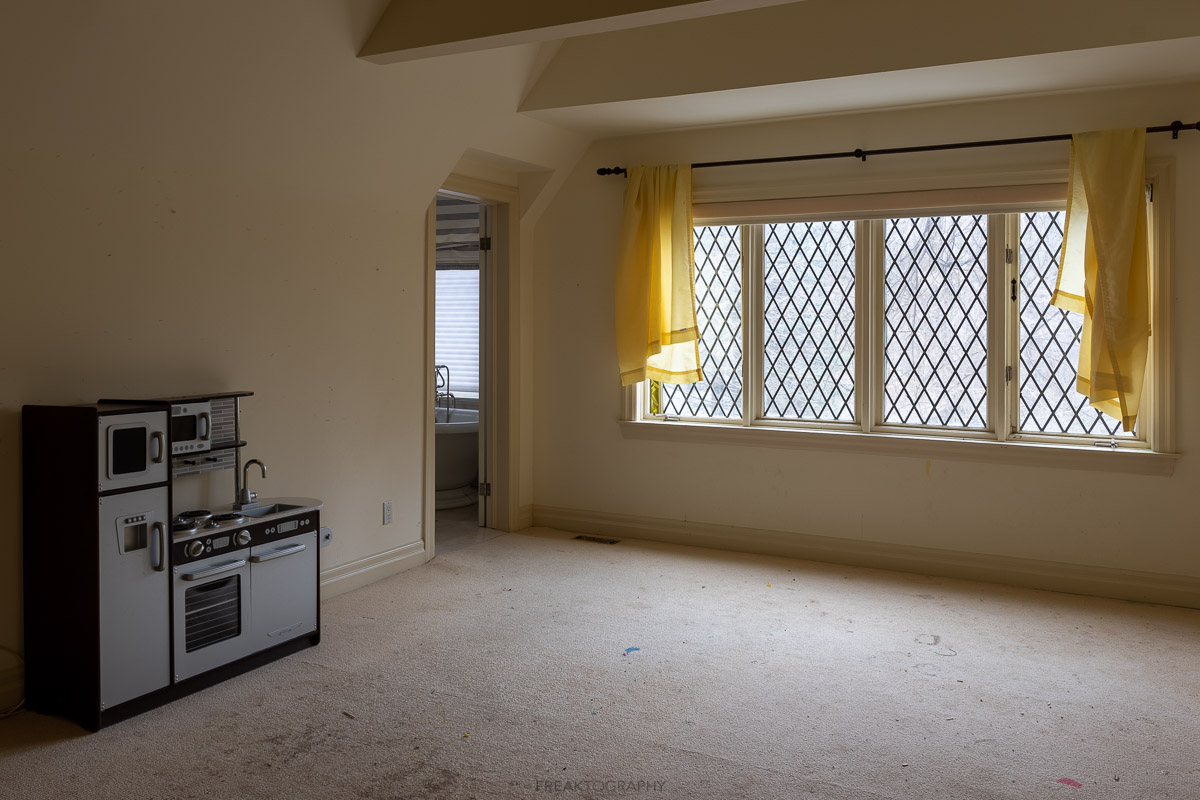 The home was interesting to navigate as it had so many rooms and multiple floors, a strange office positioned in between the 1st and 2nd floor, accessible by a small set of stairs. I found it strange to find things like artwork left behind, dishes in the sink and a bed, still with sheets and pillows upstairs.
