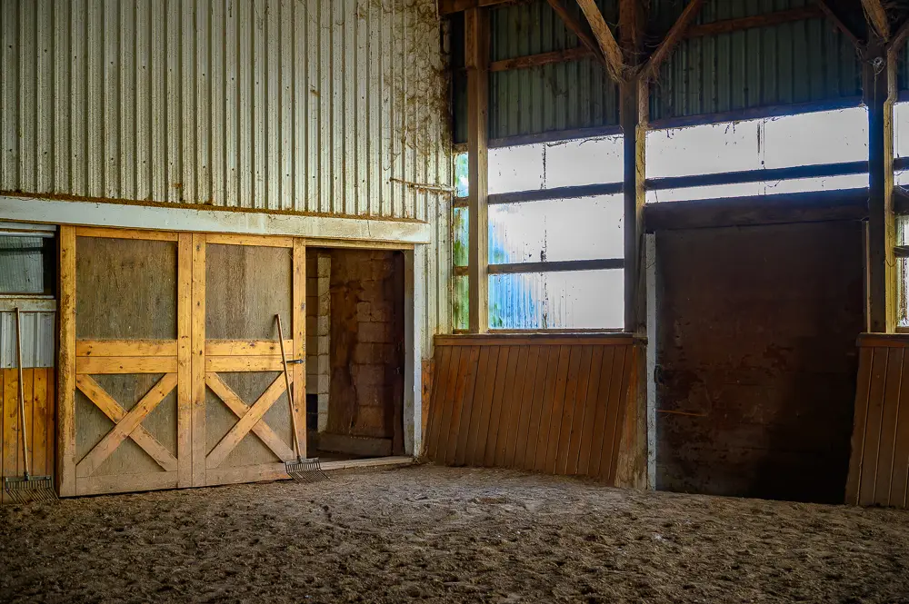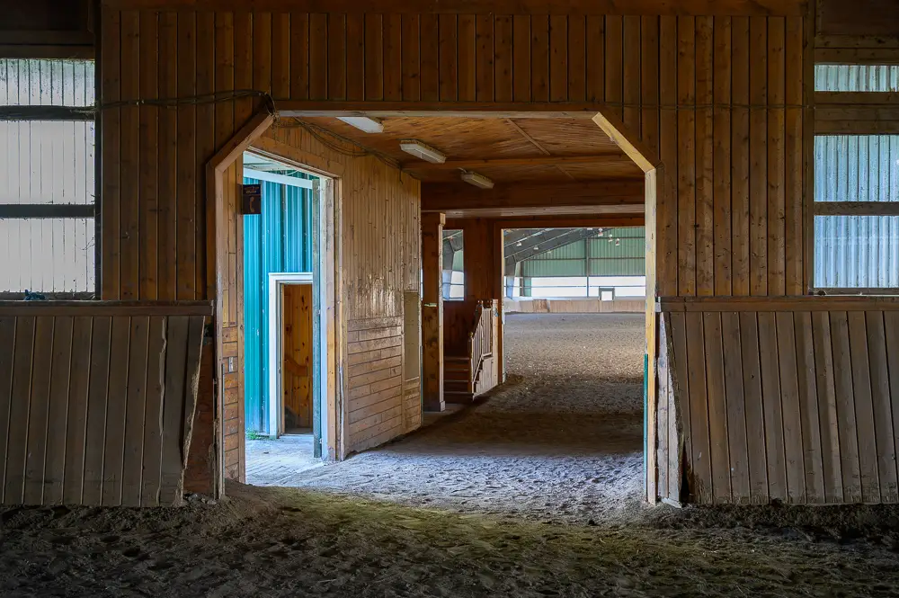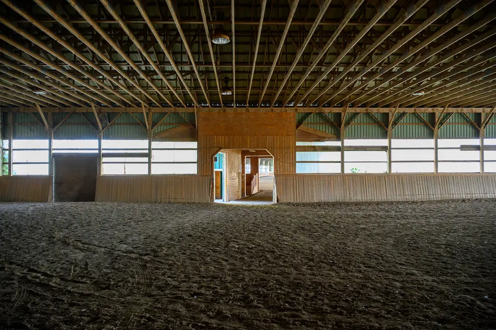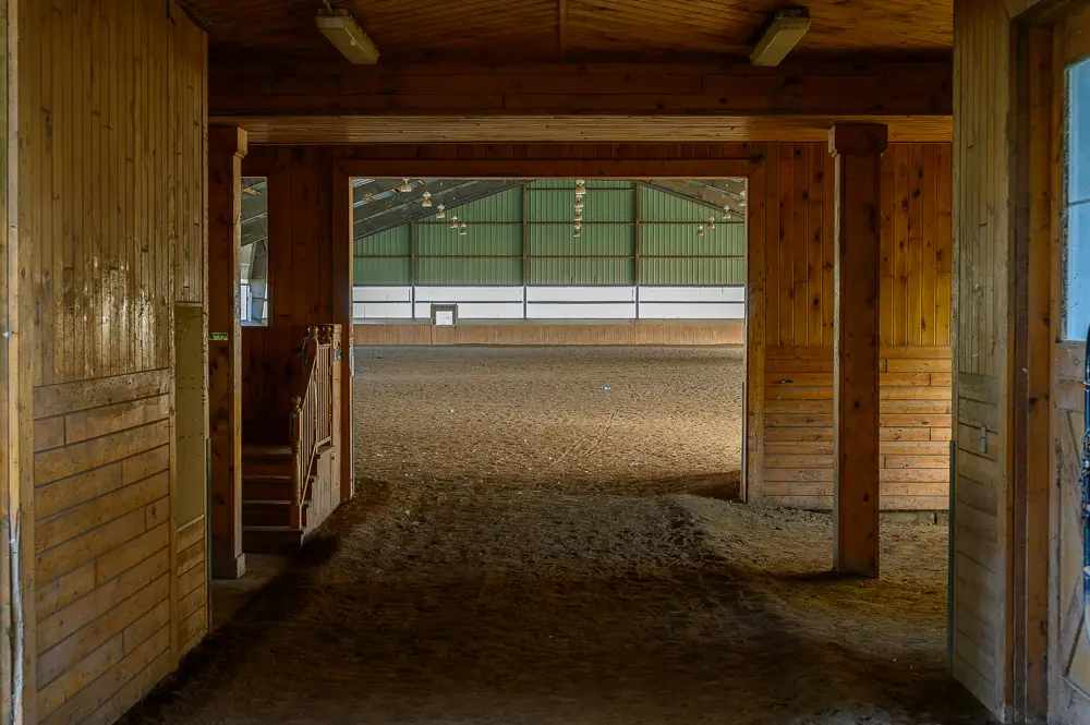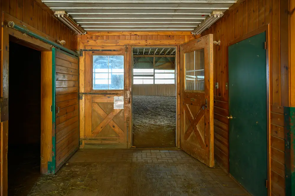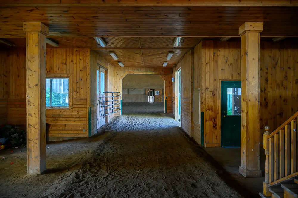 Today, the property is vacant. The barns stand quiet, the arenas are empty, and the living spaces have been left untouched since operations ended. Some equipment — buckets, blankets, and jump stands — remains behind, capturing a moment frozen between chapters.