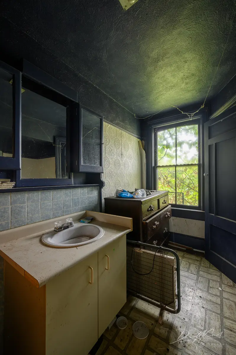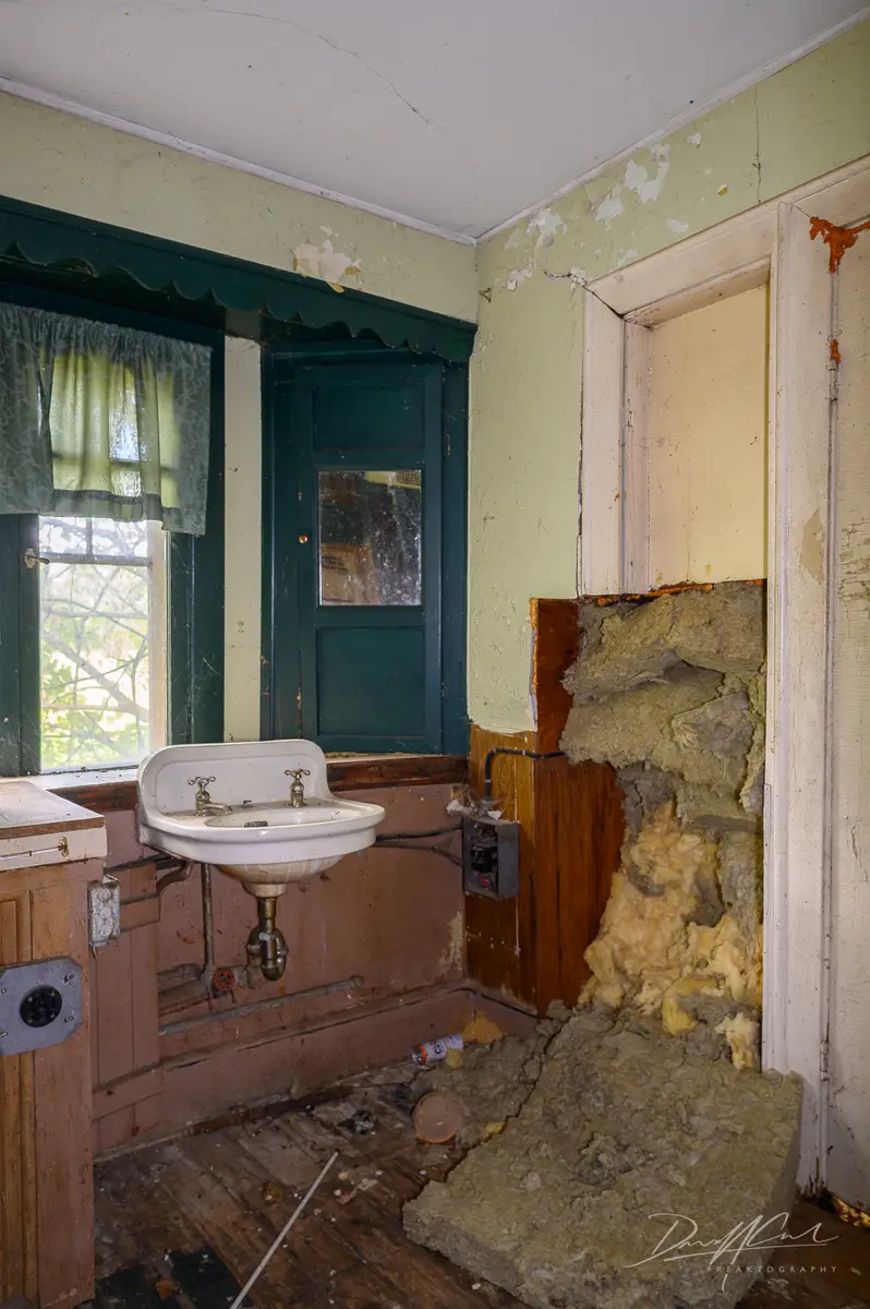 Walking through the front door feels like stepping back several decades. The original wood trim, still solid and beautiful, lines the rooms. The kitchen has not been updated in generations, its cupboards and fixtures frozen in another era. A few pieces of furniture still remain, left exactly where they were last used. The detail that stands out most is a collection of bottles on the counter, possibly moonshine, possibly something more ordinary — but their presence sparks endless speculation.