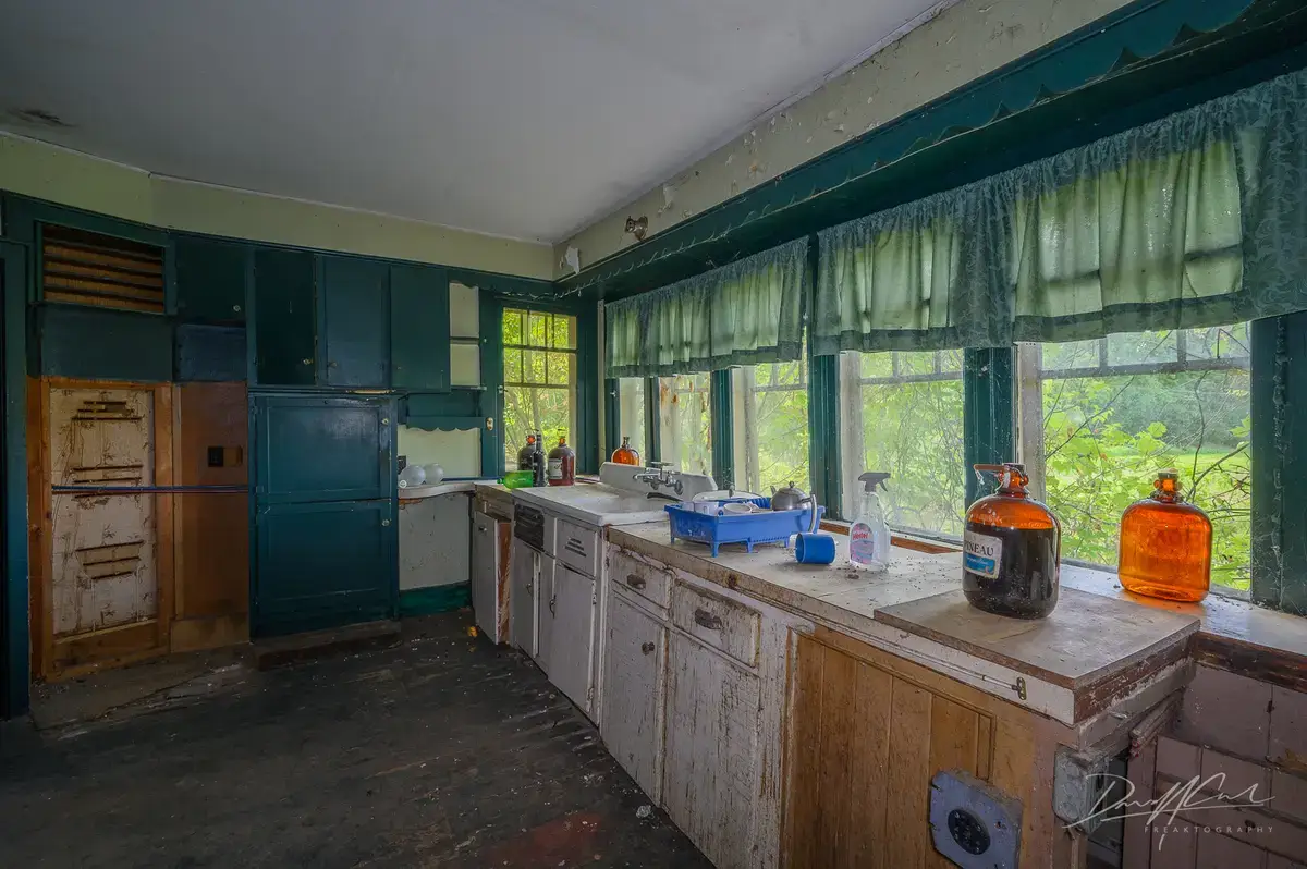 This farmhouse still has original wood trim, vintage furniture, and a kitchen that has not been updated in decades. The bottles left in the kitchen add an extra layer of mystery to the story of this abandoned building.