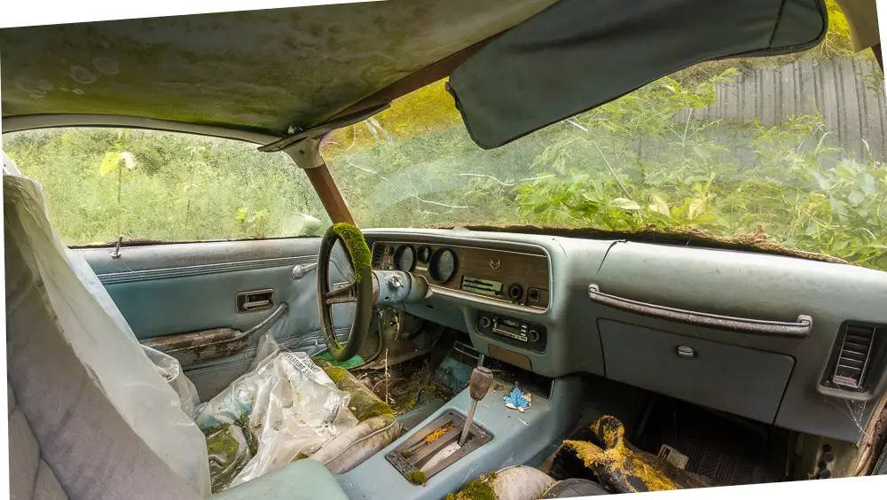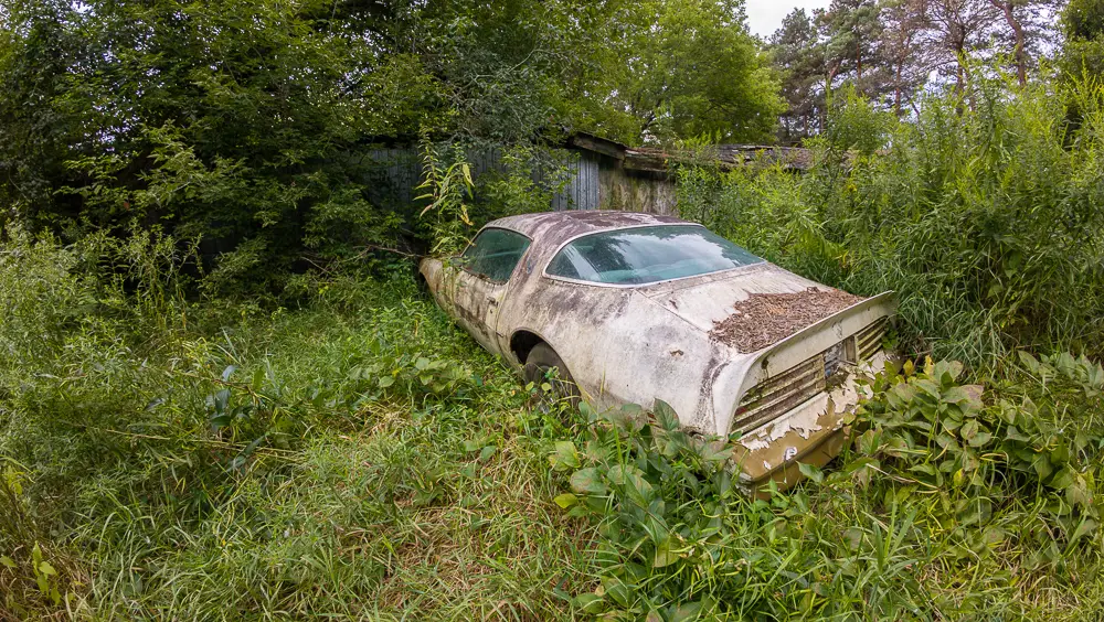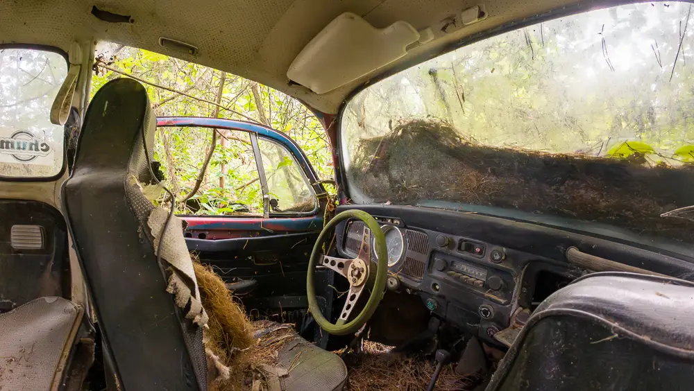 Left untouched and hidden from view, the Firebirds and the VW Beetle remain preserved by seclusion, making this a rare example of abandoned vehicles surviving deep within a forested landscape.