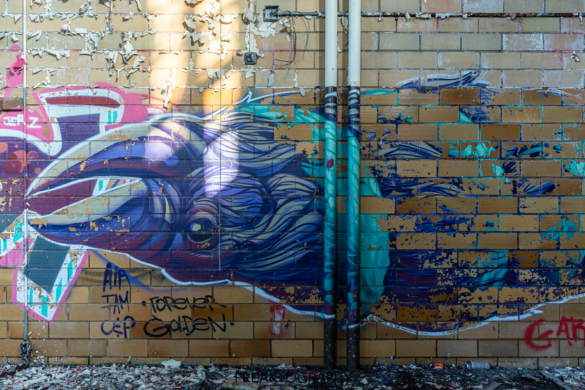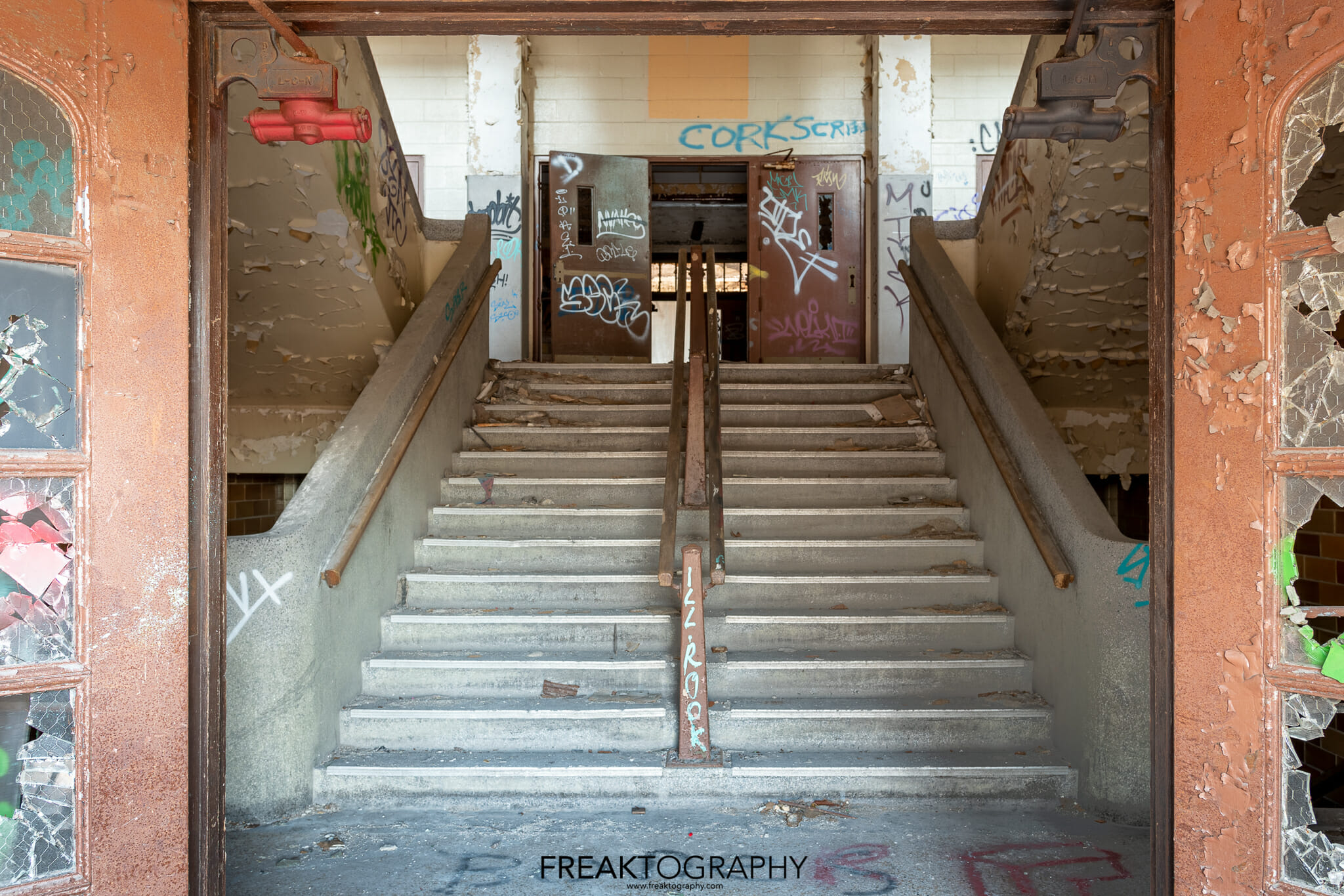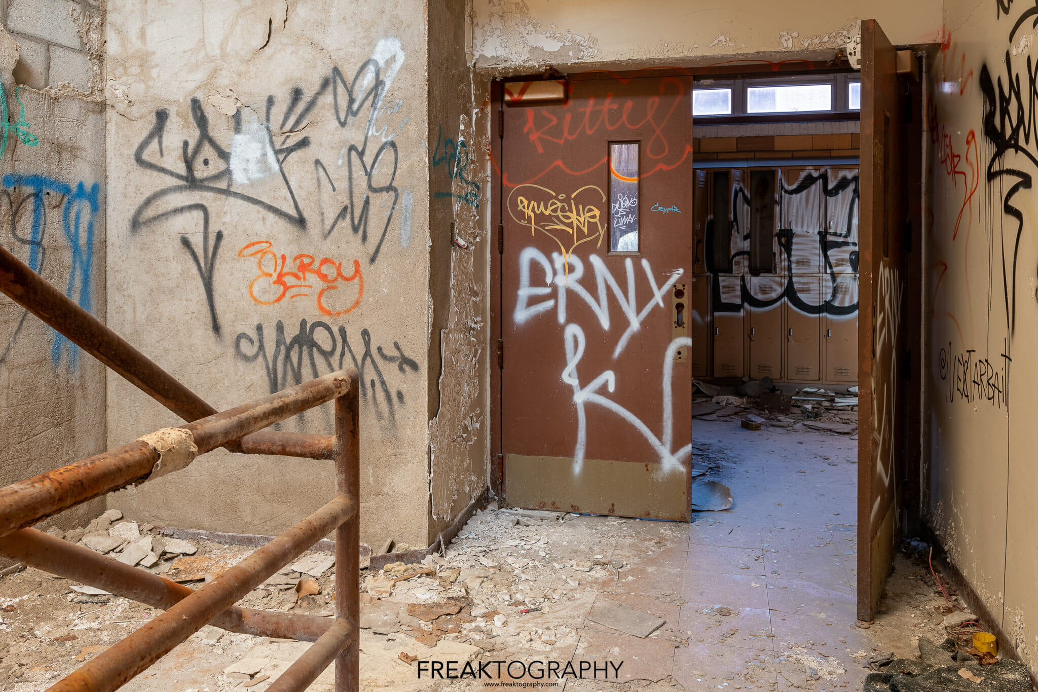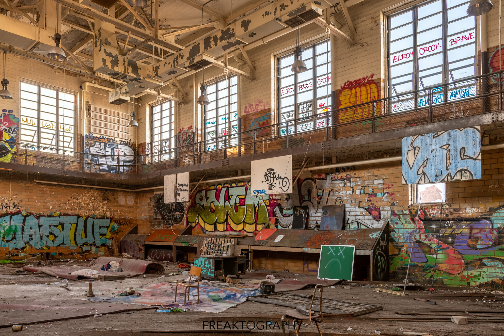 Two older gymnasiums located near the auditorium are in advanced decay, full of graffiti and are very well lit thanks to the large windows. A newer gymnasium on the other, newer side of the school was flooded and very dark so no photos were taken there.
