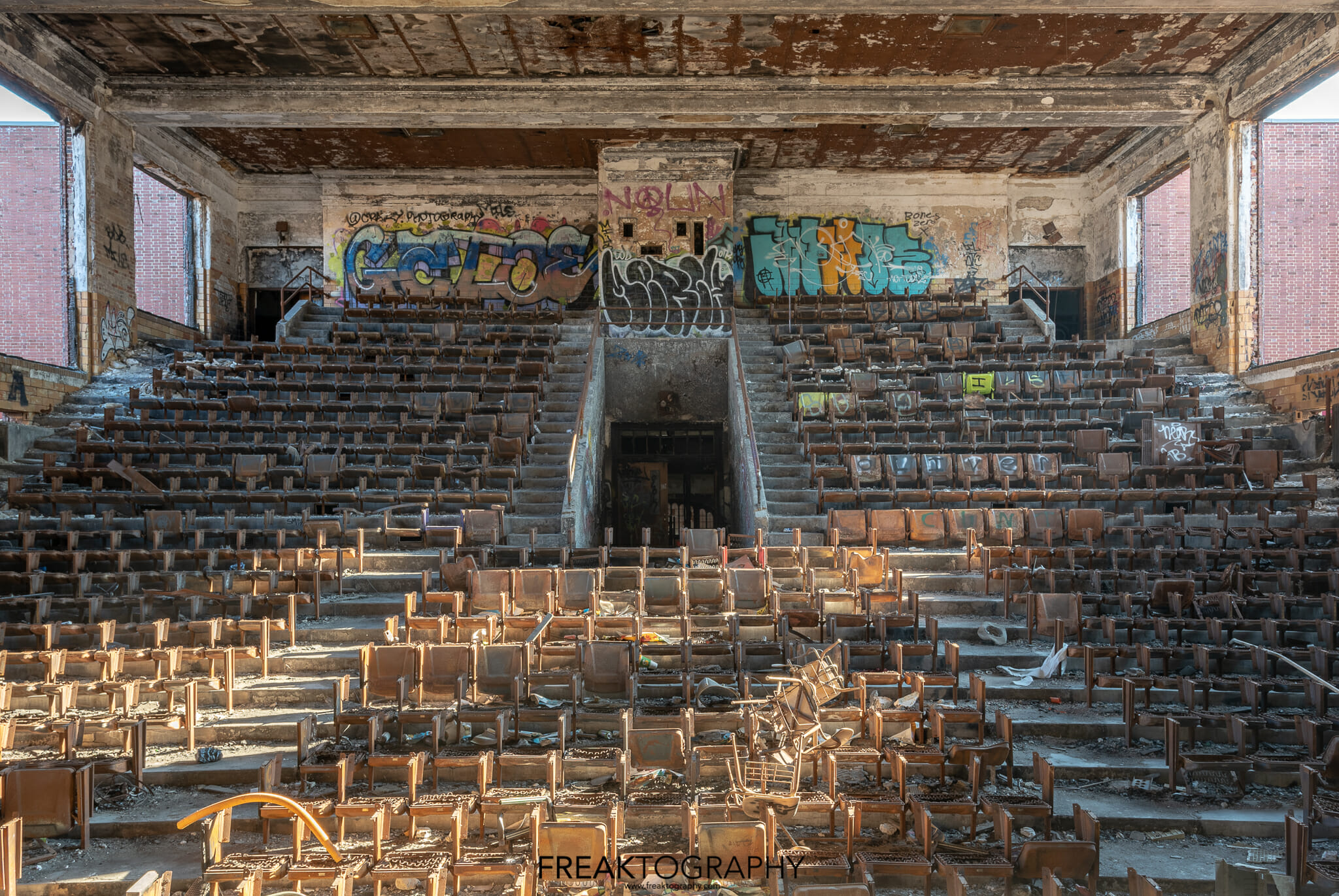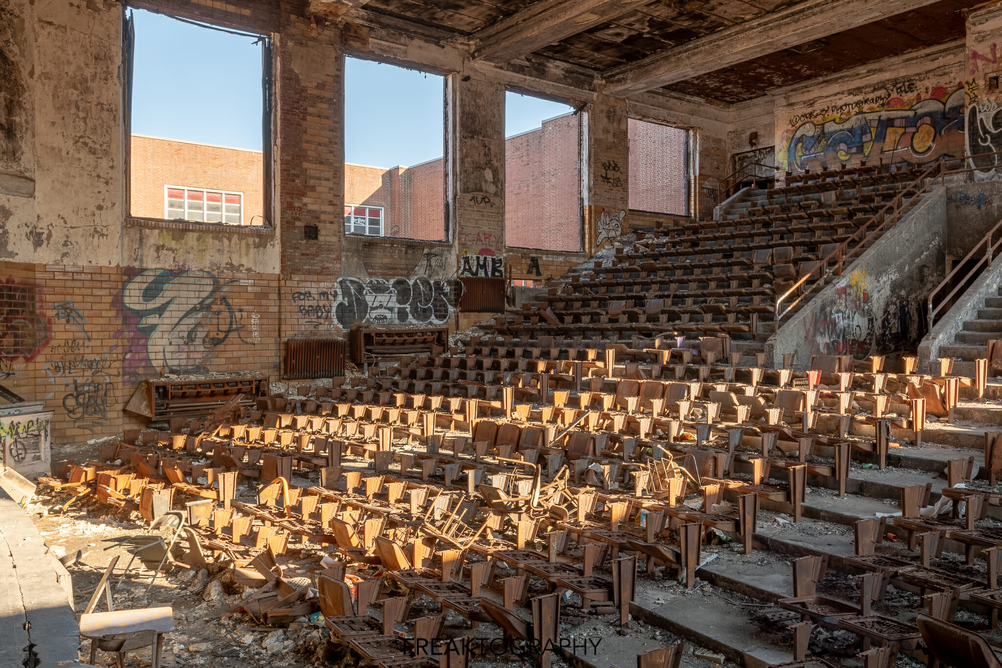 The school was huge and the auditorium beautiful, much like Cooley High School in Detroit. The auditorium, once with red seats has since been torched leaving nothing but twisted metal and springs and heavy decay.