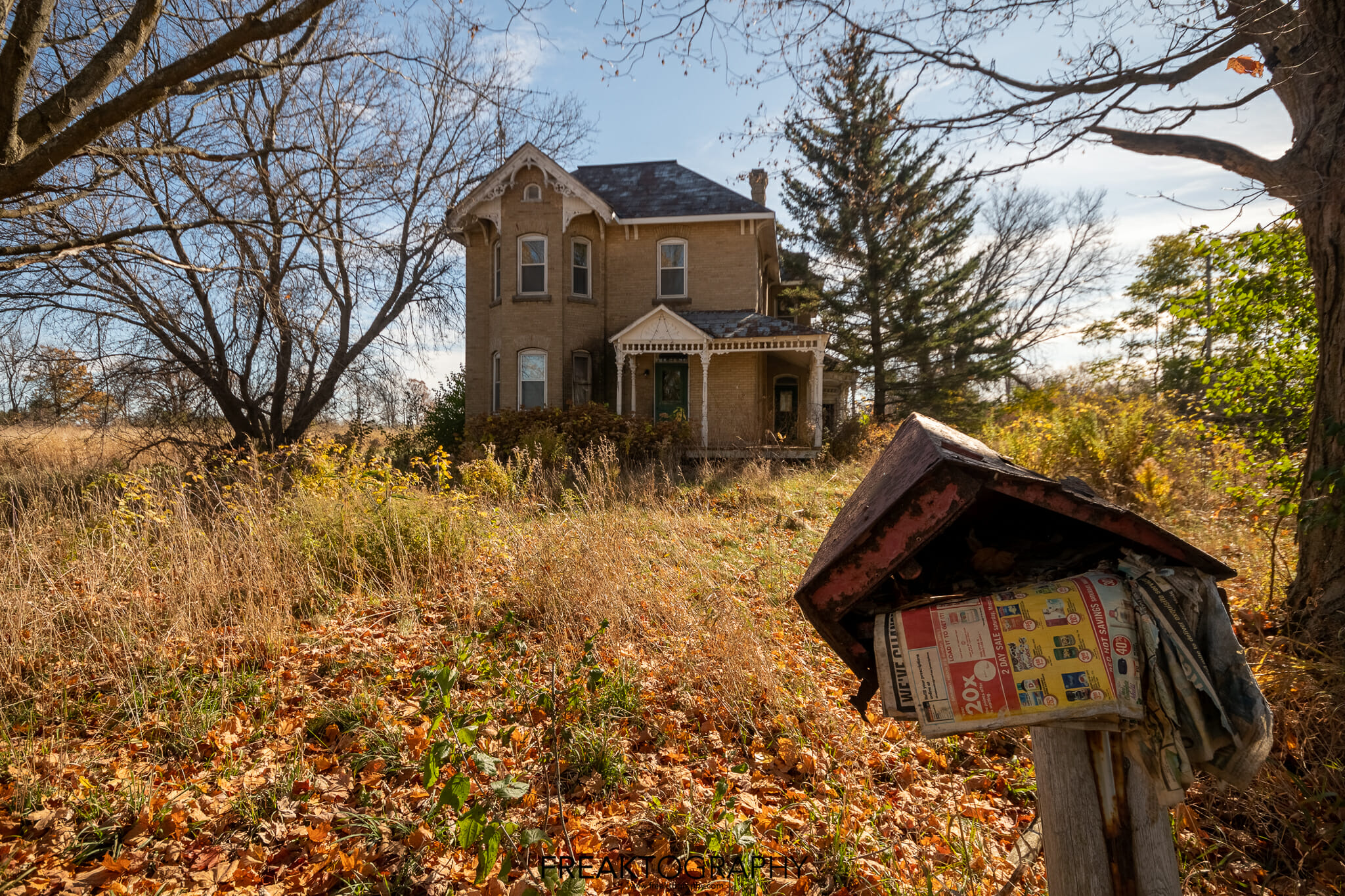This abandoned house was a random discovery found along a backroad somewhere between Burlington and Kingston Ontario Canada. On my annual Fall road trip I was driving between locations and as I do, not paying attention to the road in front of me I was scanning the homes to the left and right. I spotted a mailbox stuffed and overflowing with old mail and flyers and an old derelict looking house beyond it.