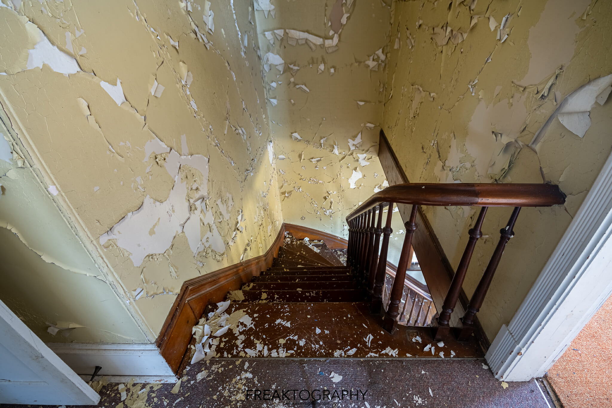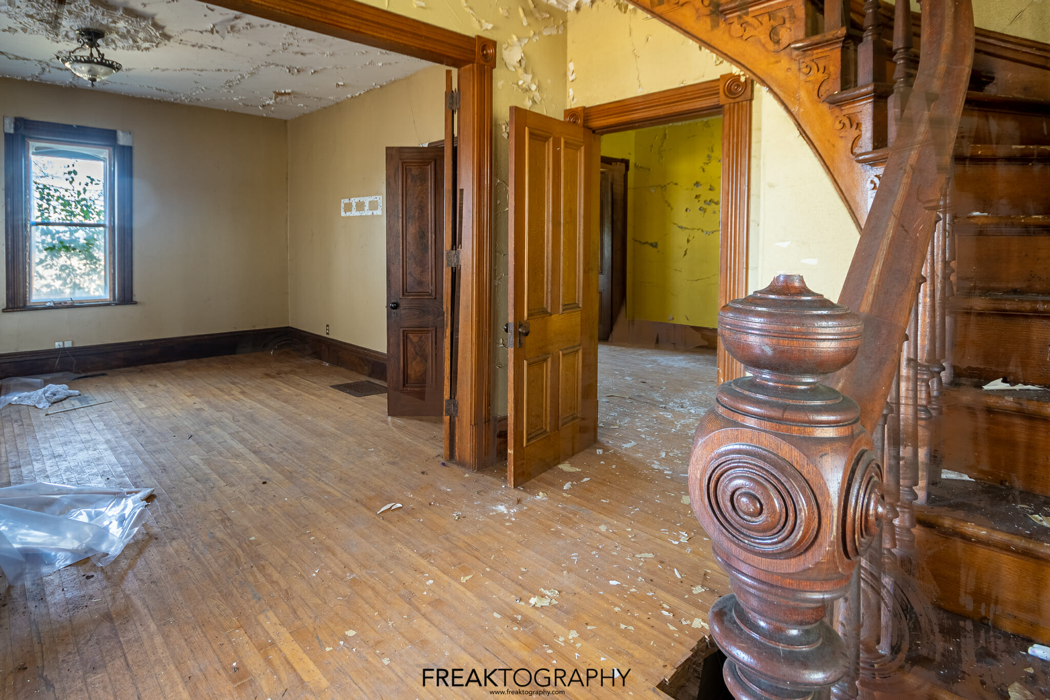 Making my way in, the abandoned house is surprisingly in tact, normally in a home like this, the railing and newell post for the staircase is gone or in shambles, this one seems to have avoided graffiti and vandalism.