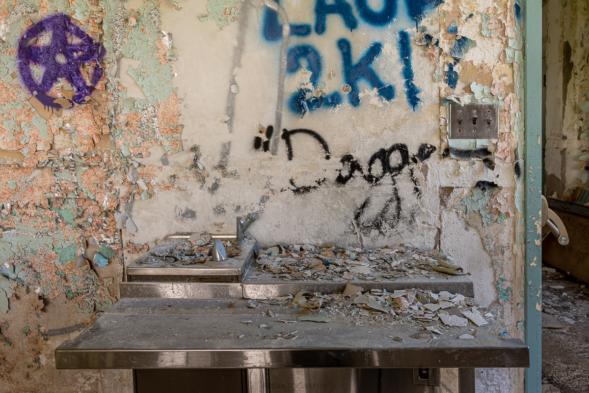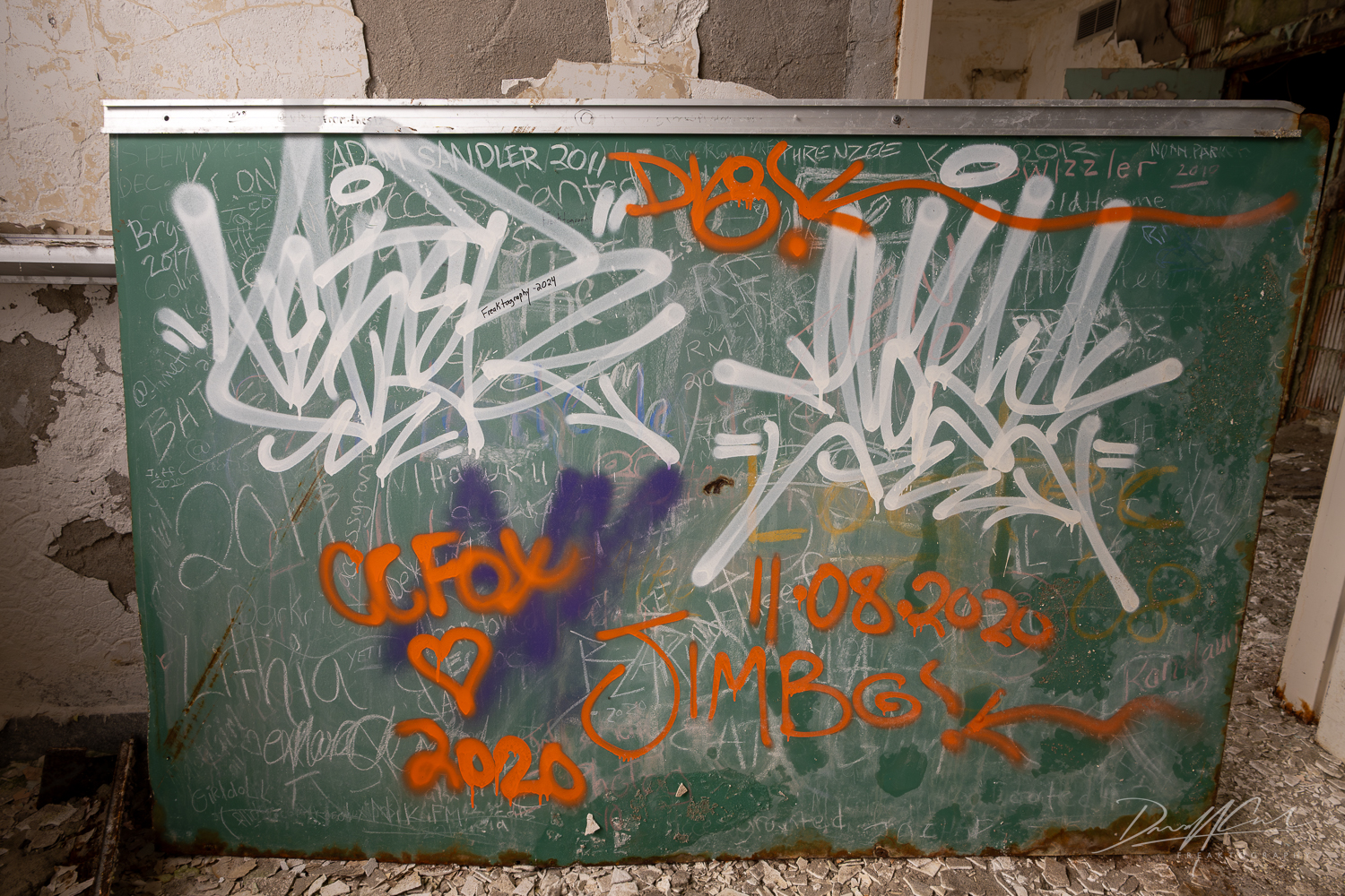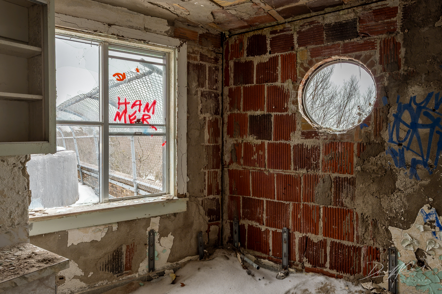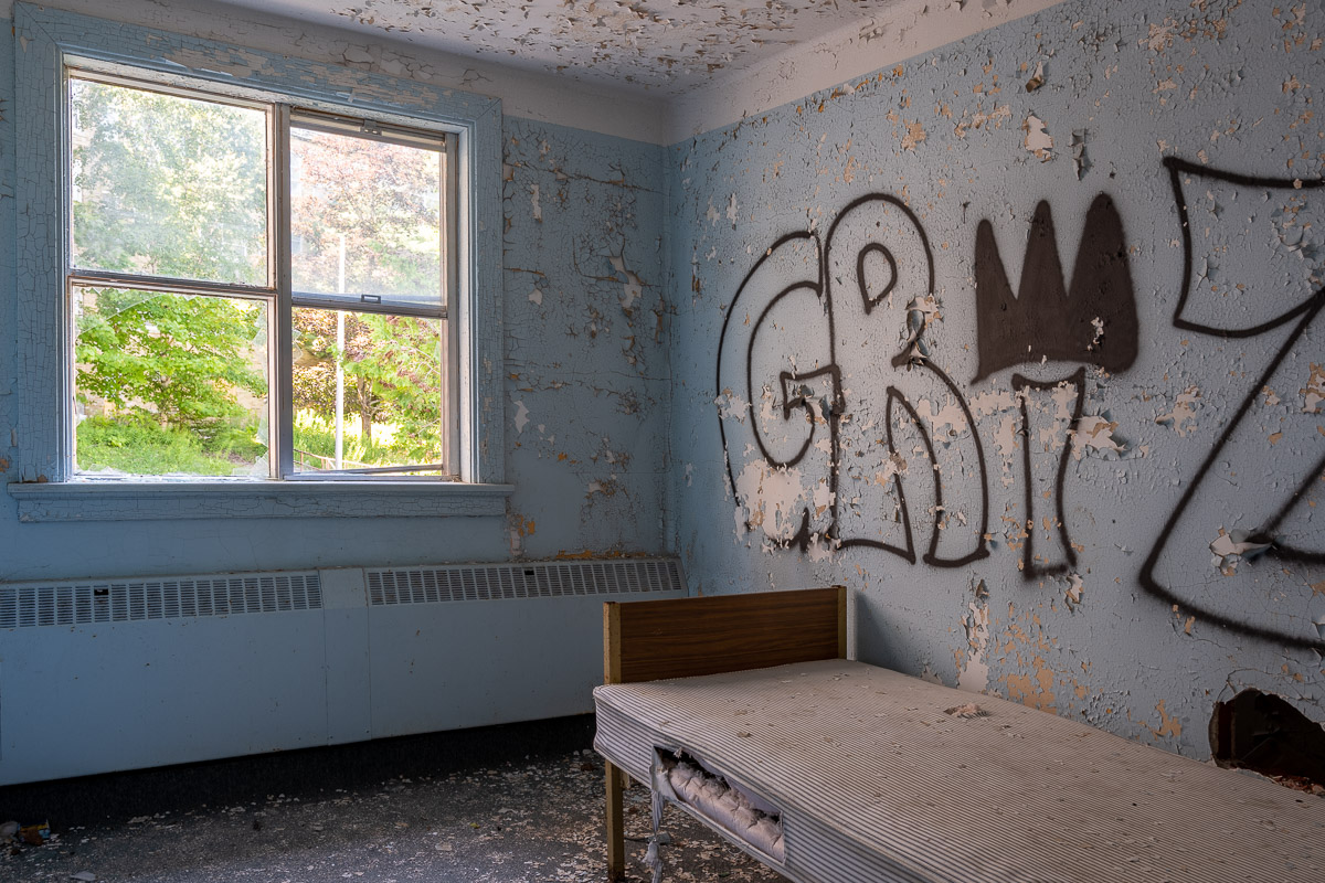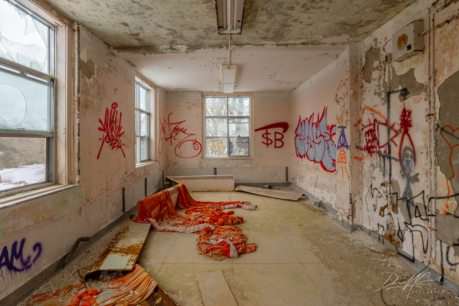 I said goodbye and made my way around, I wasn’t having much luck finding a way inside until I finally came across a window that had a board ripped off and a table to allow for easier entry. Relieved that I hadn’t wasted my time I made my way into the San once again and right away knew where i was. I managed to keep my bearings the whole time I was inside, unlike my first explore I knew where I was the whole time. First observation, much more graffiti this time around….LOTS more! Also much more vandalism, I didn’t think it was possible to vandalize this place more than it was, but they found a way!