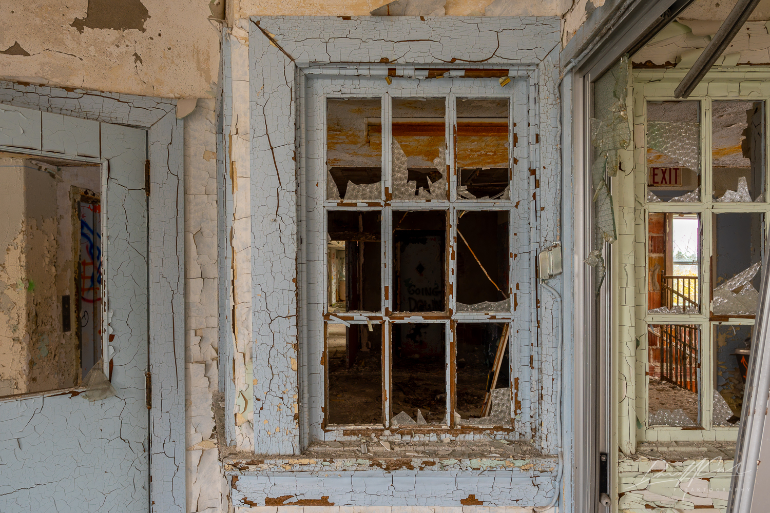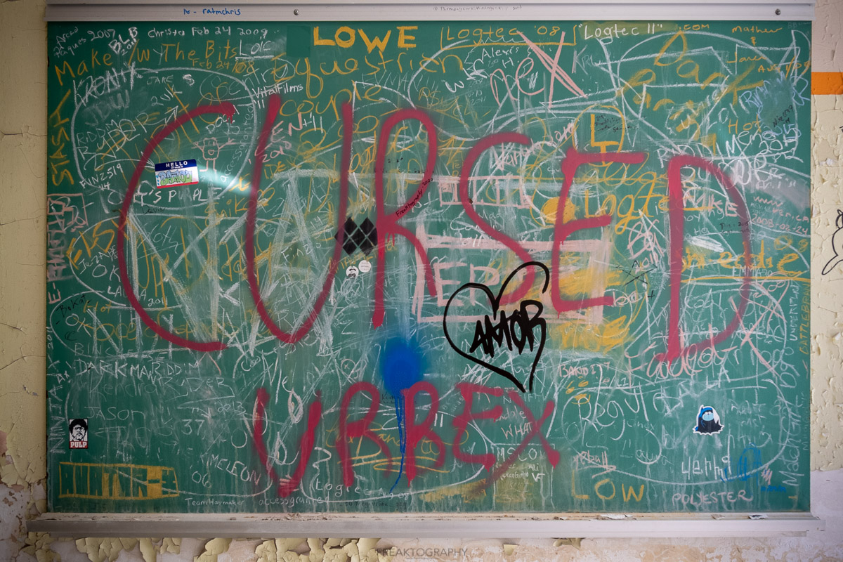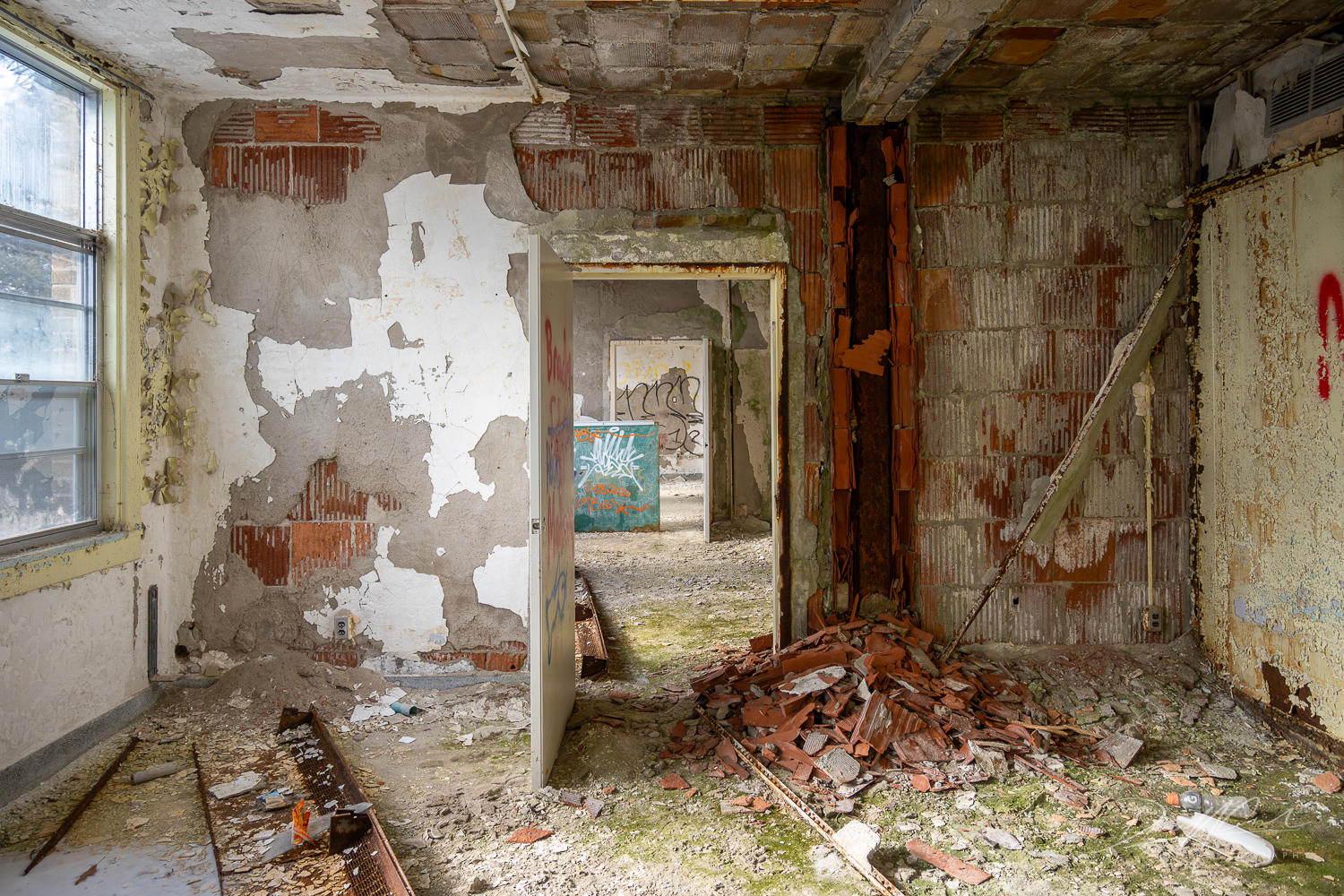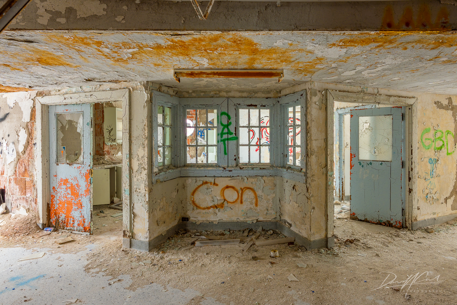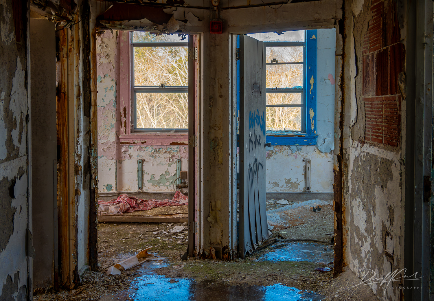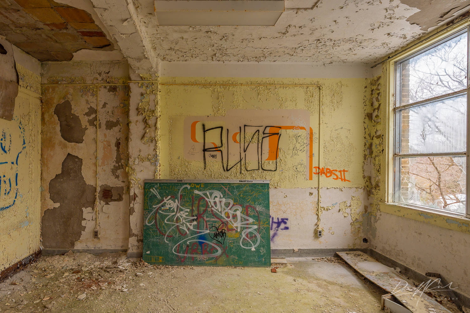 I said goodbye and made my way around, I wasn’t having much luck finding a way inside until I finally came across a window that had a board ripped off and a table to allow for easier entry. Relieved that I hadn’t wasted my time I made my way into the San once again and right away knew where i was. I managed to keep my bearings the whole time I was inside, unlike my first explore I knew where I was the whole time. First observation, much more graffiti this time around….LOTS more! Also much more vandalism, I didn’t think it was possible to vandalize this place more than it was, but they found a way!