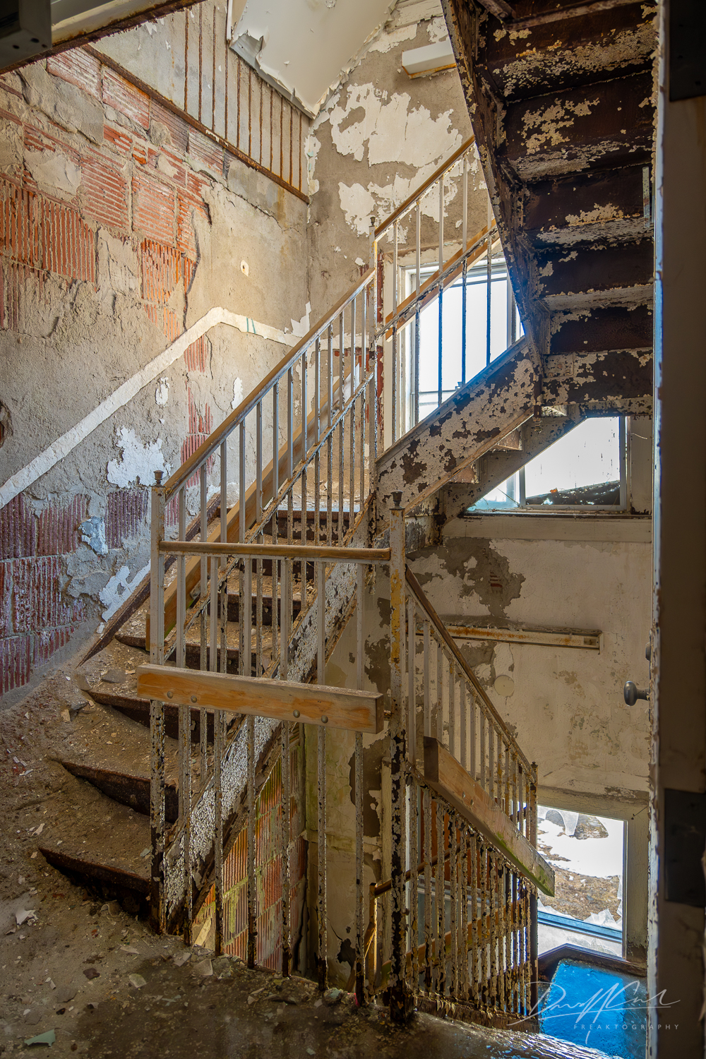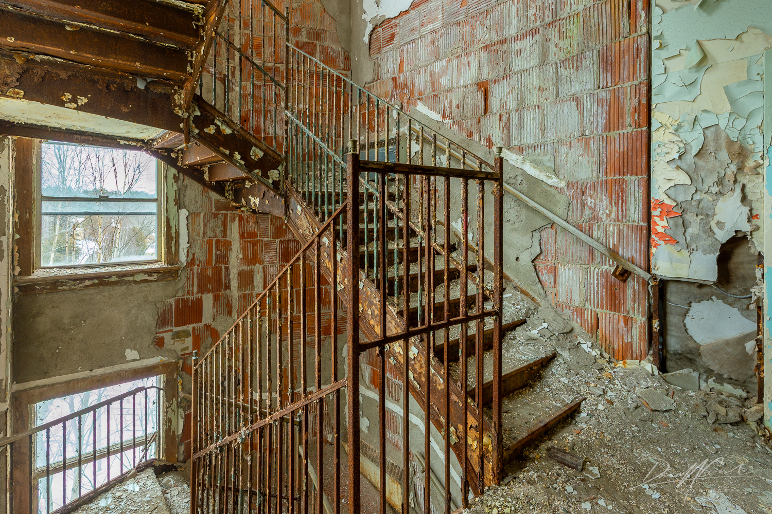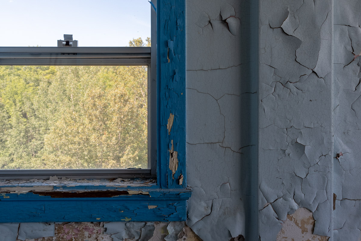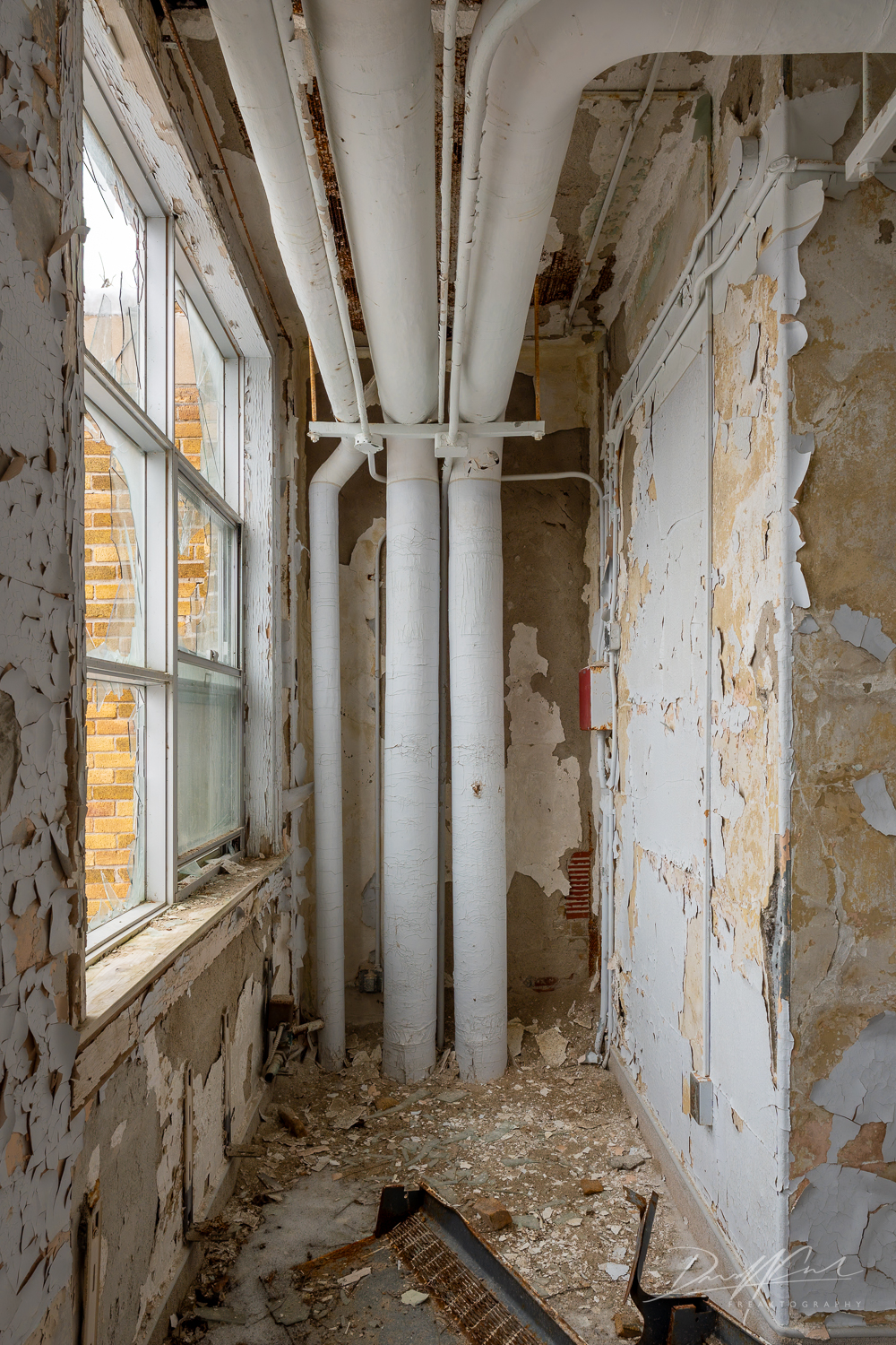 I found it very easy to get lost and turned around as I navigated this massive abandoned facility, having seen many photos from others I passed and photographed many familiar scenes. I would try and get my bearings but with so many hallways and stairwells I kept losing my place. I would make my way to the roof where I watched the security doing his patrol and then sit in his van. I enjoyed my lunch and captured some photos from the roof and the fall scenery before I made my way back inside to try and get back to the single open window in the basement, this was no easy task!