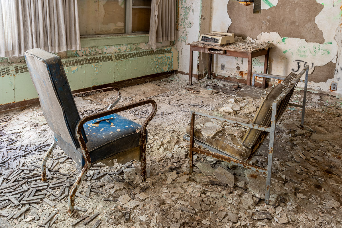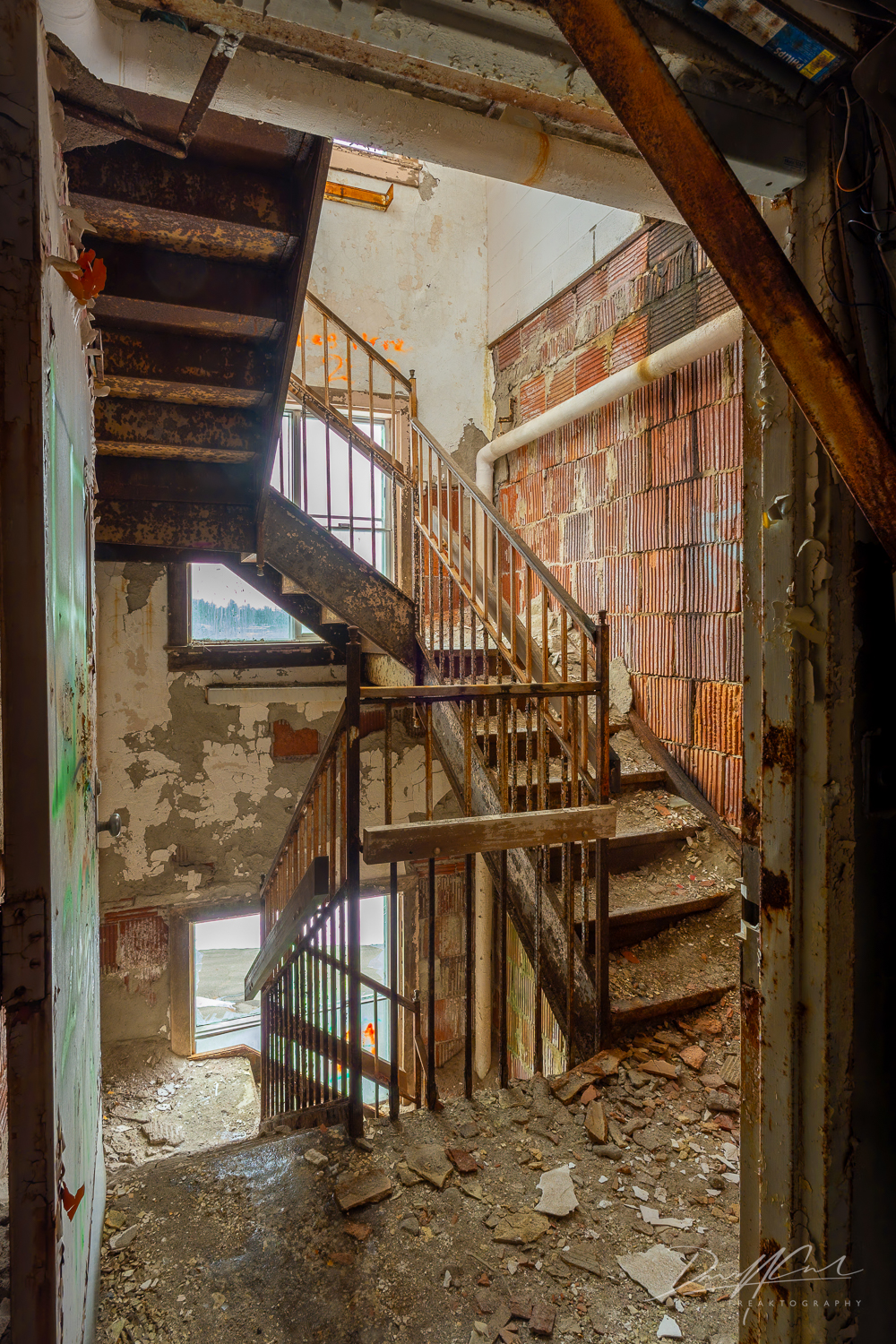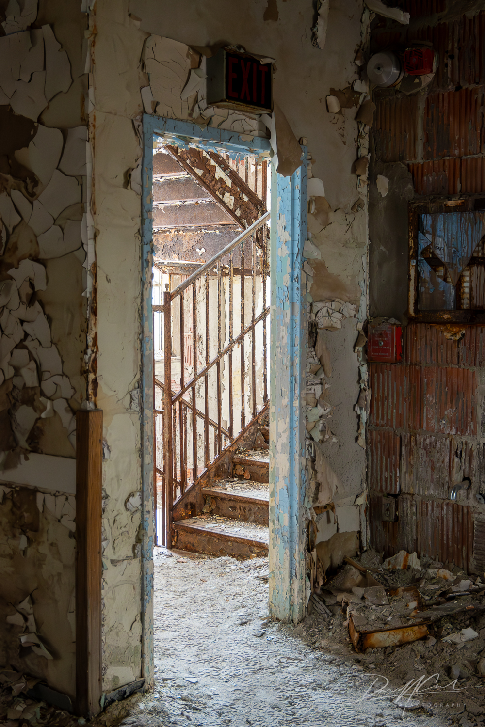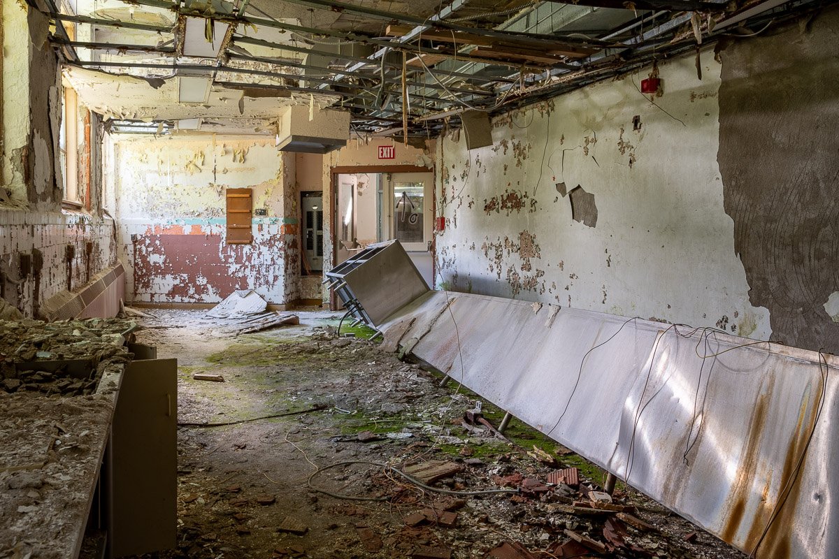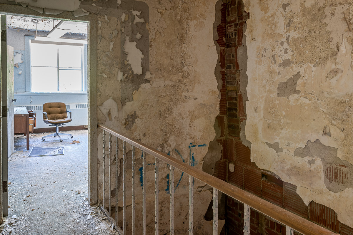 I found it very easy to get lost and turned around as I navigated this massive abandoned facility, having seen many photos from others I passed and photographed many familiar scenes. I would try and get my bearings but with so many hallways and stairwells I kept losing my place. I would make my way to the roof where I watched the security doing his patrol and then sit in his van. I enjoyed my lunch and captured some photos from the roof and the fall scenery before I made my way back inside to try and get back to the single open window in the basement, this was no easy task!