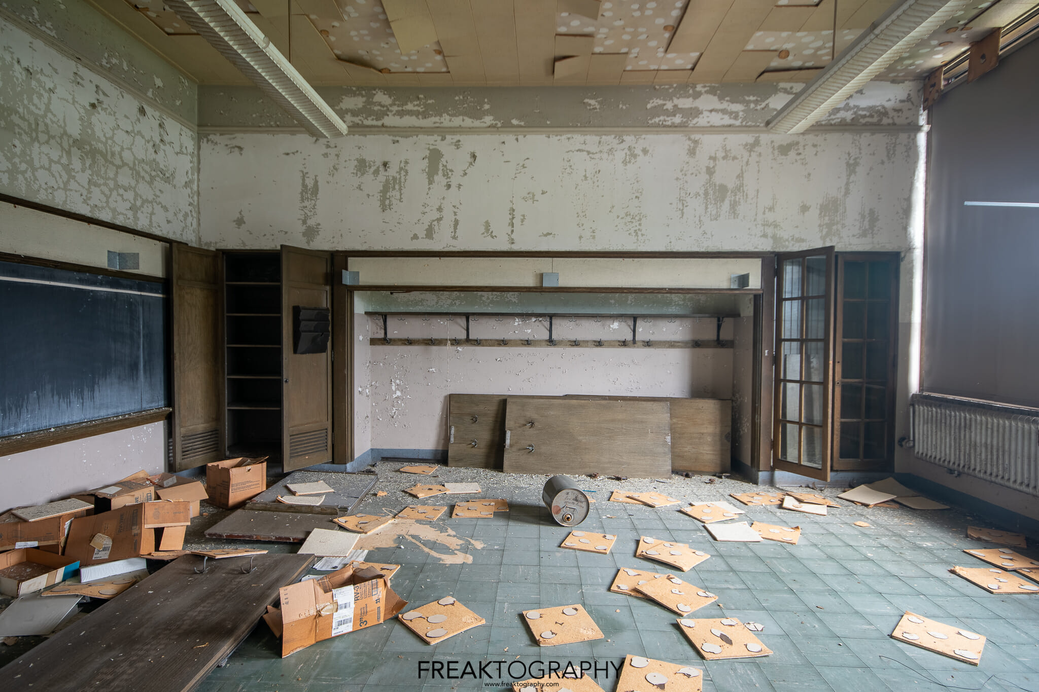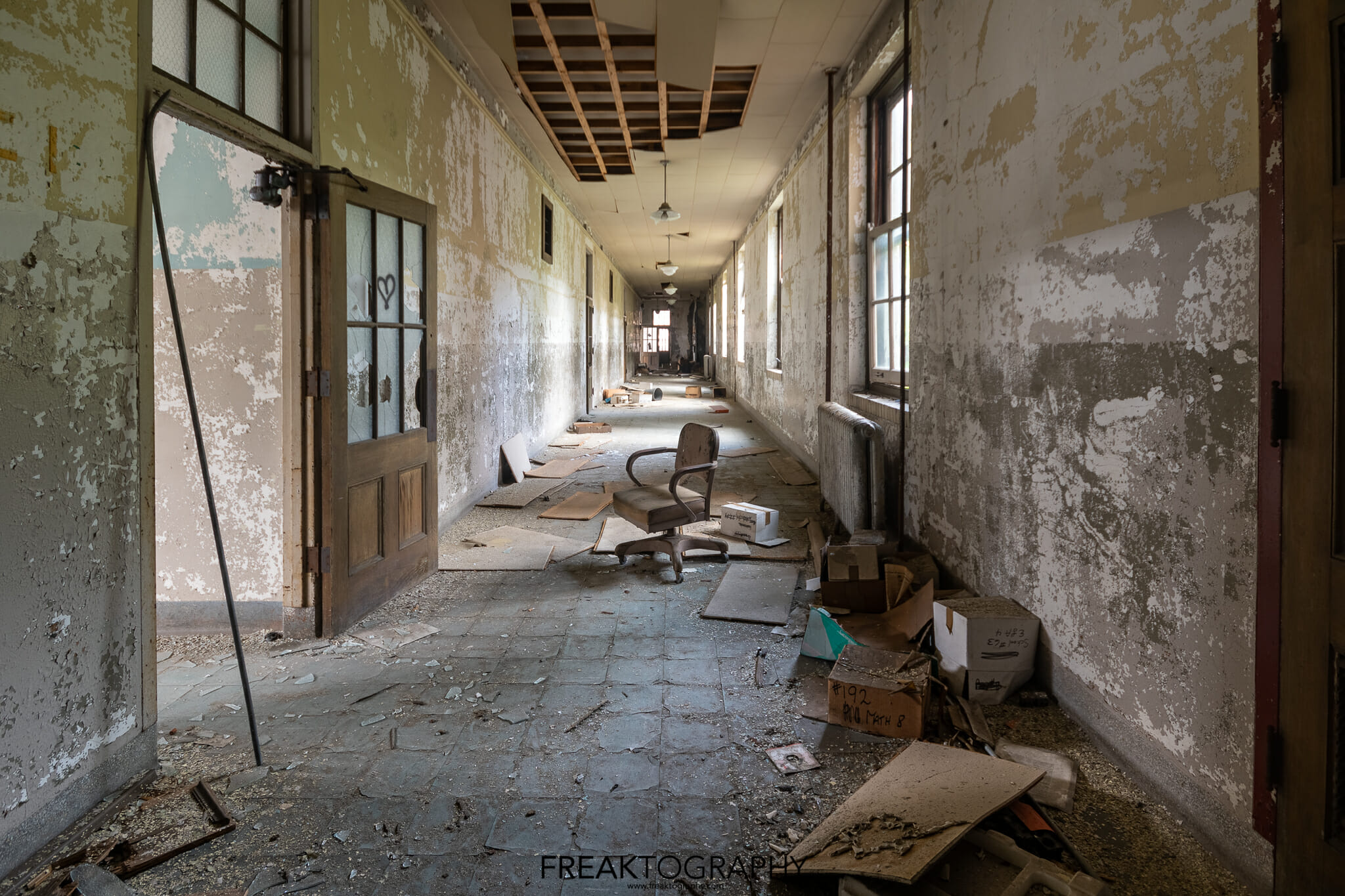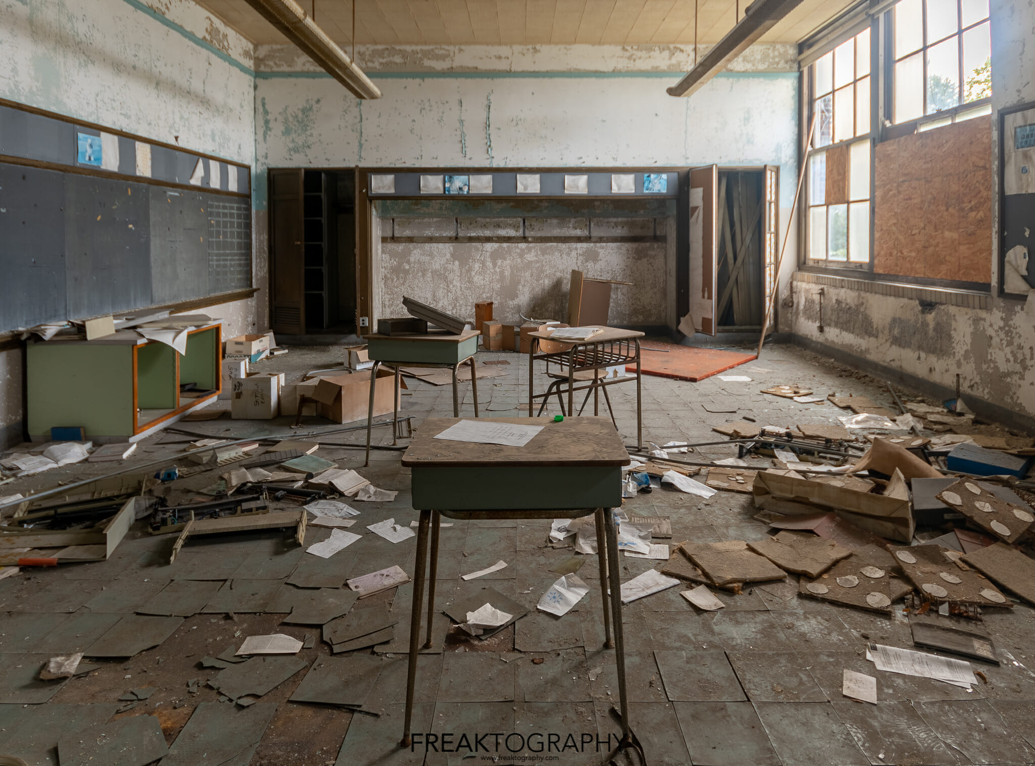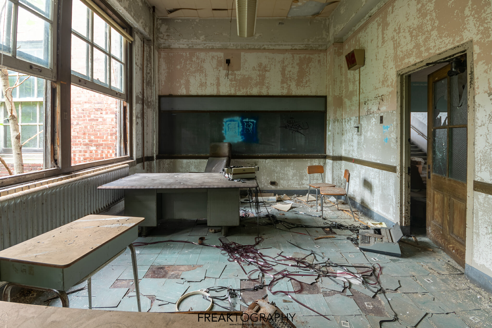 Inside was a smorgasbord of decay and textures, just what we love to see, the school is basically a big square with a courtyard in the middle and three floors. Many of the classrooms were the same as were the hallways, but the advanced decay inside was just what we needed!