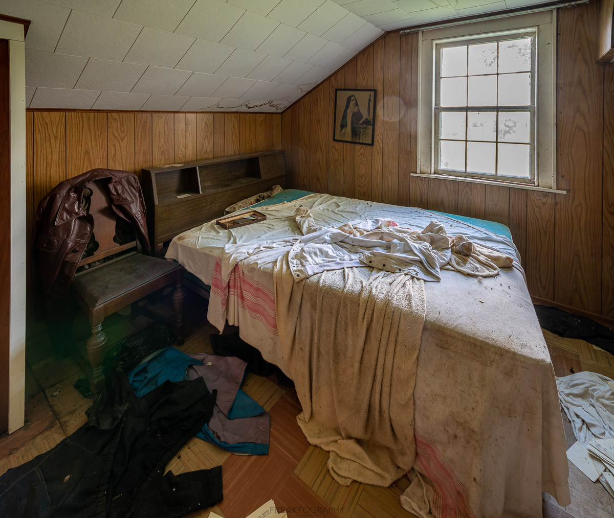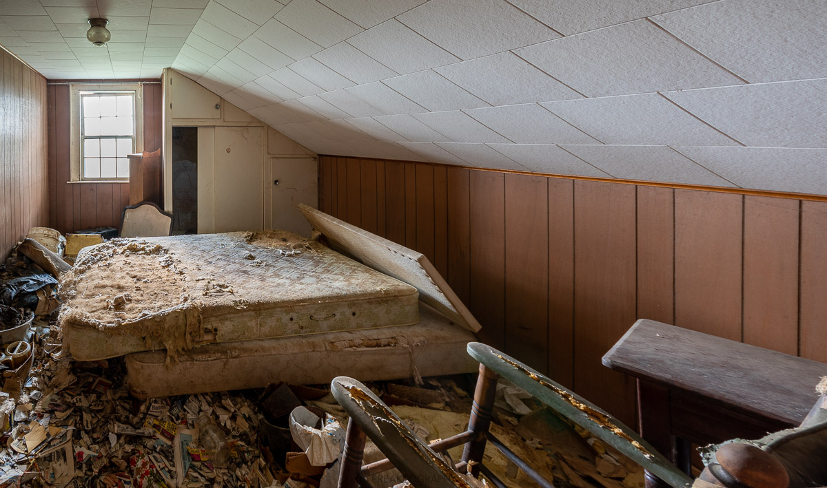 The living room and an upstairs bedroom are the best parts of the house, with a great deal of natural decay and enough interesting items to photograph.