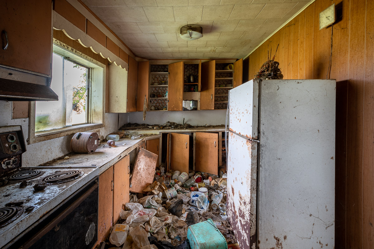 The house has been picked through and tossed with debris all over the floors, heavy water damage from holes in the roof made for some dangerous sections to walk across as well as navigating around piles of raccoon feces.