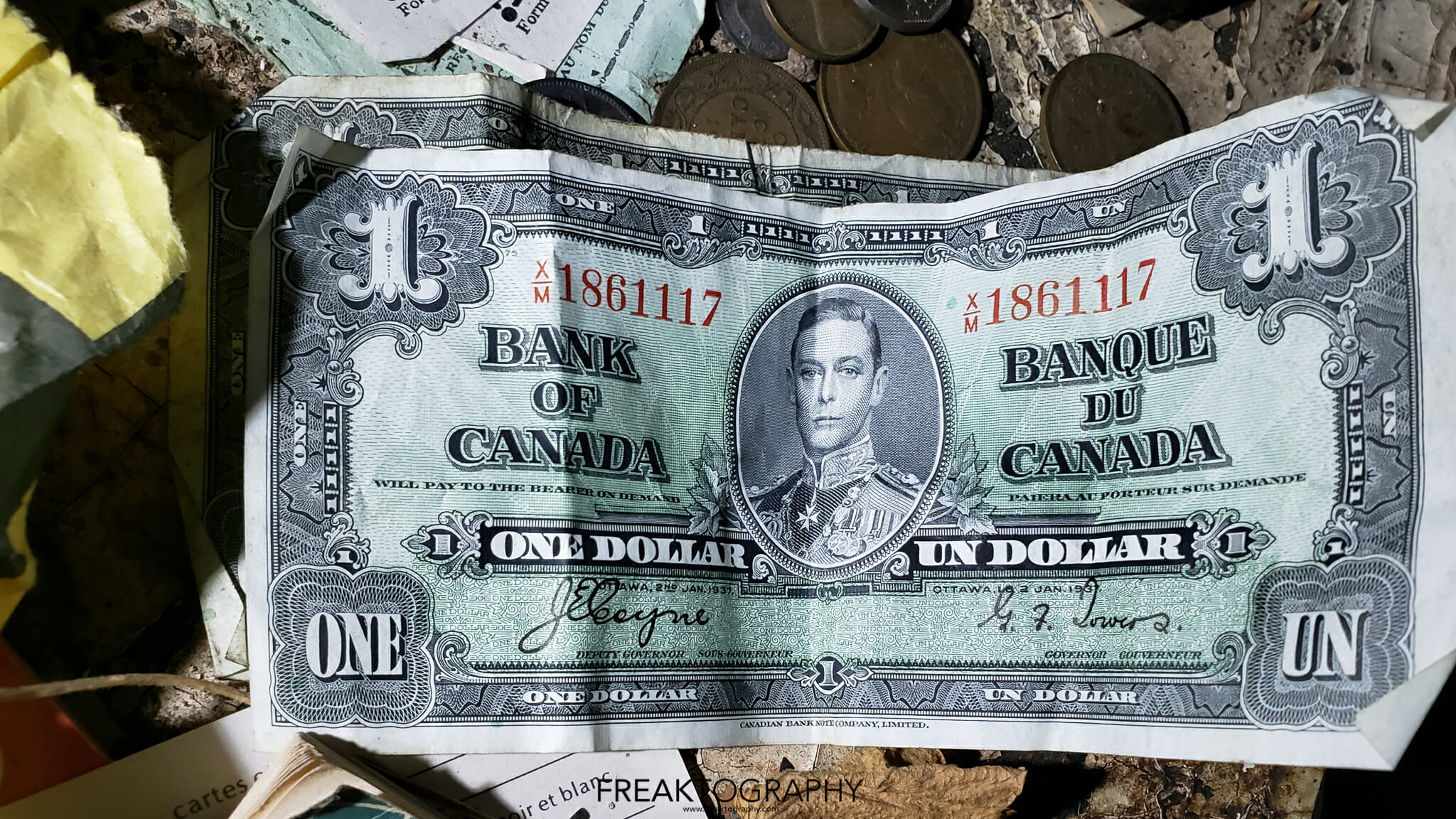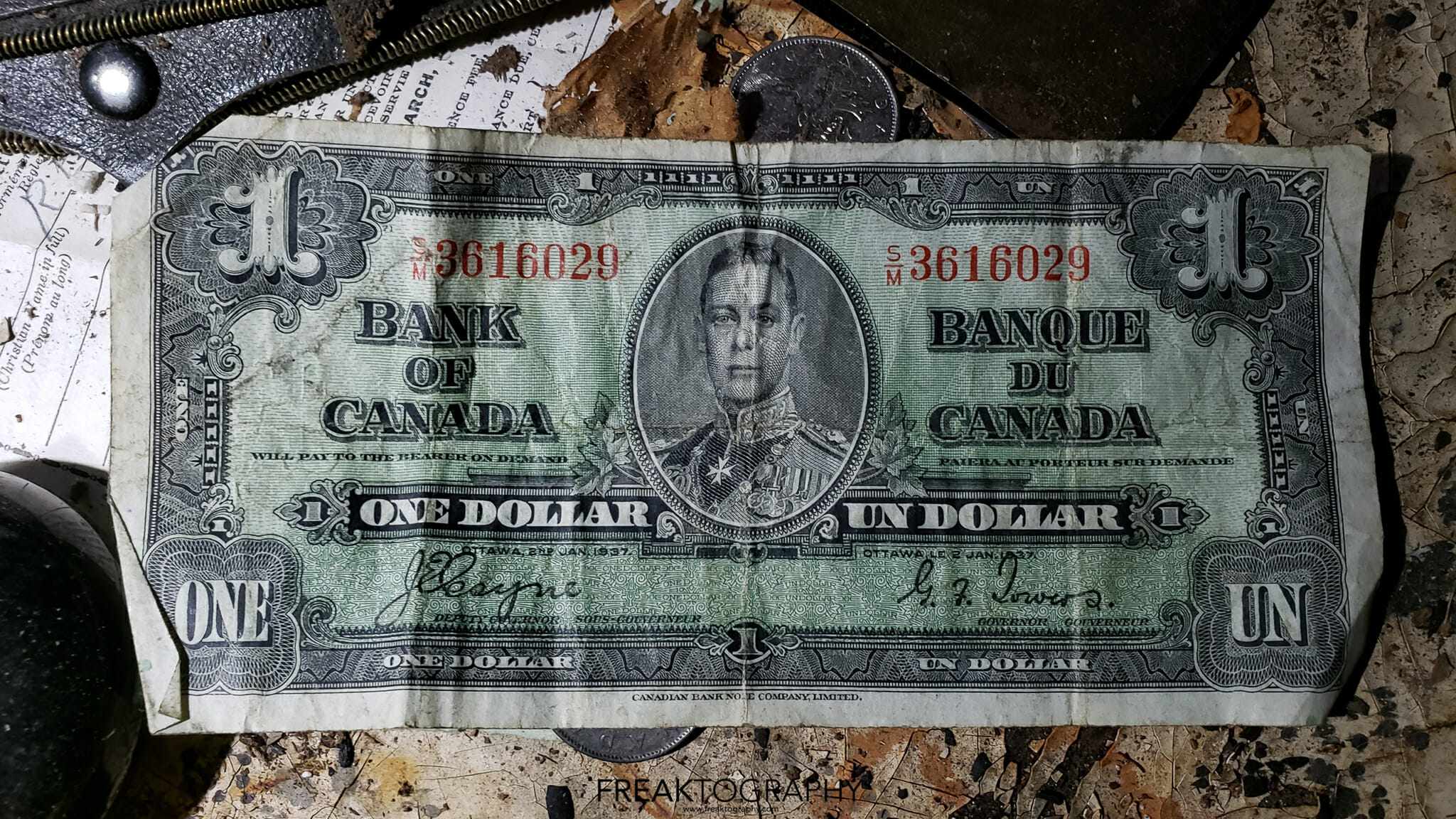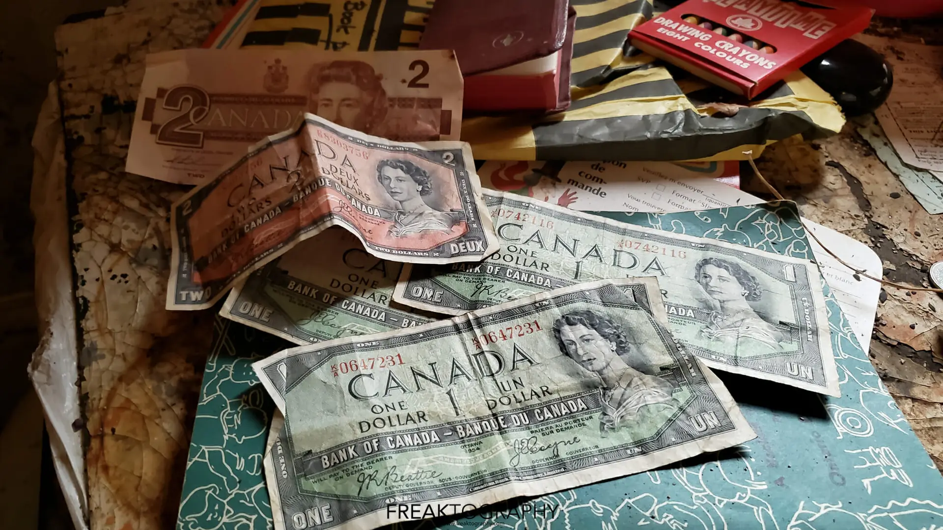 The old sewing machines always catch my eye, as well as record players but they are found al the time. What really caught my eye was the old bride and groom cake topper, the old trophies, the original Wizard of Oz book. But perhaps the most shocking was the old Canadian money, further research shows that these old bills of Queen Elizabeth can fetch some big money. The bills you see on the photos are called the “Devils Face” bills and they were out into circulation around 1954 and very quickly removed from circulation and replaced with an updated, non satanic version of the queens portrait. You can learn all about the 1954 Devils Face currency at this link.