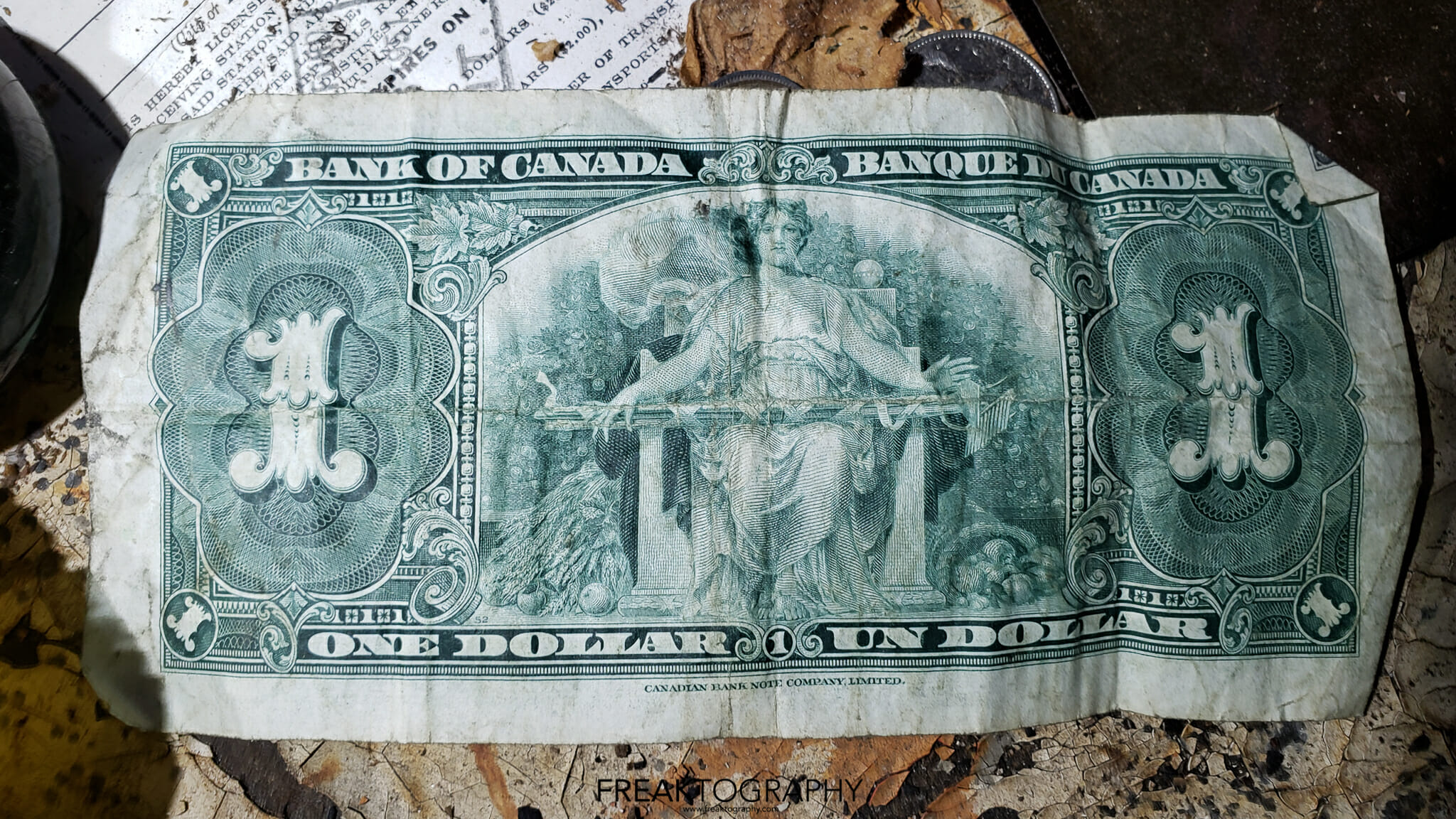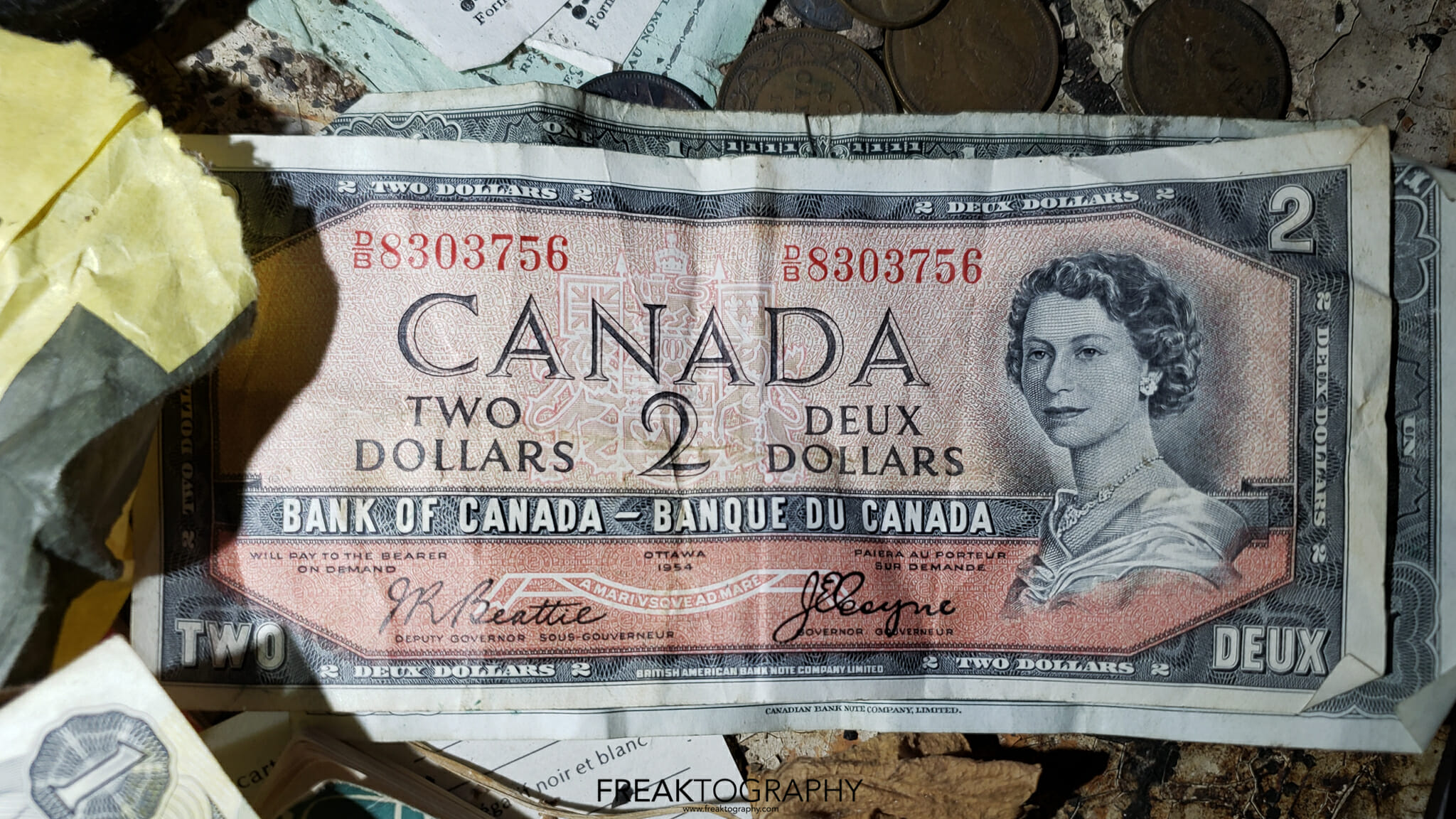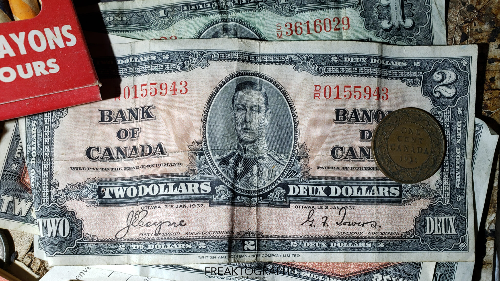 The old sewing machines always catch my eye, as well as record players but they are found al the time. What really caught my eye was the old bride and groom cake topper, the old trophies, the original Wizard of Oz book. But perhaps the most shocking was the old Canadian money, further research shows that these old bills of Queen Elizabeth can fetch some big money. The bills you see on the photos are called the “Devils Face” bills and they were out into circulation around 1954 and very quickly removed from circulation and replaced with an updated, non satanic version of the queens portrait. You can learn all about the 1954 Devils Face currency at this link.
