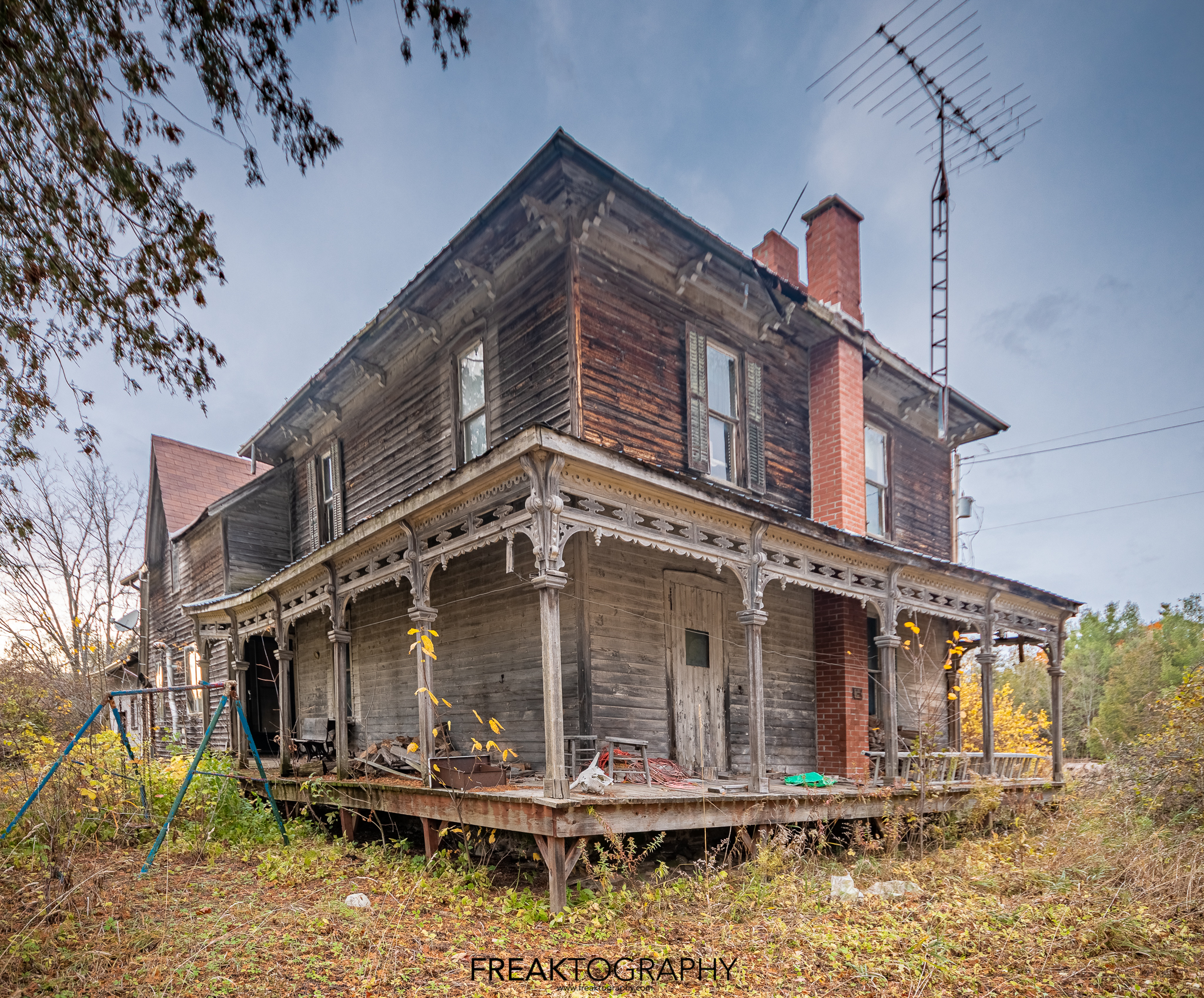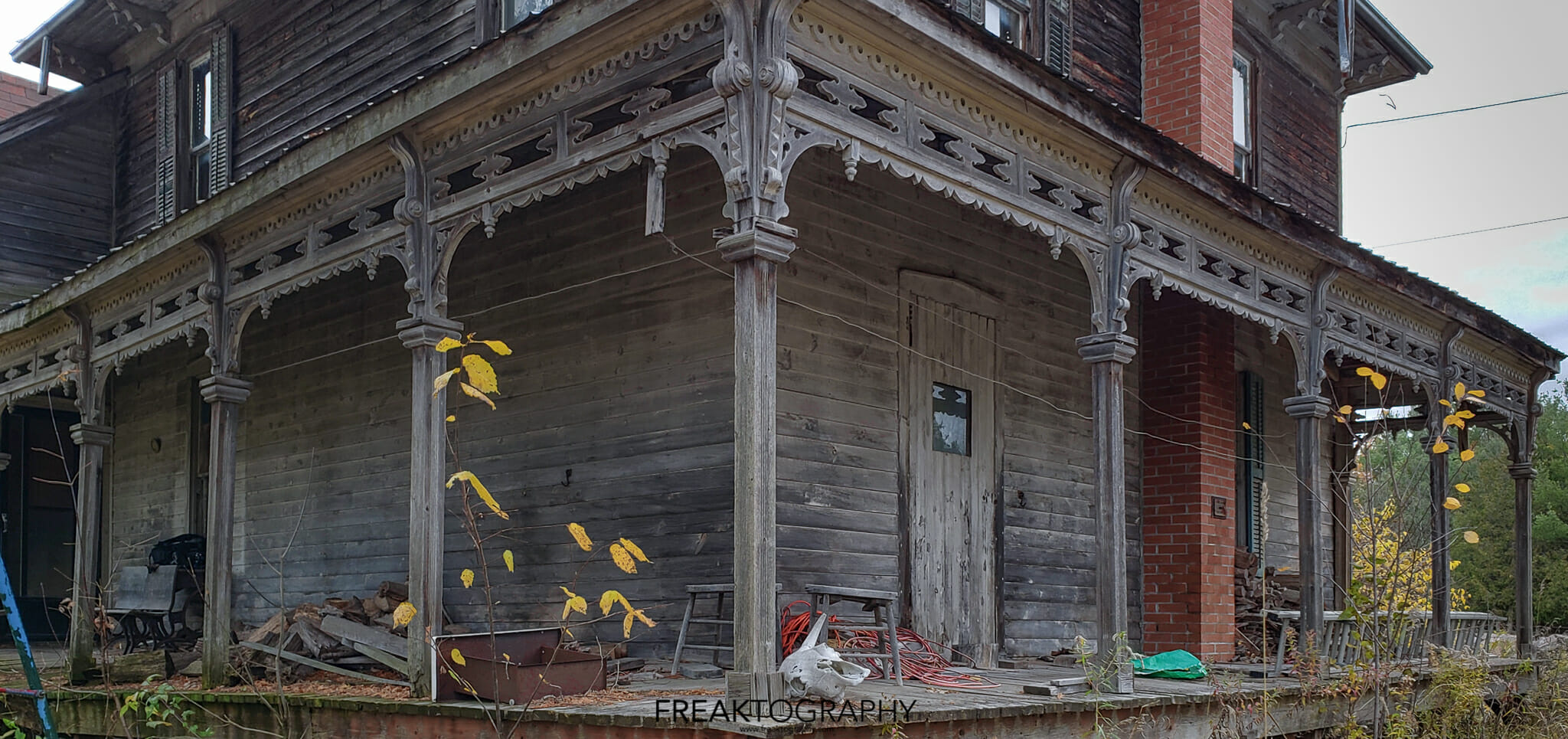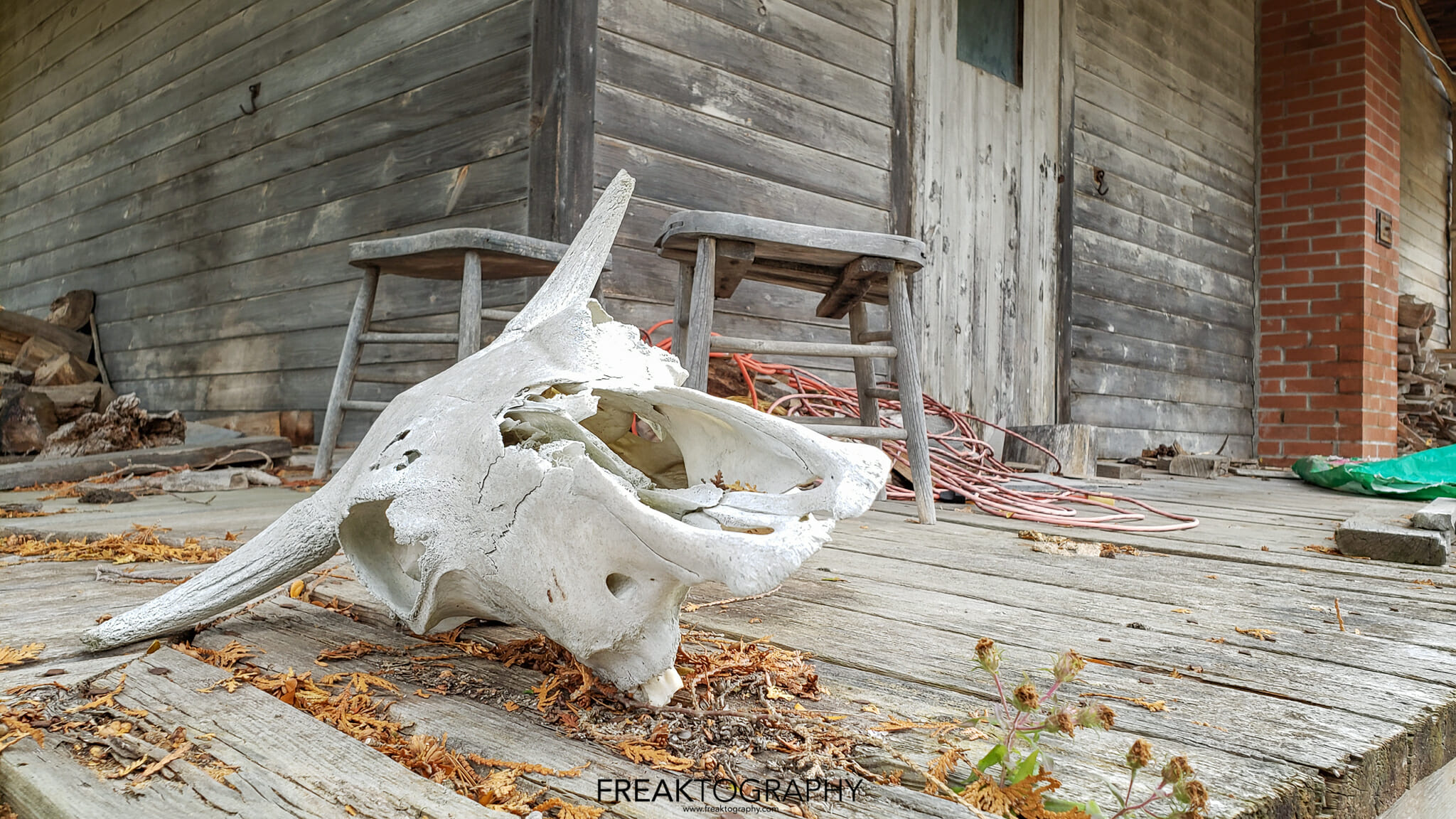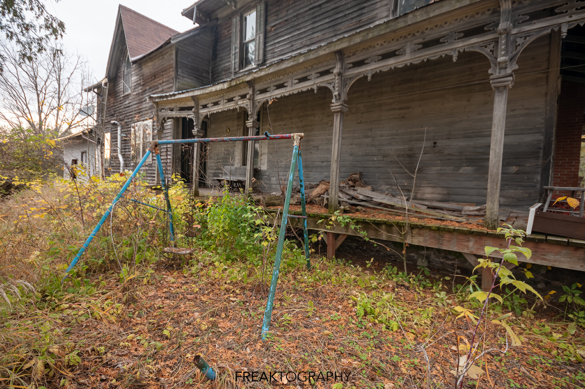 The wood on the exterior was faded, the house was surrounded by overgrowth, old dead cars, dead trees. The windows were faded, tattered curtains could be seen in the upstairs windows, there was a busted up kids swing set and see saw barely hanging on and lastly, there was an animal skull on the porch, a goat, complete with horns.