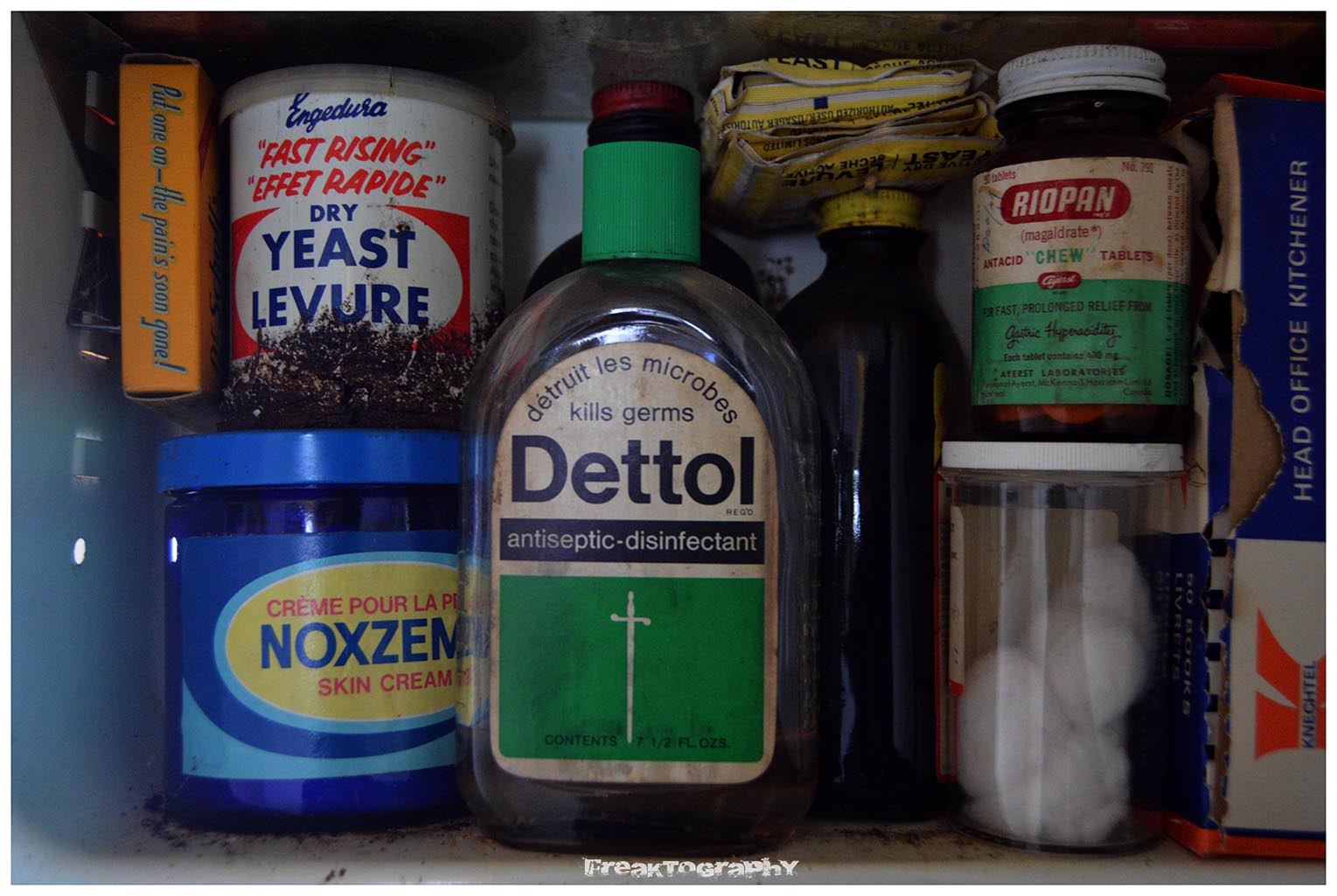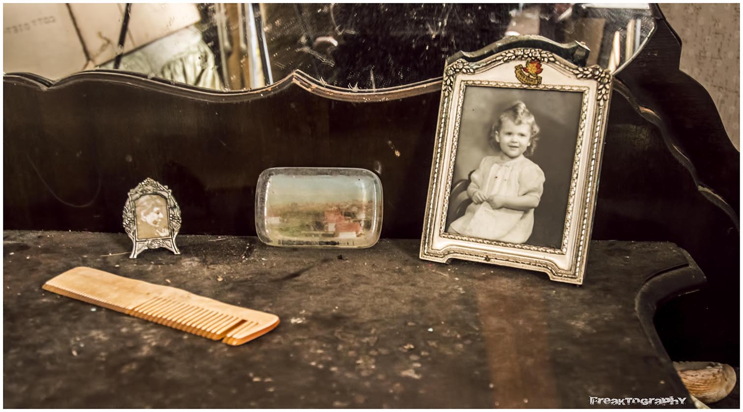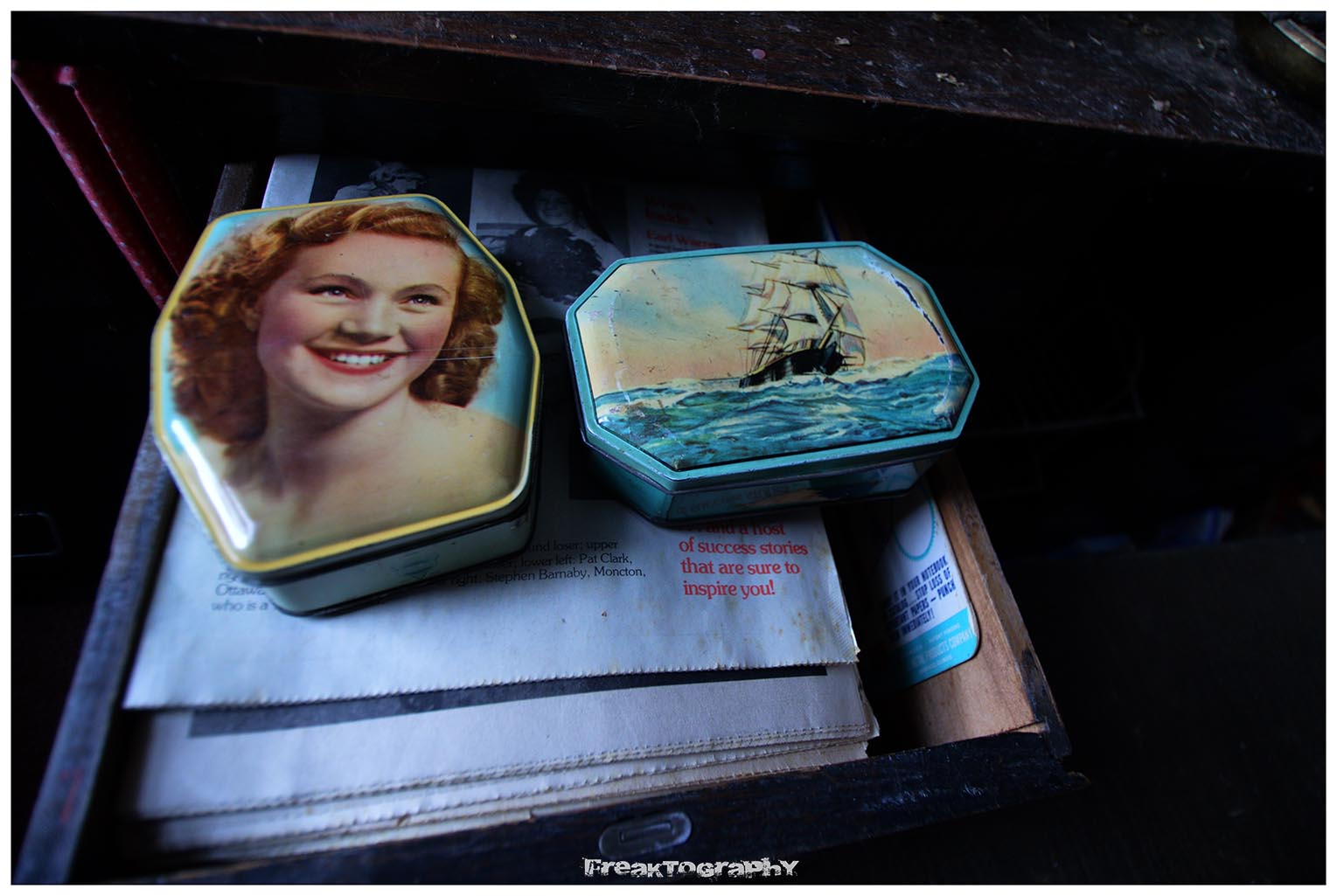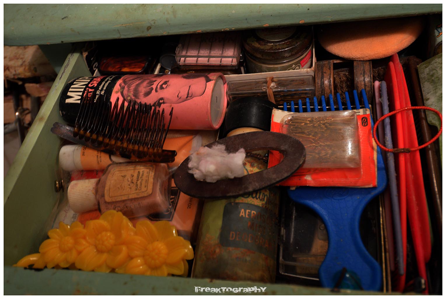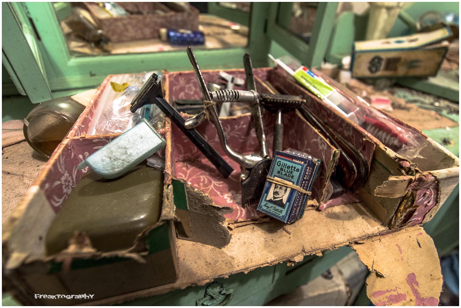 We each took turns getting shots of this before closing it and placing it back where we found it. Next it was another drawer, it took some elbow grease to open it – years of abandonment seem to make things stick – but again, I was not disappointed by what I found. Grandpa’s shaving kit, the stuff you only see in museums or old fashioned ads. Straight blade razors, Gillette Blue Blades, manual hair trimmers, old haggard looking toothbrushes, I don’t know why I was so fascinated by this stuff. I took out a few other items that I found interesting and set them up for a photo and then carefully placed everything back where I found it.
