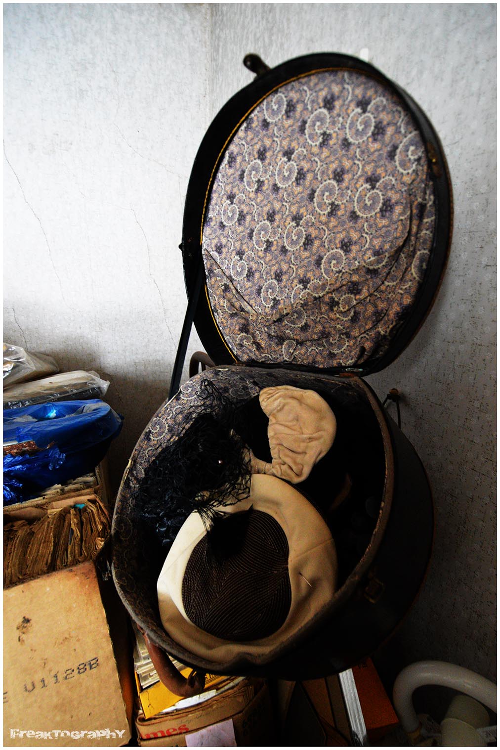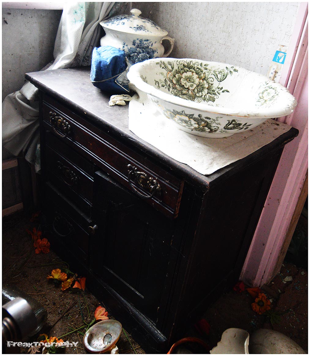 Also in this room was a hat box, full of fancy old fashioned lady hats, there were clothes and shoes and piles of personal items. In the dresser I found a number of old photo albums, I opened some but others I left – over time when things stay in one place, they become a part of that place so moving a photo album meant ruining that photo album. I did find a very interesting item inside a drawer that had been preserved in a plastic bag – it was a small book made of tree birch, inside were various lines handwritten accompanied by very very old photographs. Someone had taken great care to create this and preserve it so I placed it back in its bag and right back where I found it – silly me I didn’t even take a photo of it. Also in this room were jars of preserved peaches and other disgusting looking things – I was terrified to drop one and break it as the smell would have been awful! This room was nearly impossible to shoot as it was so rammed with stuff, so I did the best I could and moved along.