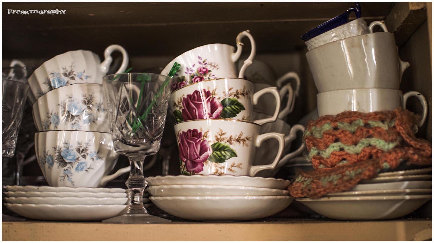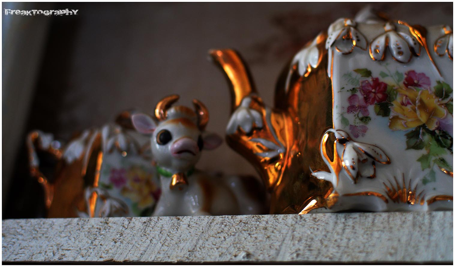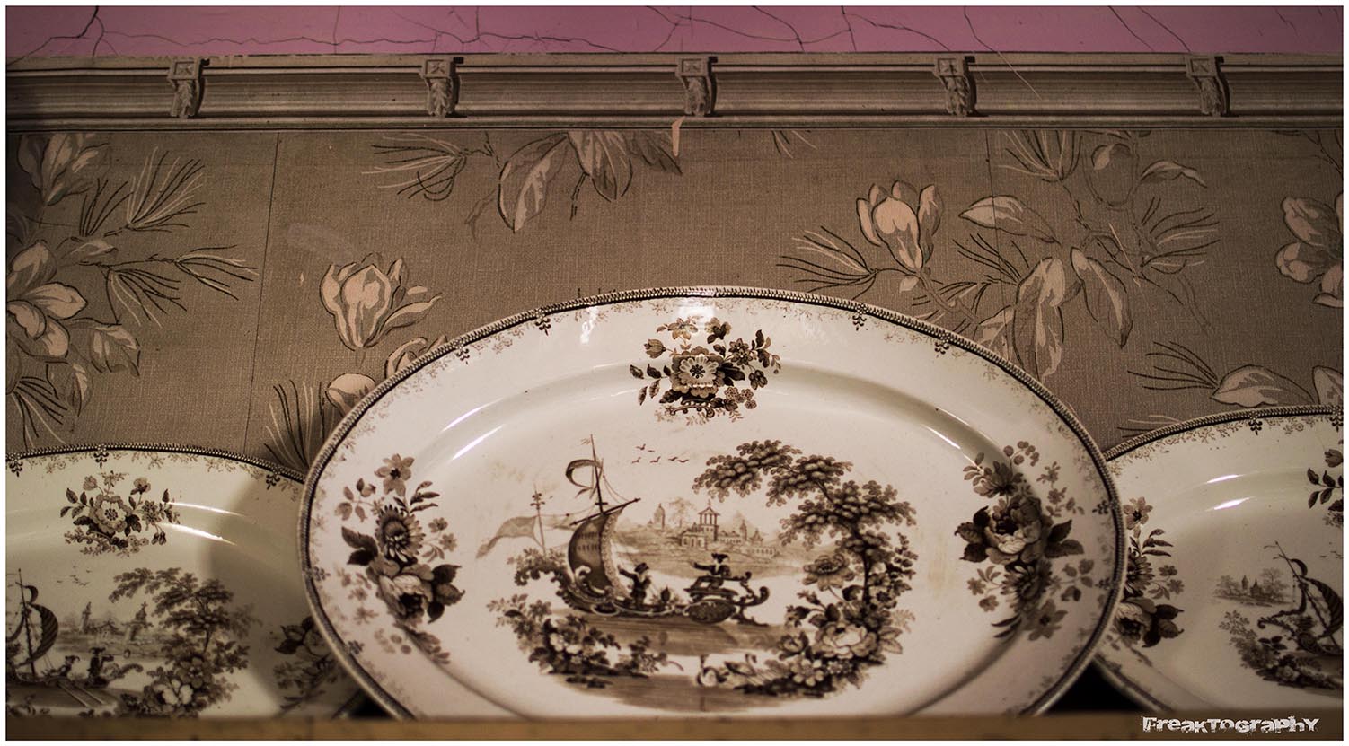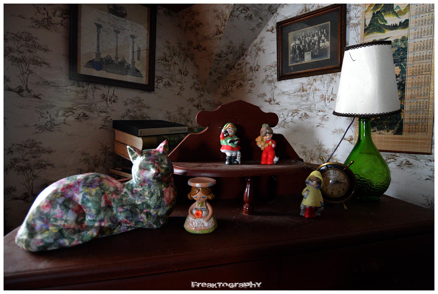 Downstairs, I switched to my 35mm lens that is great for capturing small details and close ups. I investigated a bit more into the china cabinet and admired the silver platters and teapots in there and I had a closer look at the silverware on the hutch, this stuff was immaculate! I went to the wall mounted cabinet in the kitchen and checked out her cow and gnome themed salt and pepper shakers.
