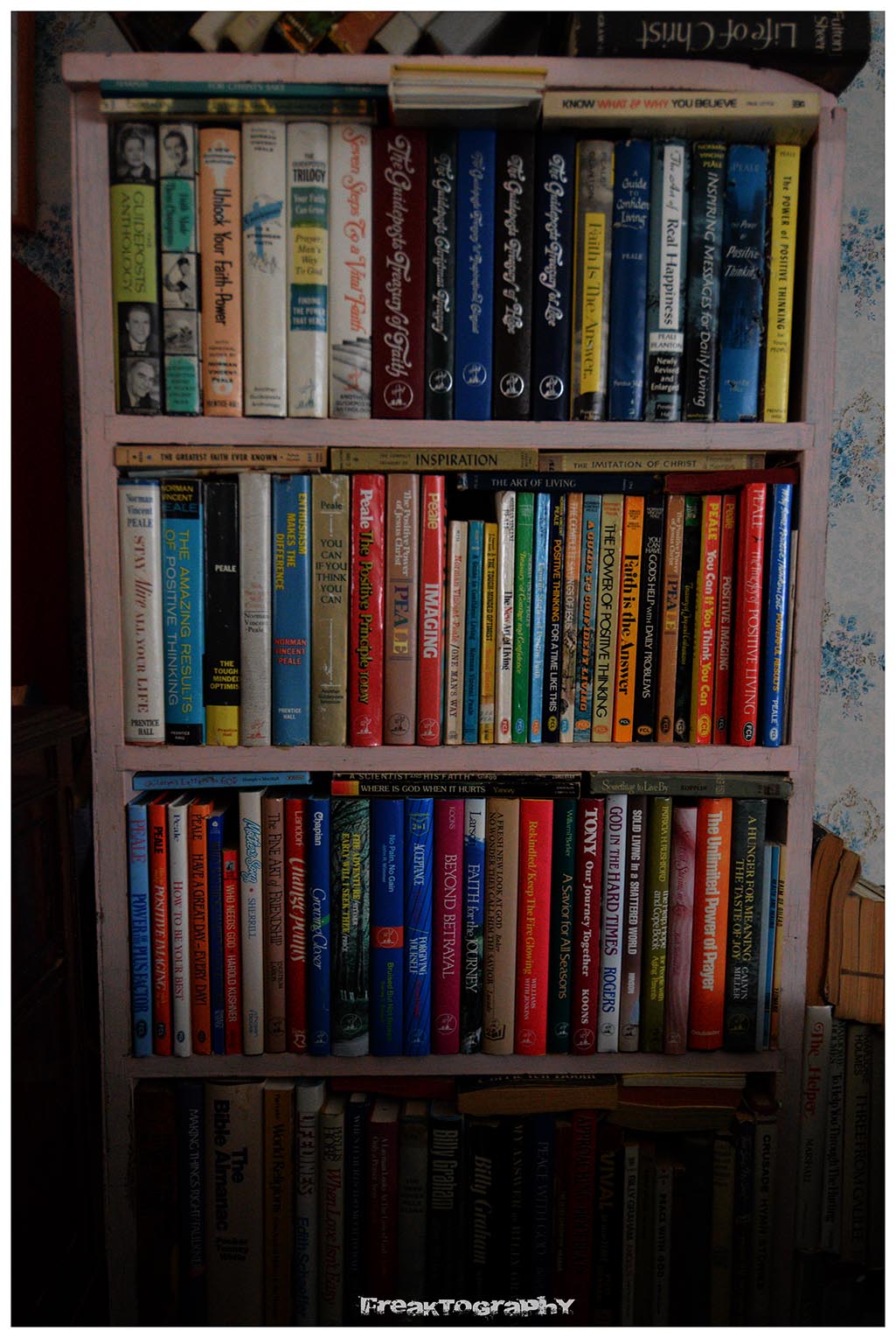 Books – did I mention books? Each room in this upstairs is full of books, books on addiction – alcohol and drugs, books about Jesus, books about God, books about religion…more books about Jesus. Books about death and how to cope, books about faith, books about coping, books about positive thinking. Novels, poem books, song books, Bill Cosby’s book, a book by George Burns, books about science, entire encyclopedia series, books about war, books about peace……and magazines, and then even more newspapers.