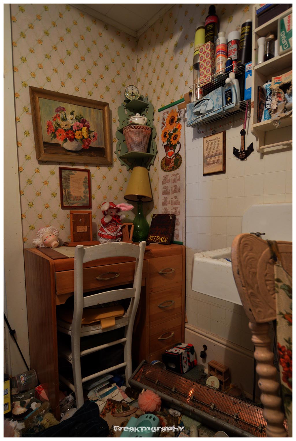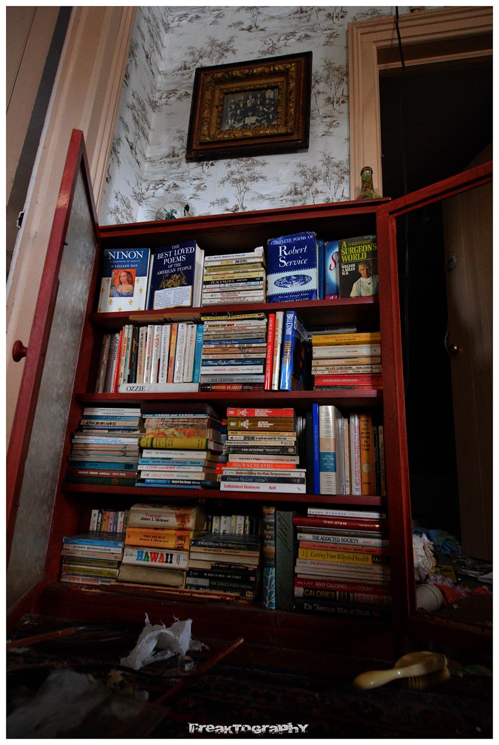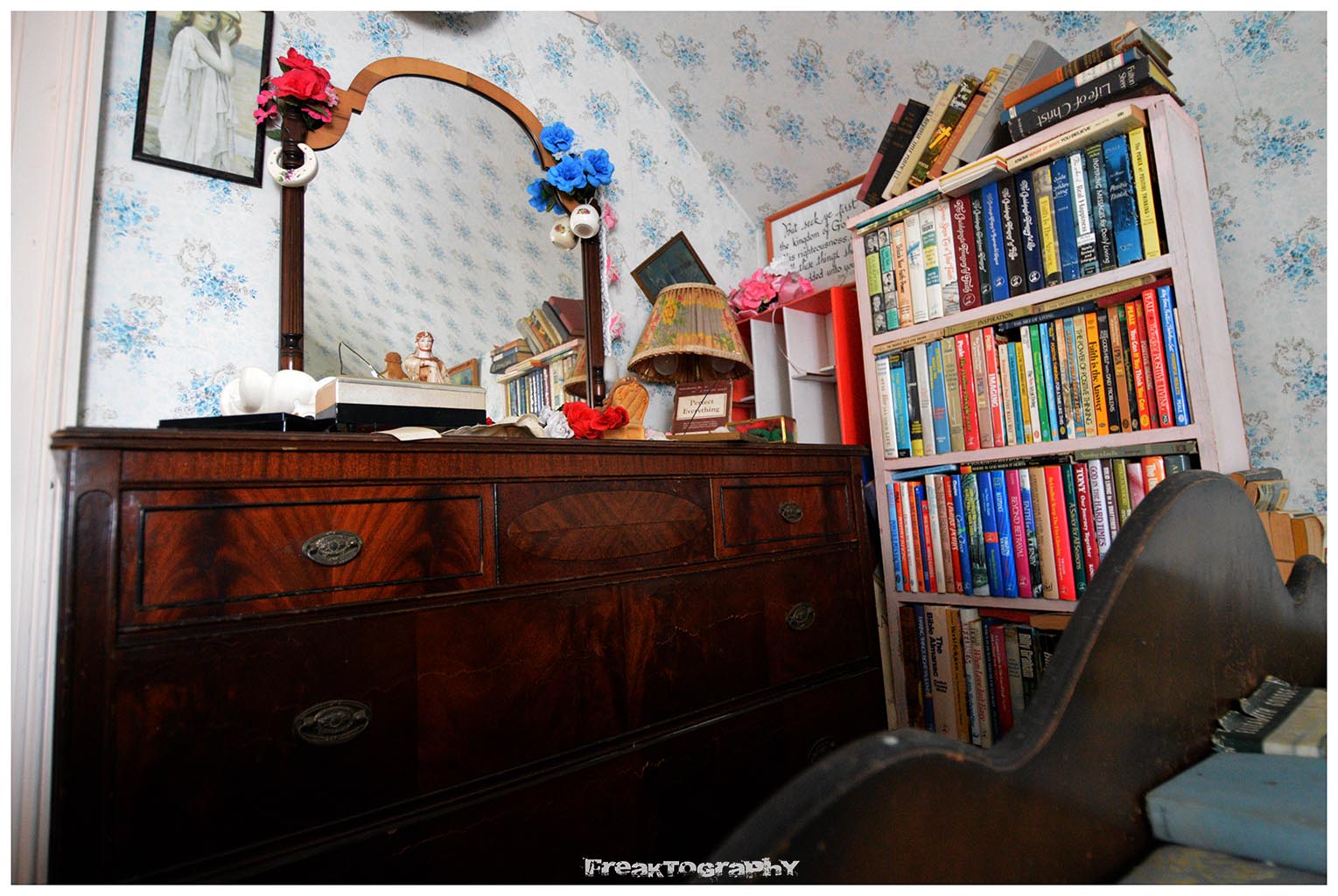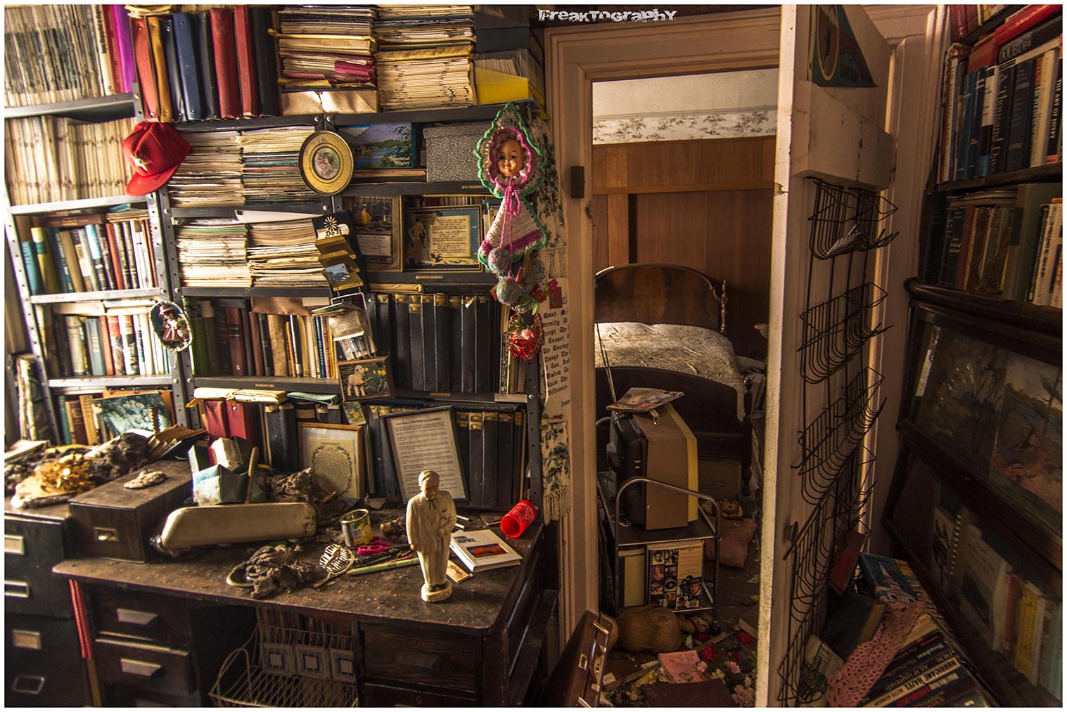 The last room to see was a bedroom that looks more like a library, I had to step over mountains of raccoon feces and piles of junk to get in, the scene once in is truly overwhelming. Books stacked every which way, on every wall in every nook and cranny possible.