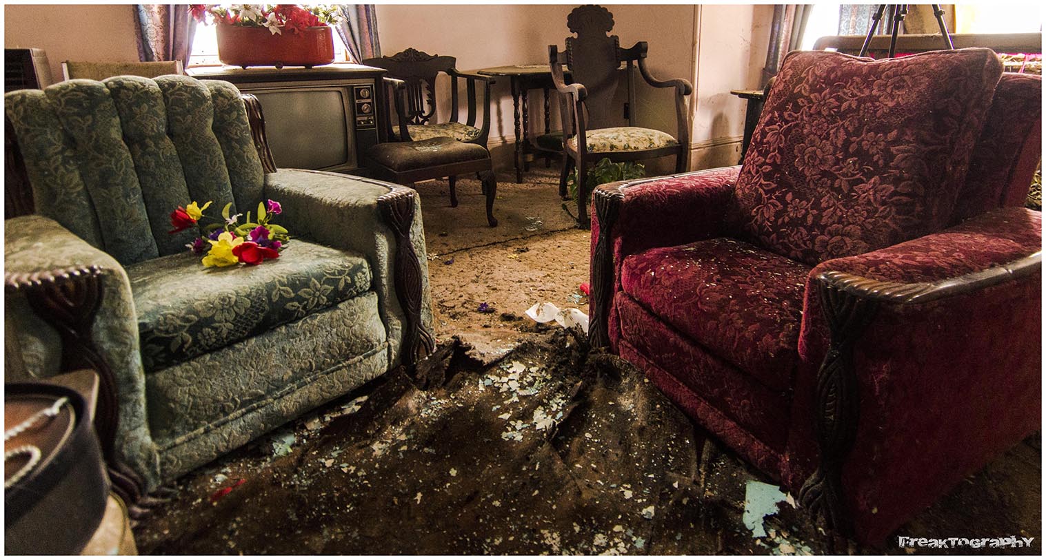A red couch and two plush chairs were the main pieces of furniture, along with a very heavy wooden table and chair set in a corner. As with the other room, this room also has a bay window with (what once was) a very nice and comfortable wood frame couch. This room has the worst decay in the house; a hole in the roof was providing some much needed fresh air and was allowing a light sprinkling of snow to lightly fall in.