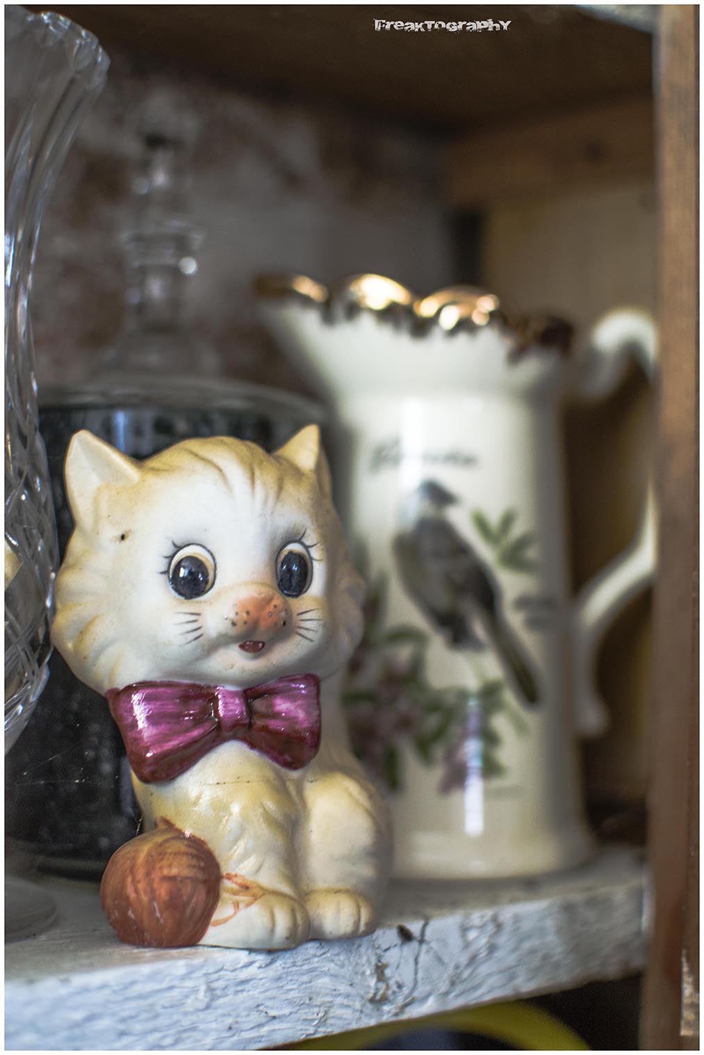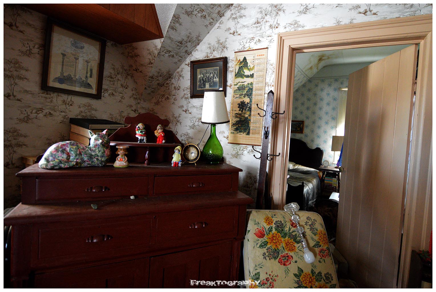 There was a door that leads to a small hallway to head upstairs, but behind that door I noticed something, some kind of a wall mounted china cabinet. This china cabinet was full of perfectly placed ceramic cats, china tea cups, glassware, decorative teapots and salt & pepper shakers, these were obviously some cherished items and they were just as they had been in the days of this homes life. I would take a mental note to come back and shoot these details with my 35mm lens, right now I’m focusing on the rooms as a whole, the fine details can be shot once I have taken all this in.