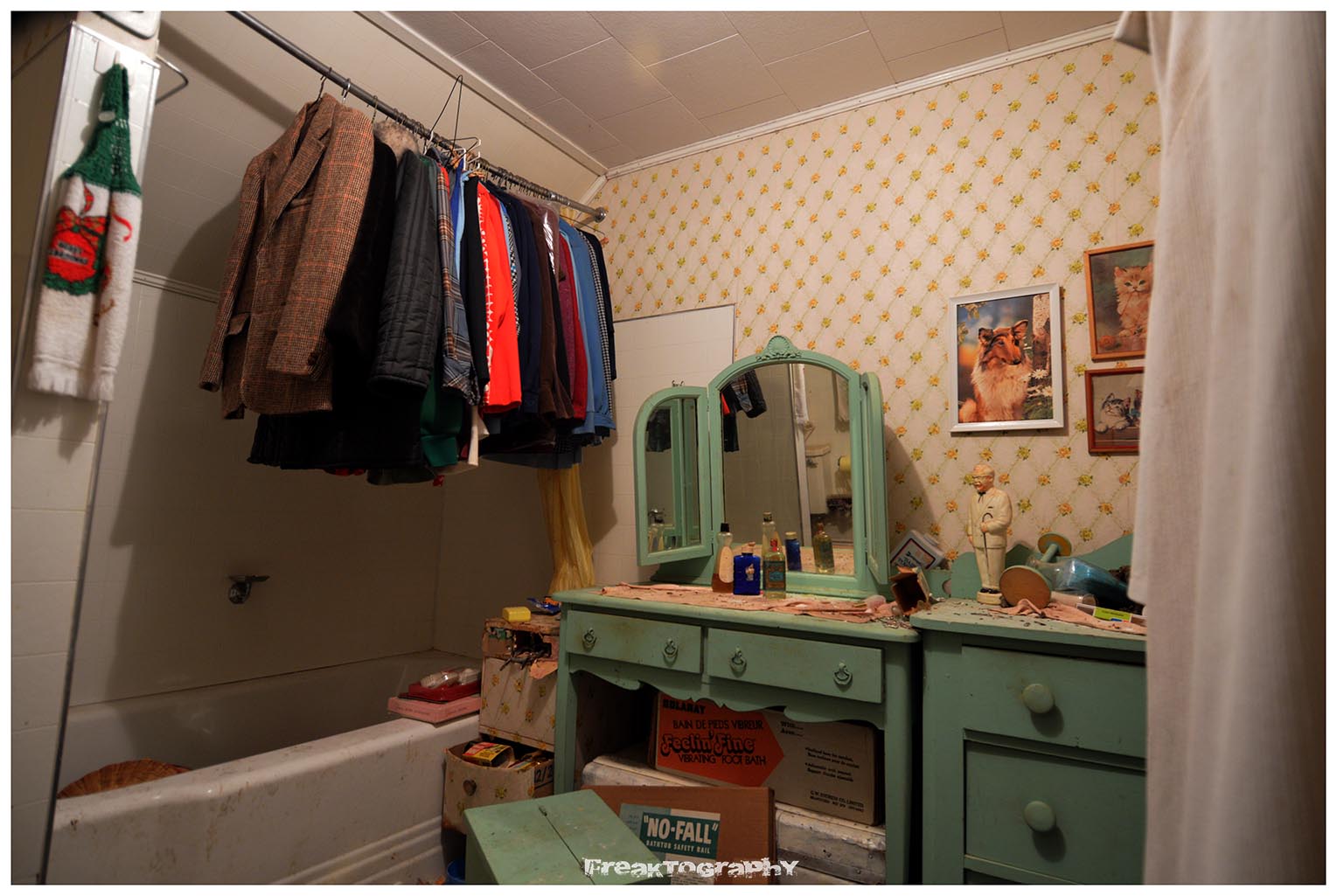The bathroom was probably the most interesting room upstairs, at first I wasn’t going to shoot it because it was too dark and there was no source of natural light – at a glance it was just a mess, a pile of clothes in the bathtub, piles of junk on the floor and a bunch of old clothes hanging from the curtain rod – nothing of any interest.