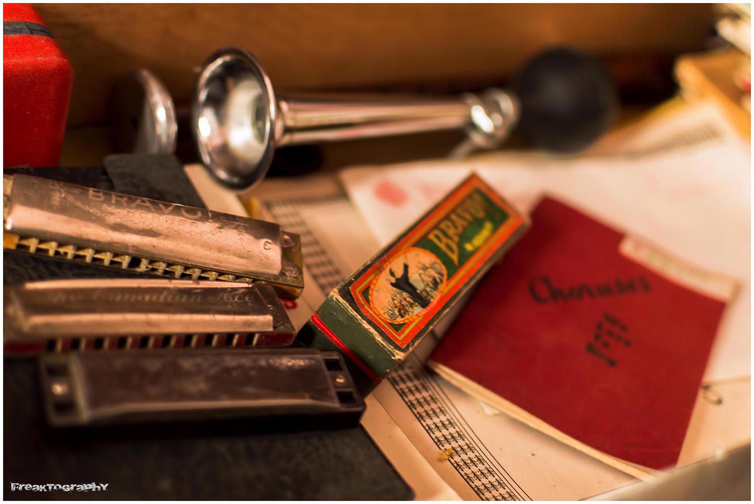 A musical time capsule, untouched, no dust exactly as it was meant to be. I immediately noticed the bright shiny horn, beside that was a wooden recorder, surrounded by books of sheet music, atop the sheet music were three small silver harmonicas. In the corner was a red plastic case, curiously I lifted the case – it was heavy. I opened it to find an immaculate silver harmonica – I had never seen one this big before. They must have had a great time in this house playing music, between the guitar, piano, recorder, harmonicas and the record players and 8 tracks, music was obviously a huge part of this family’s life.