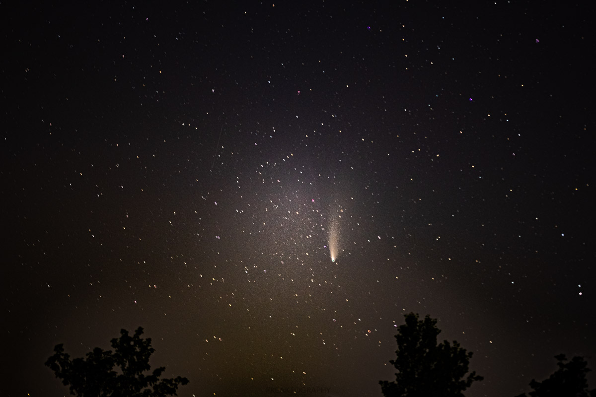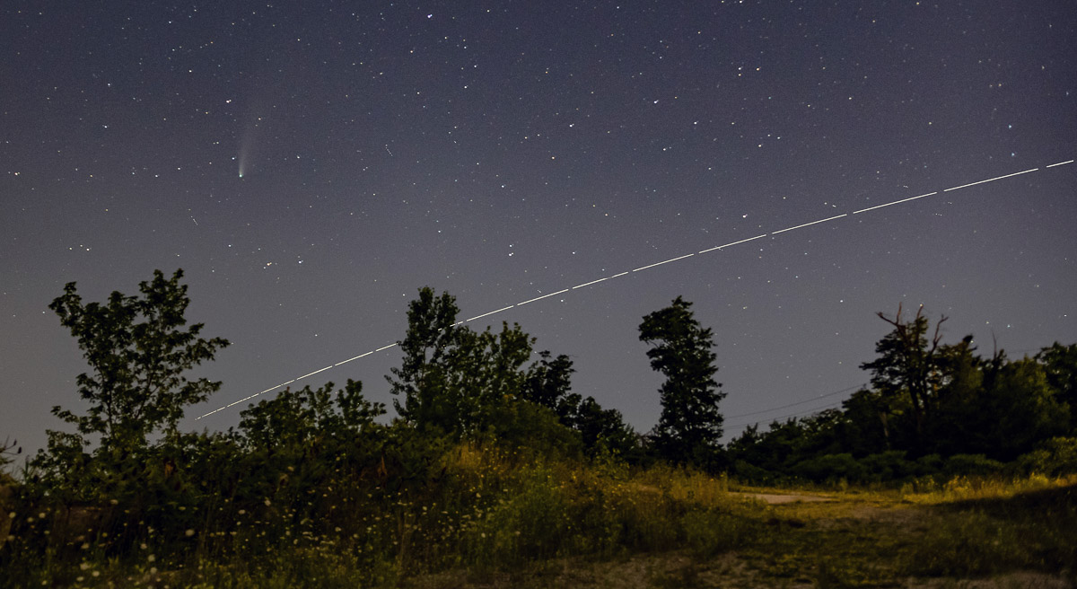 I had just enough time to set my composition and my settings when I spotted the ISS coming on the horizon. The photo below had to be done as a composite by selecting the trail of the ISS from 17 photos, shot at 10 seconds each and merged to make the ISS trail, then I added that layer onto my photo of the comet.