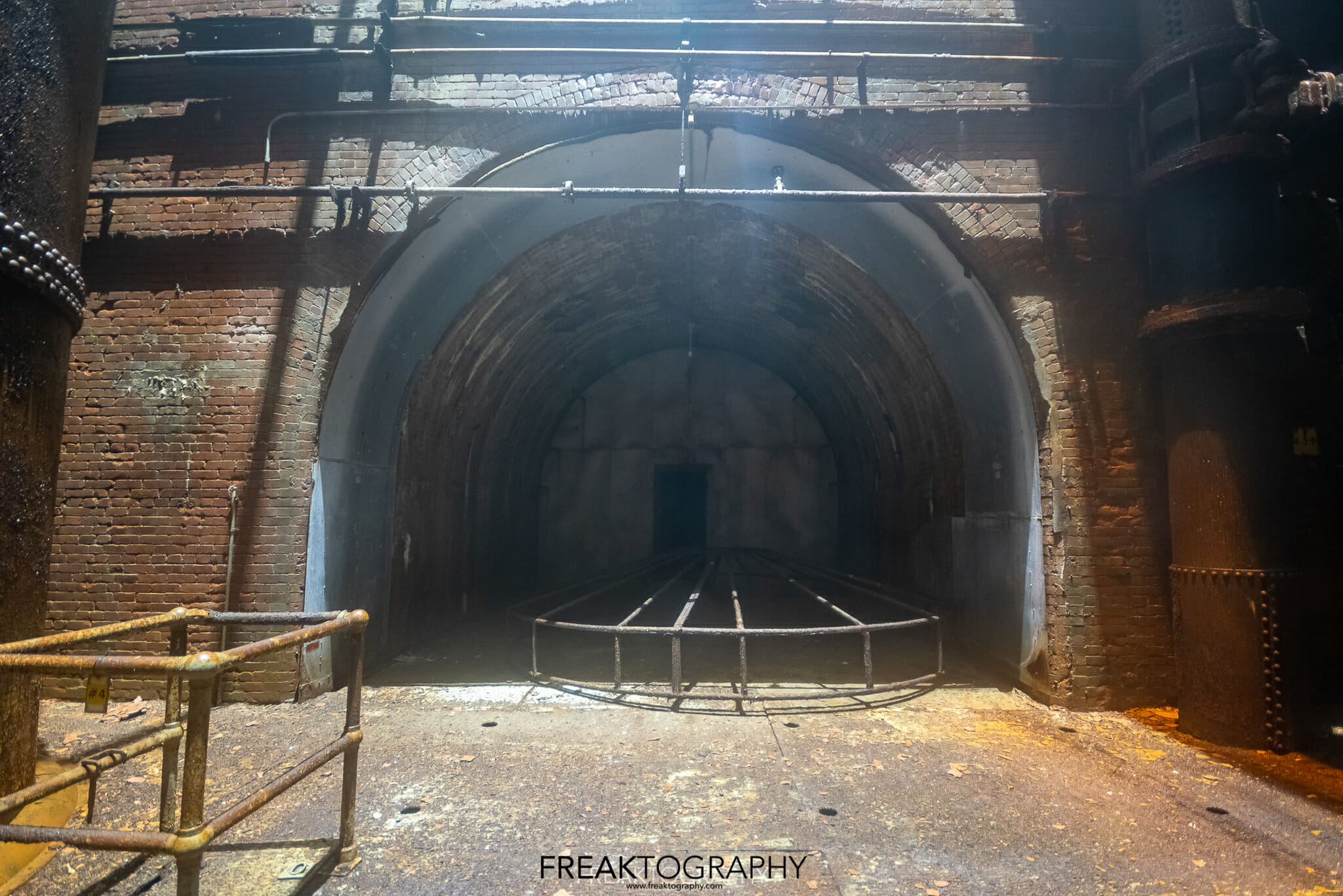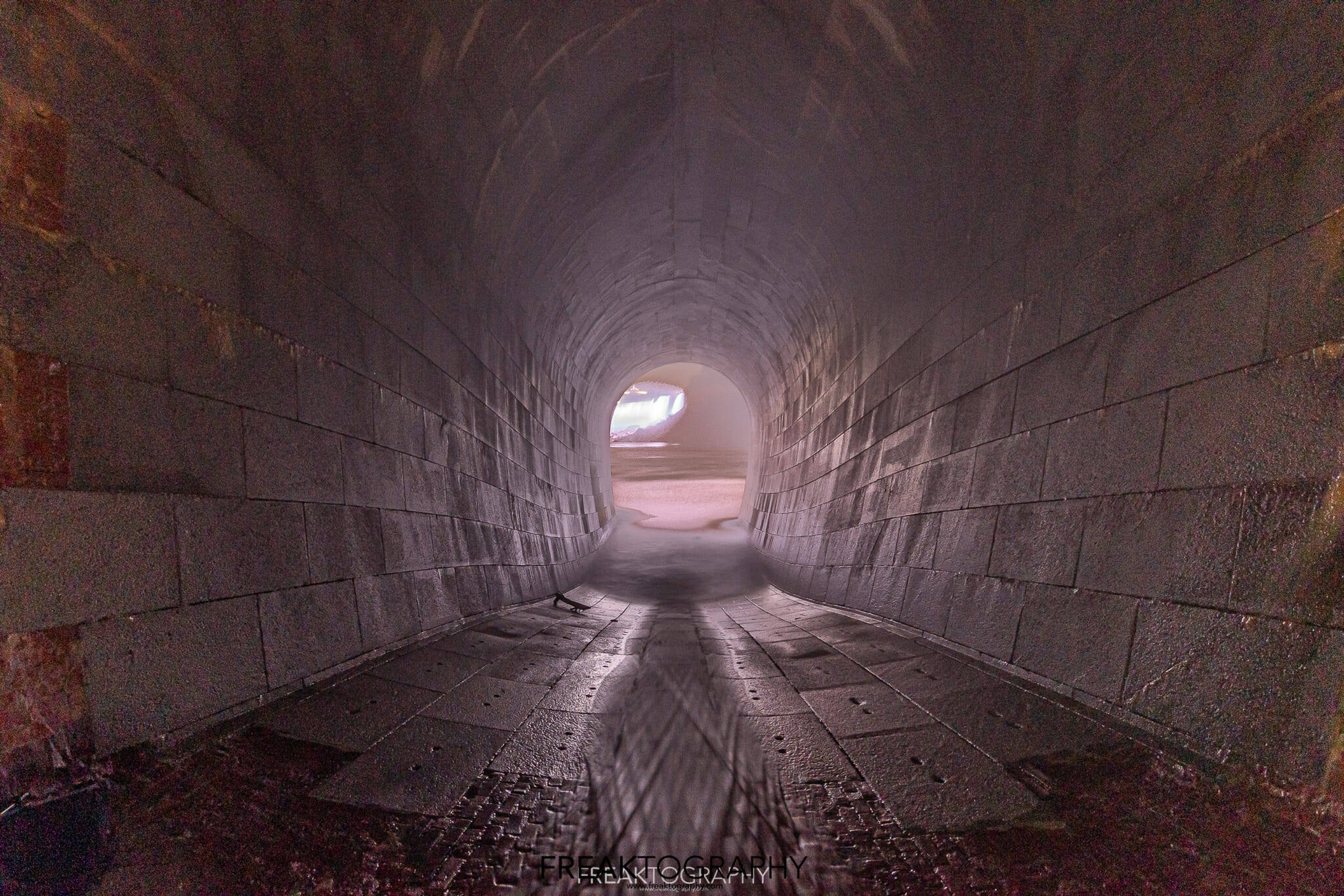 I touch bottom, I am now at the beginning of a 2,200 foot long underground tunnel, I now stand at the brick lined base of an elongated arch at 18.8 feet wide and 25 feet tall and I now have to walk 2,000 feet to my final destination..it is pitch black and it is very misty.