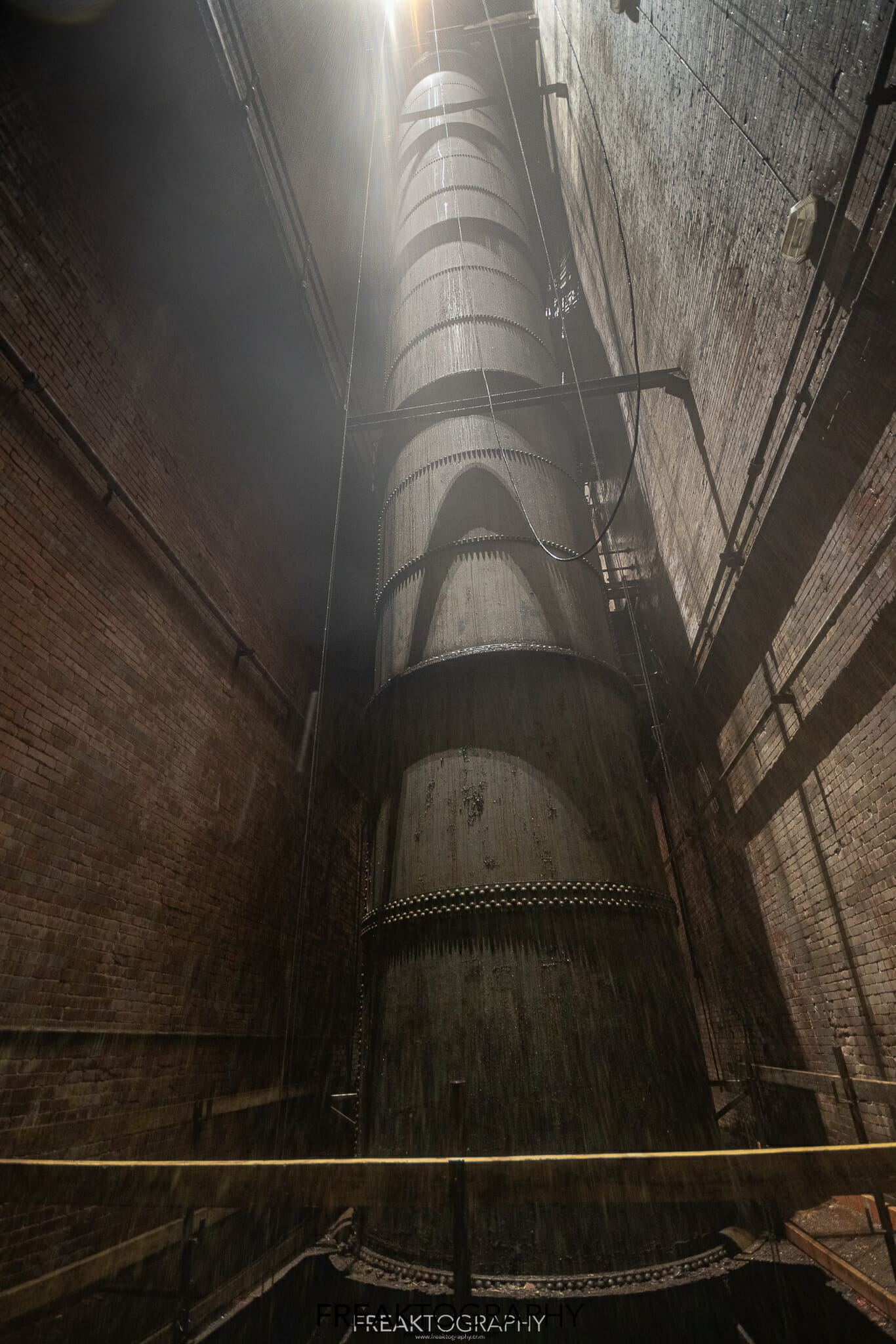 The thrust deck was well lit and fairly clean, but now it’s time to descend a number of ladders that zig zag their way down through the various levels of the wheel pit from the brake deck to the upper guide bearing deck, down more levels to the lower guide bearing deck, finally to the turbine deck and a terrifying climb down into the tailrace. With every level down the air grew cooler, there was mist everywhere, mist that has eaten away at the metal over years and years. The thick layers of rust were all over me, my gloves were brown and wet, my jeans were caked with rust and my face was soaked from the constant mist.