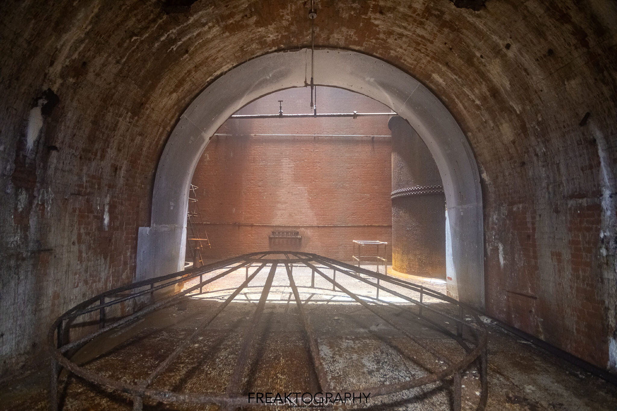 I navigated a handful of stairs that each went down one level, but these only ever went down to storage rooms, tool rooms, locker rooms or the power distribution tunnels. Finally, I had found what I was looking for, a set or stairs, surrounded by flimsy orange “fencing” that had clearly been moved and stepped on. Down I went, one right turn and down one other set of stairs and I was now directly beneath the turbine hall in what is known as the Thrust Deck. The thrust deck, just below the generators, features a beautiful arched ceiling which is built to support the immense weight of the generators above. The thrust deck contains large round metal containers which are thrust bearings that hold the turbine shafts in alignment.