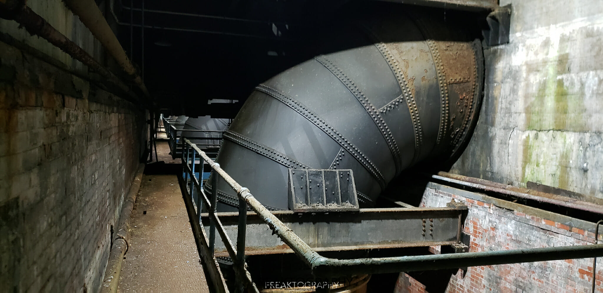 The next level below the thrust deck is the brake deck, what I loved about the brake deck is this is where the penstocks curve to a 90 degree angle and drop water straight down to spin the turbines. As far as you can see there are massive curved pipes, all perfectly aligned.