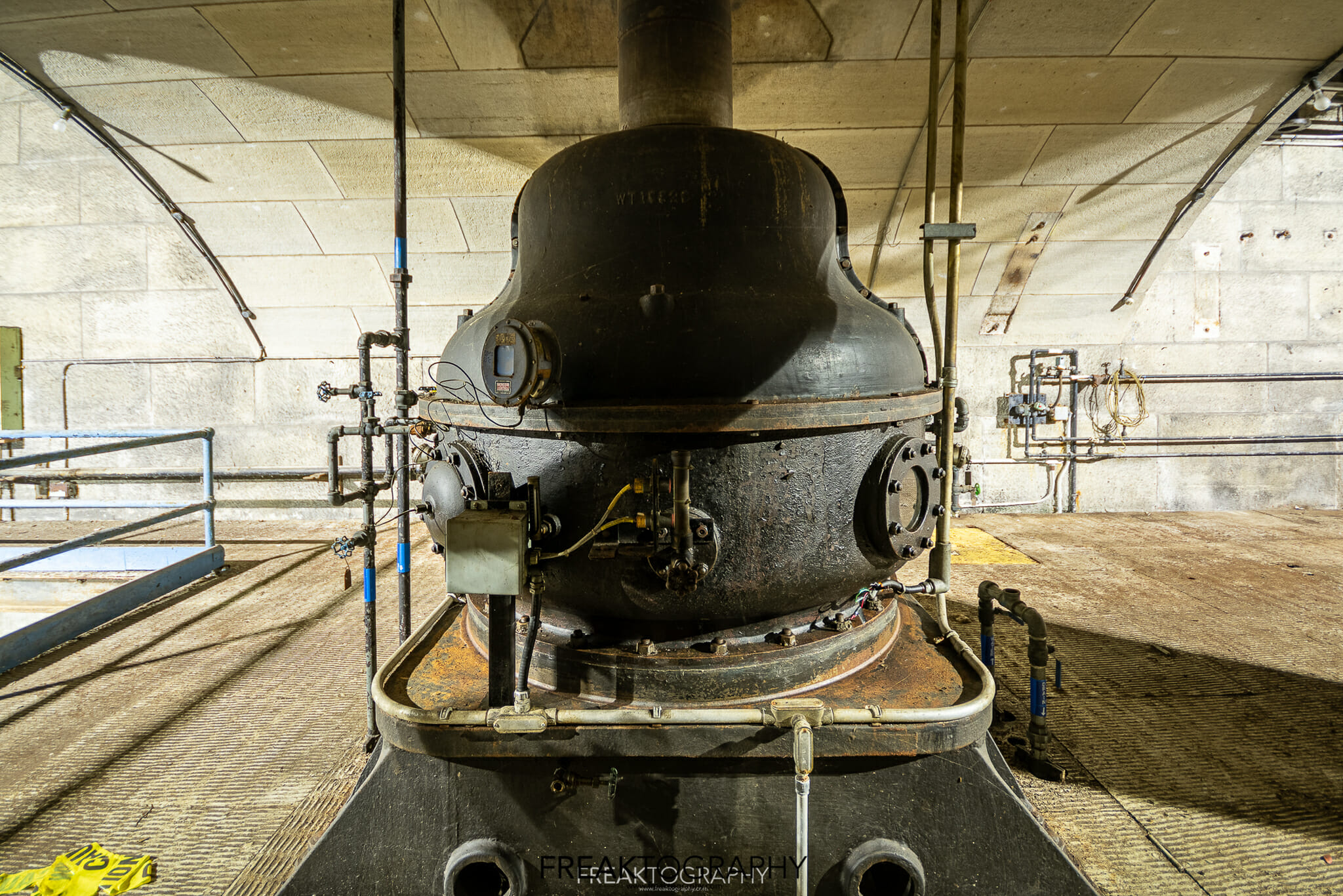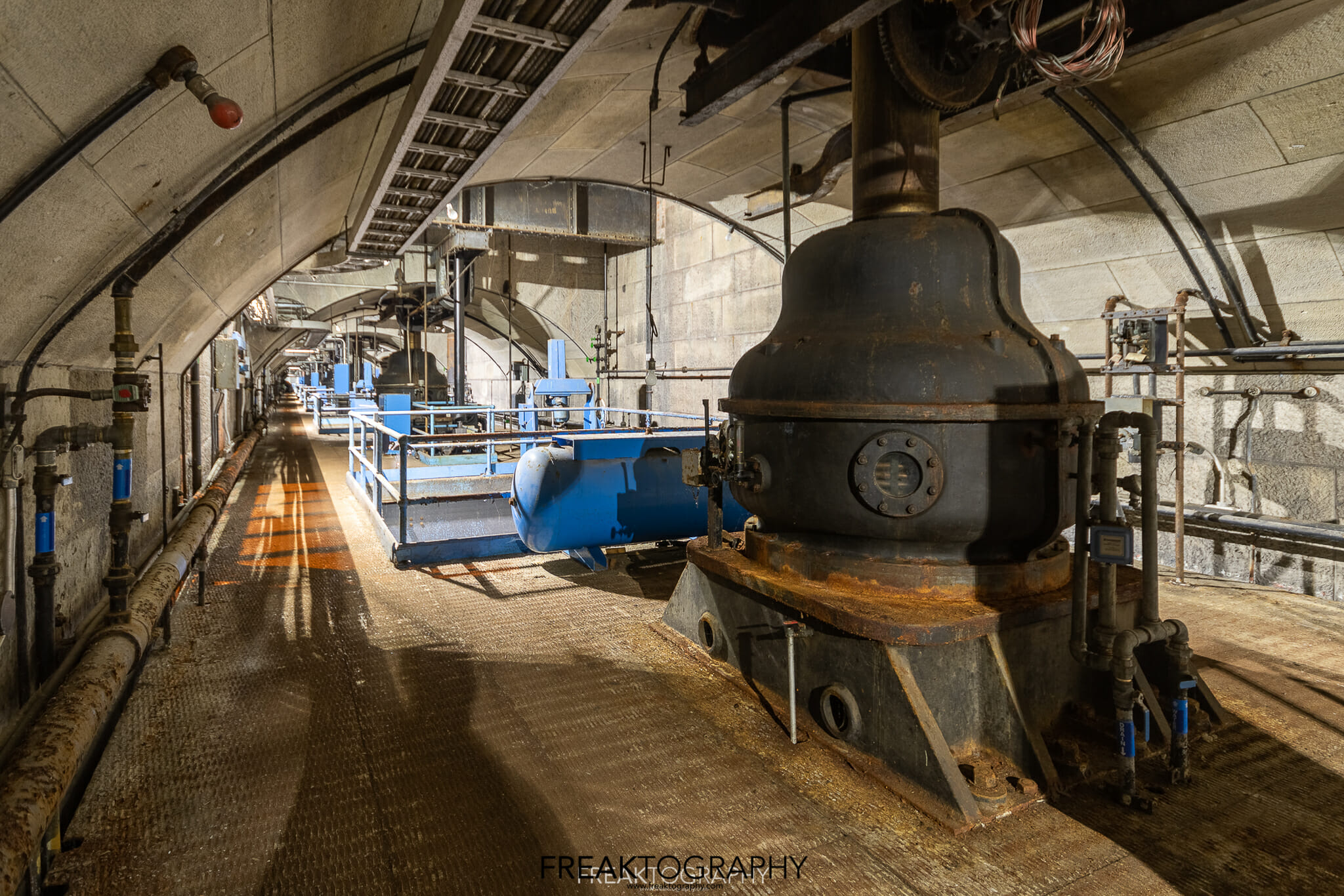 I navigated a handful of stairs that each went down one level, but these only ever went down to storage rooms, tool rooms, locker rooms or the power distribution tunnels. Finally, I had found what I was looking for, a set or stairs, surrounded by flimsy orange “fencing” that had clearly been moved and stepped on. Down I went, one right turn and down one other set of stairs and I was now directly beneath the turbine hall in what is known as the Thrust Deck. The thrust deck, just below the generators, features a beautiful arched ceiling which is built to support the immense weight of the generators above. The thrust deck contains large round metal containers which are thrust bearings that hold the turbine shafts in alignment.