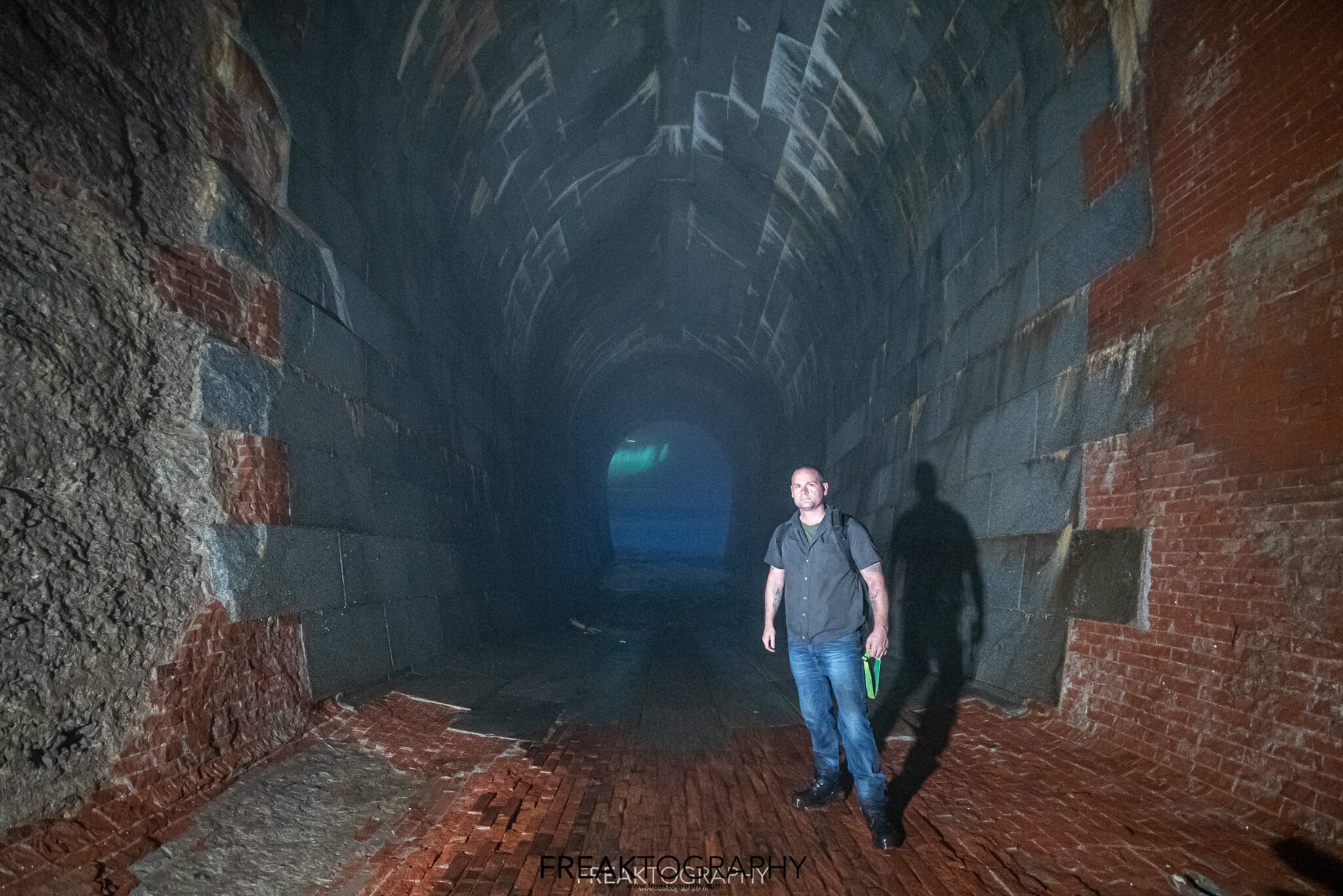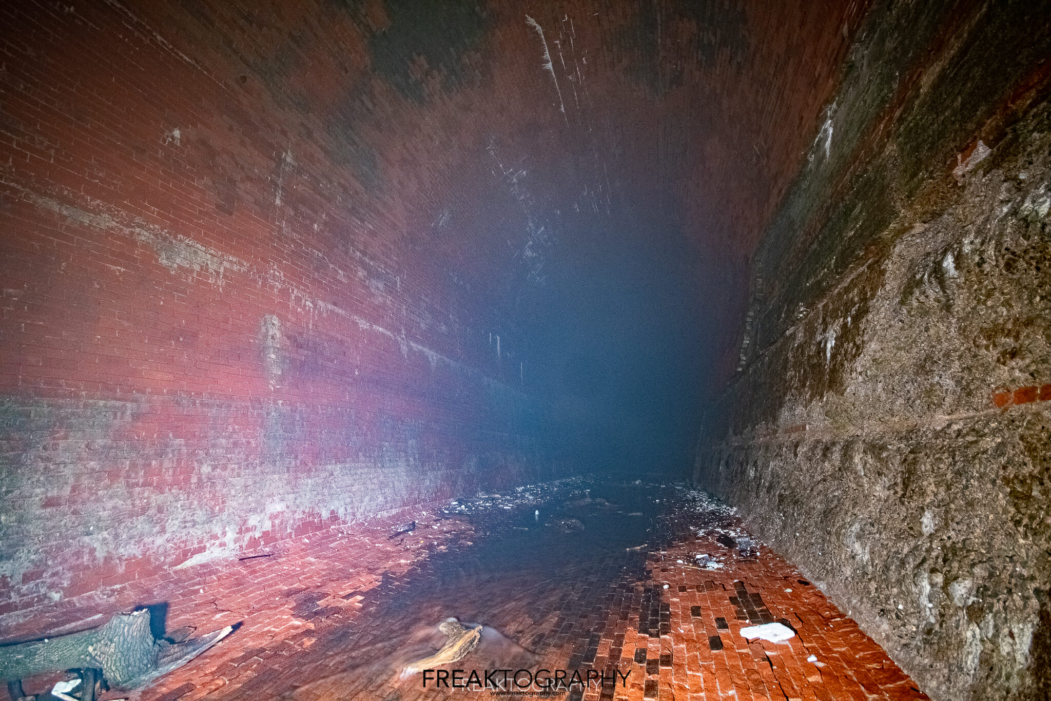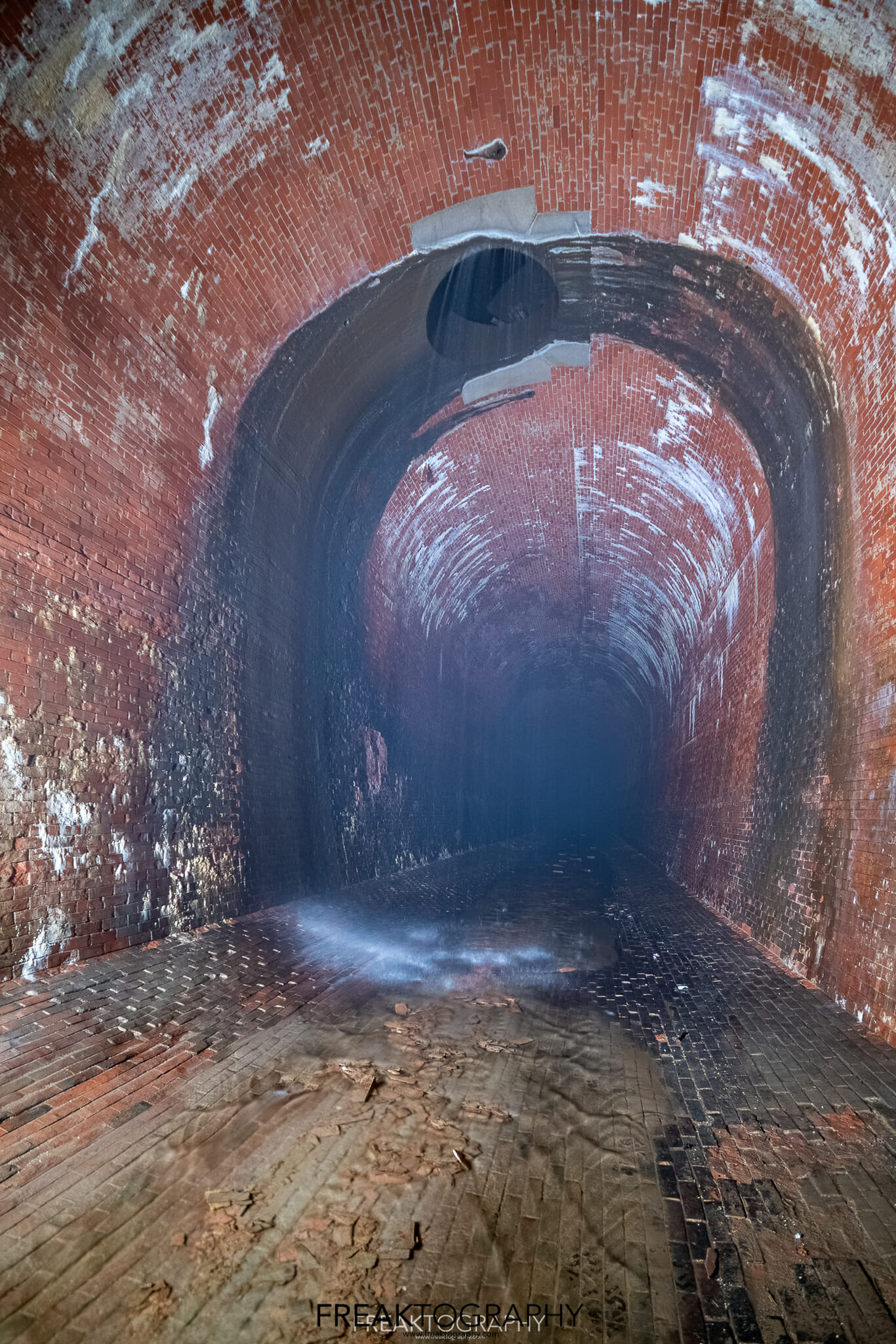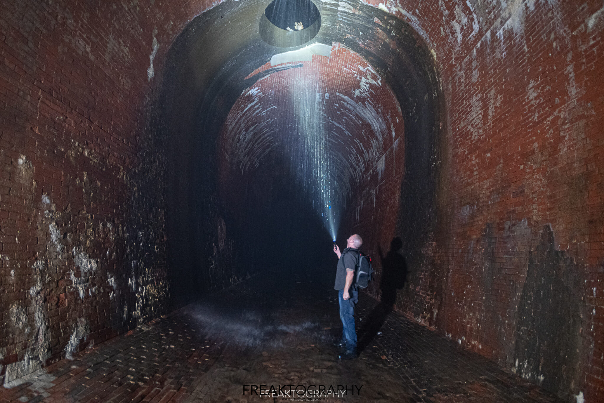 I touch bottom, I am now at the beginning of a 2,200 foot long underground tunnel, I now stand at the brick lined base of an elongated arch at 18.8 feet wide and 25 feet tall and I now have to walk 2,000 feet to my final destination..it is pitch black and it is very misty.