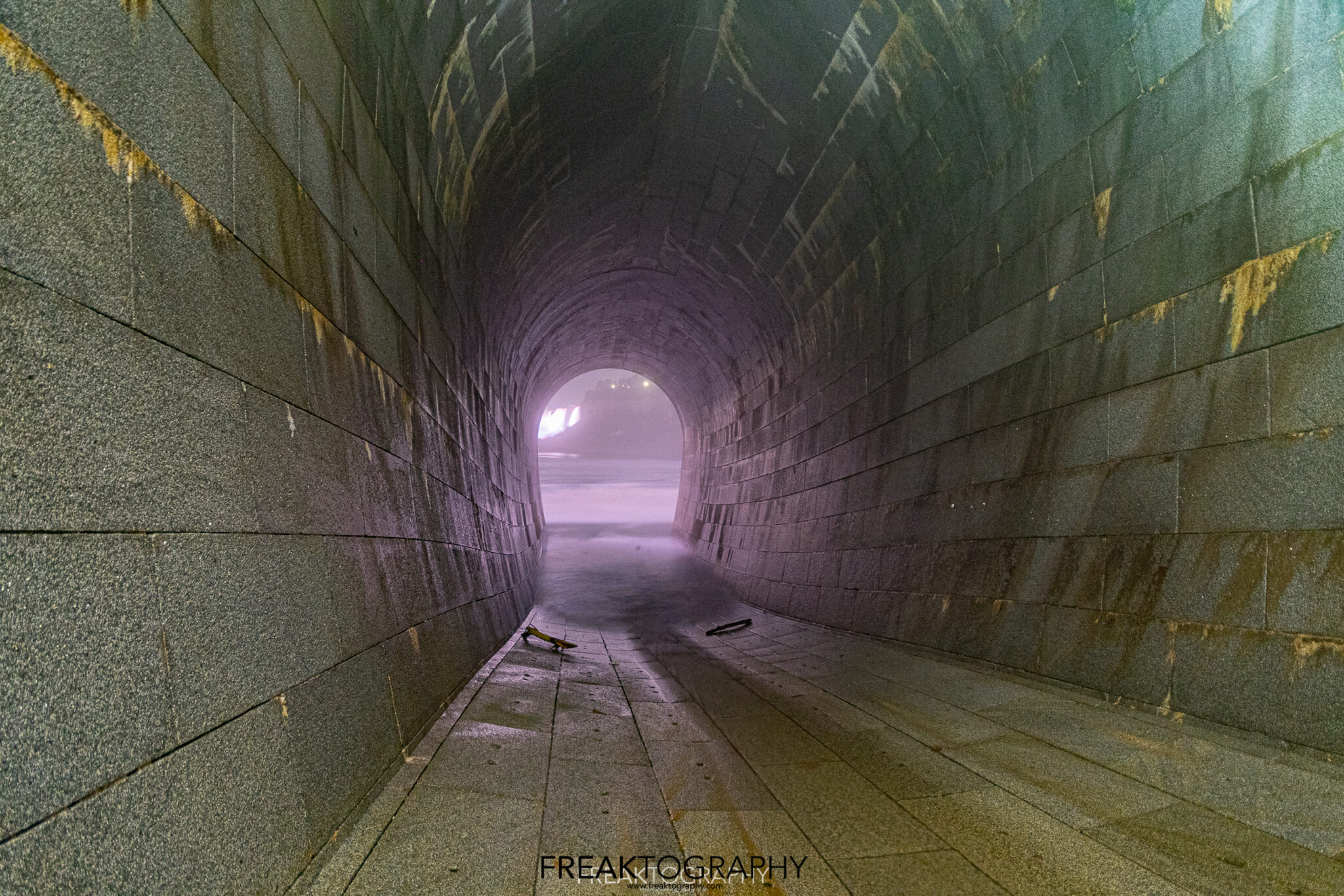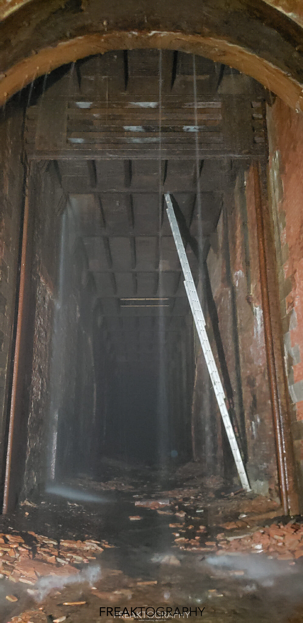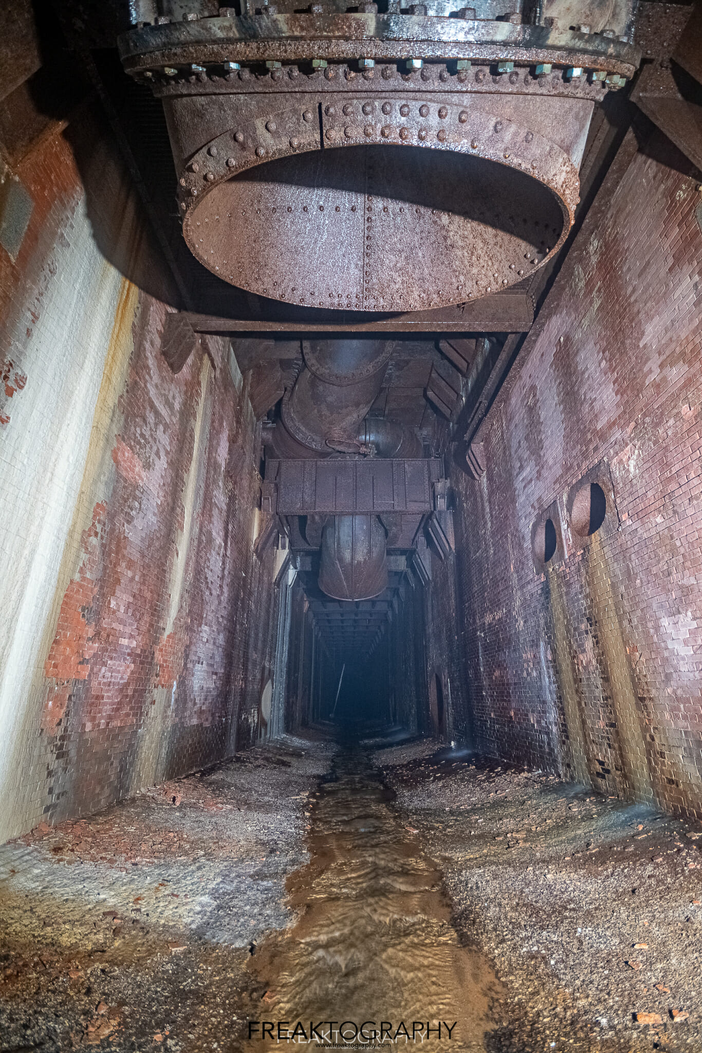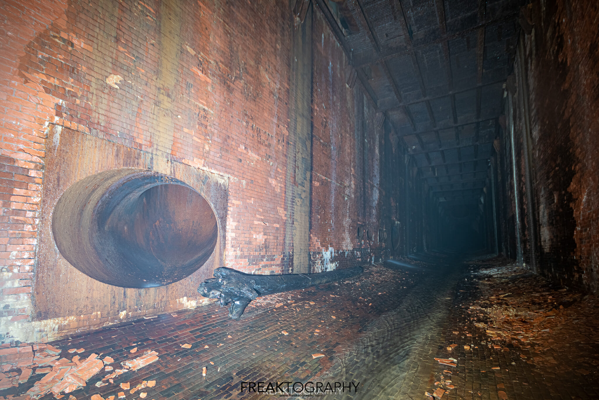 I touch bottom, I am now at the beginning of a 2,200 foot long underground tunnel, I now stand at the brick lined base of an elongated arch at 18.8 feet wide and 25 feet tall and I now have to walk 2,000 feet to my final destination..it is pitch black and it is very misty.