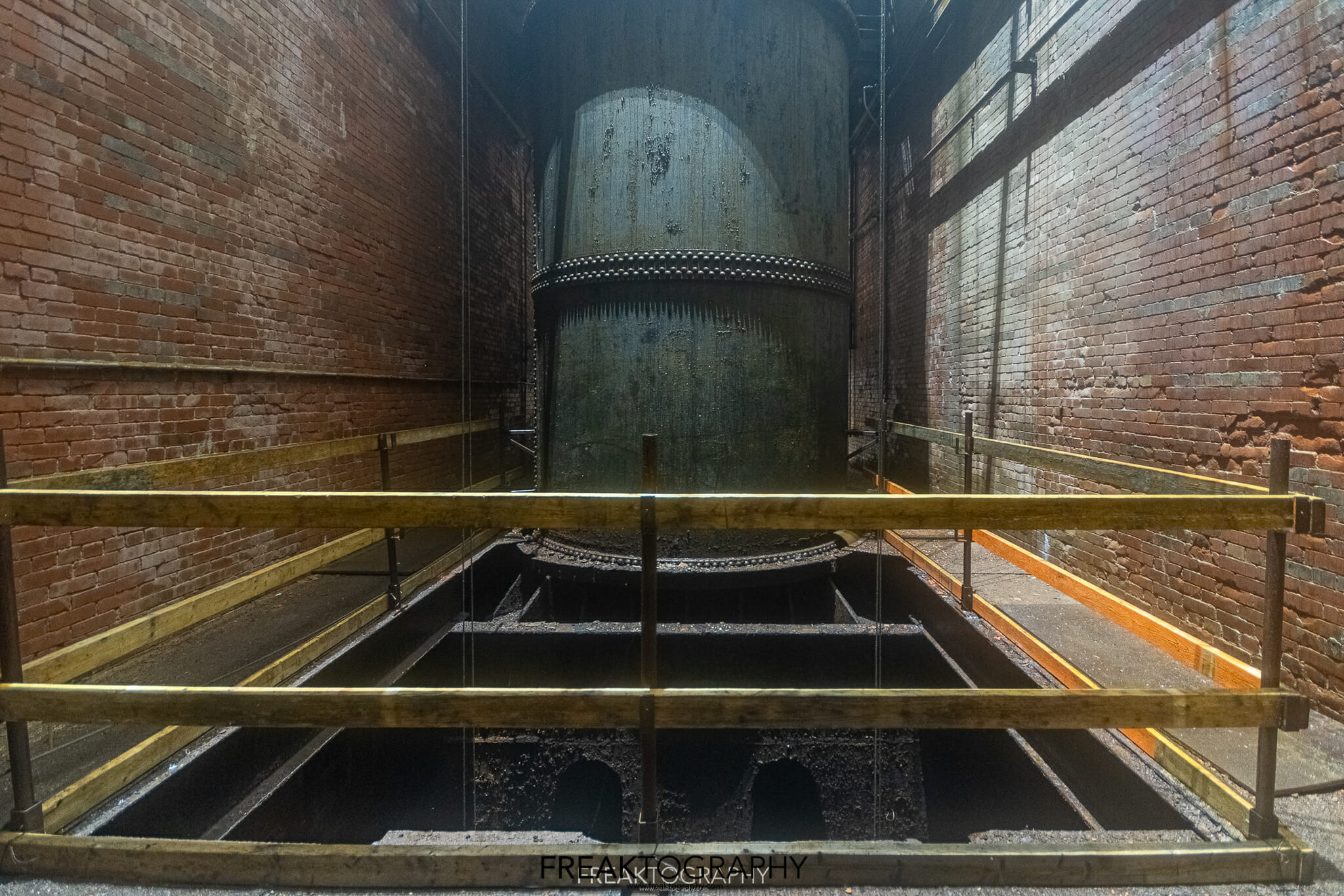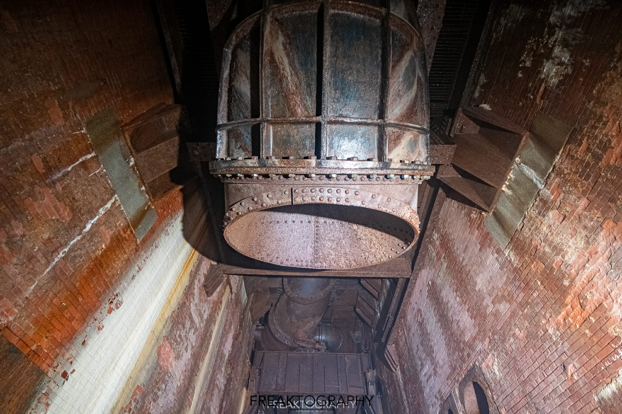 The thrust deck was well lit and fairly clean, but now it’s time to descend a number of ladders that zig zag their way down through the various levels of the wheel pit from the brake deck to the upper guide bearing deck, down more levels to the lower guide bearing deck, finally to the turbine deck and a terrifying climb down into the tailrace. With every level down the air grew cooler, there was mist everywhere, mist that has eaten away at the metal over years and years. The thick layers of rust were all over me, my gloves were brown and wet, my jeans were caked with rust and my face was soaked from the constant mist.