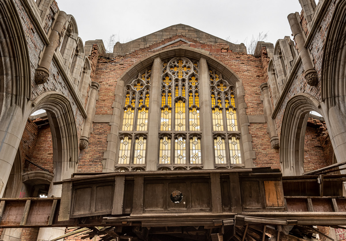 Today, City Methodist Church is barely standing, and much is beyond any realistic restoration, and has been placed on Indiana Landmarks’ 10 Most Endangered Places in Indiana list. Most of the interior fixtures have been removed by thieves. In 2011, part of the roof of the sanctuary collapsed. In 2014, the city authorities revived an aborted plan from the early 2000s to turn the site into a large park in which the sanctuary would be the centrepiece, and to demolish the rest of the complex. This would see the walls and pillars stay in place as a “ruins garden”, while the gymnasium and rest of the structure would be demolished.