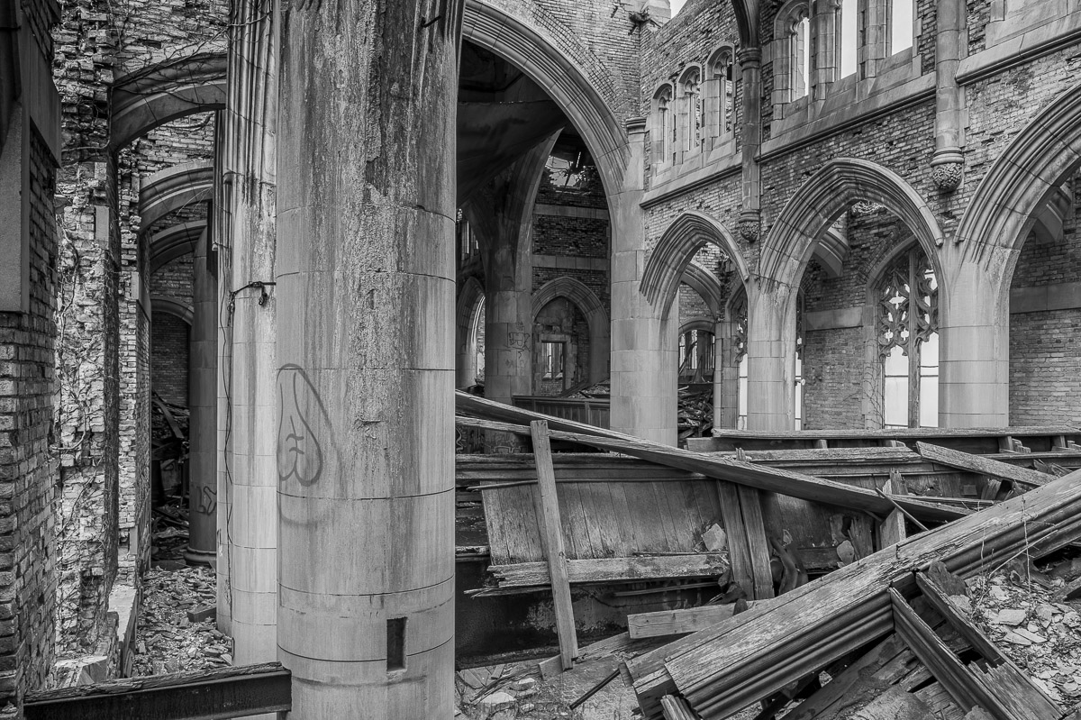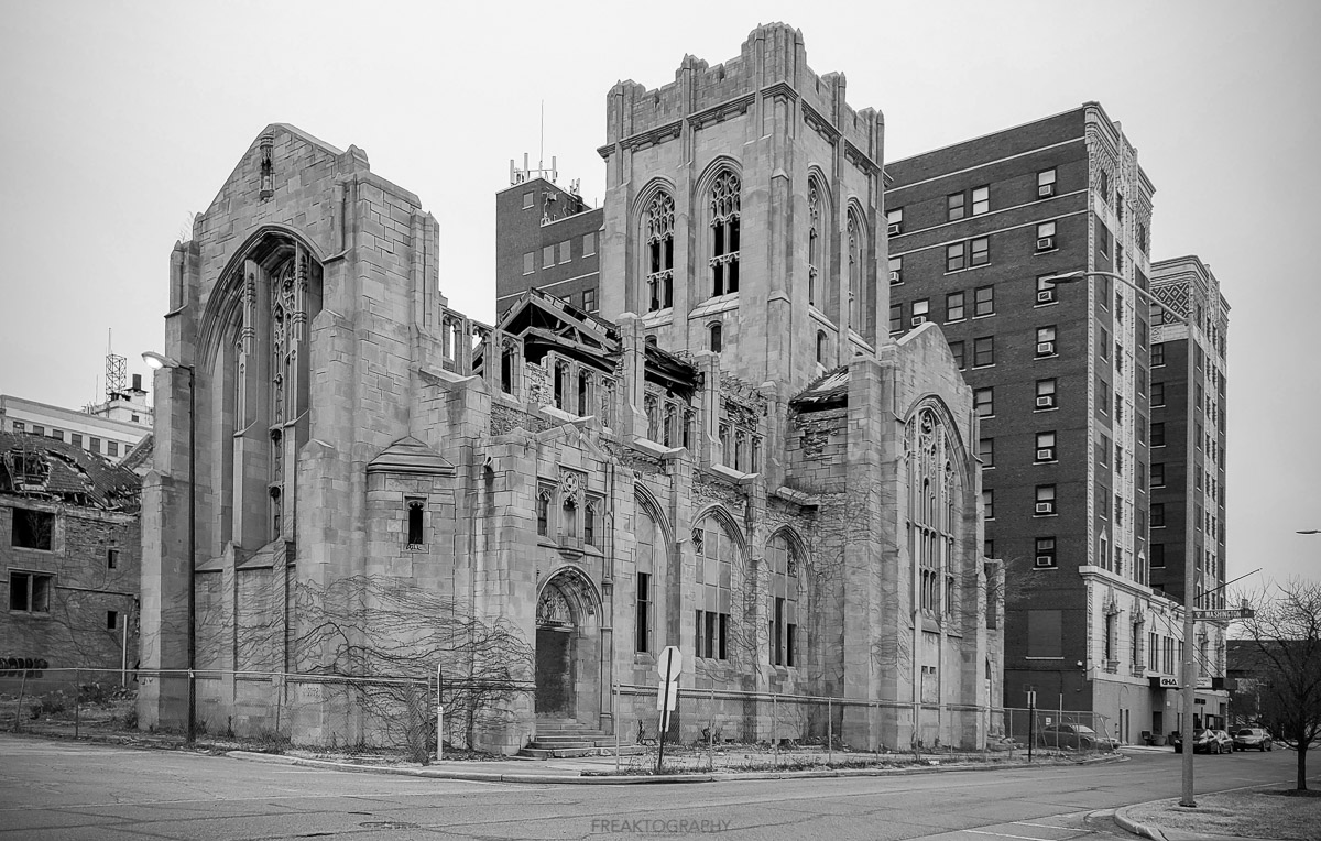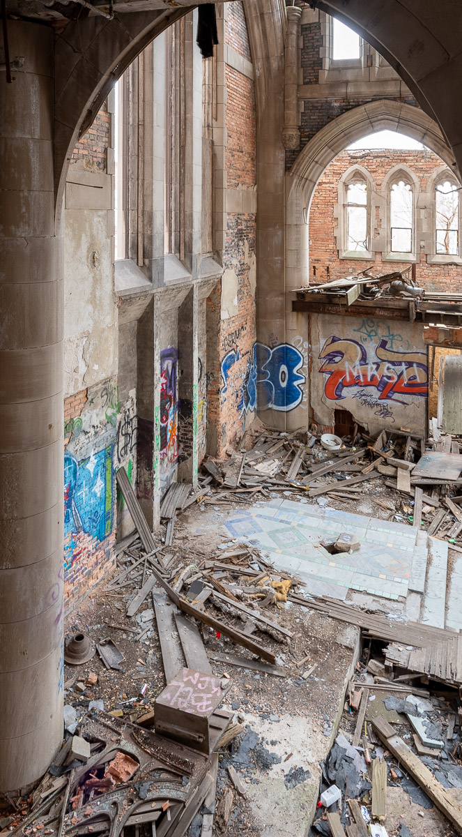 The now abandoned and crumbling City Methodist Church is located in the heart of Gary, Indiana. This was once the largest Methodist church in the Midwest, however it ceased as a place of worship in 1975 after a very brief life of just over 50 years.