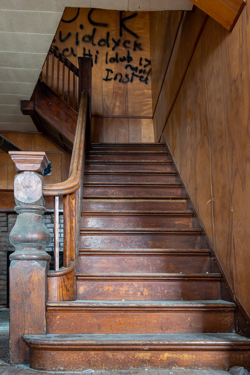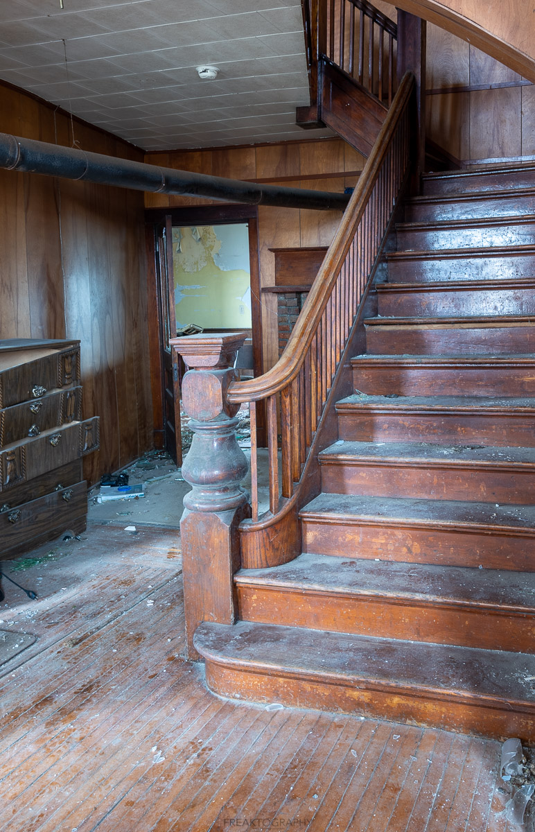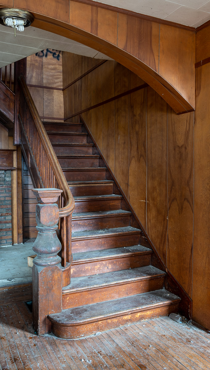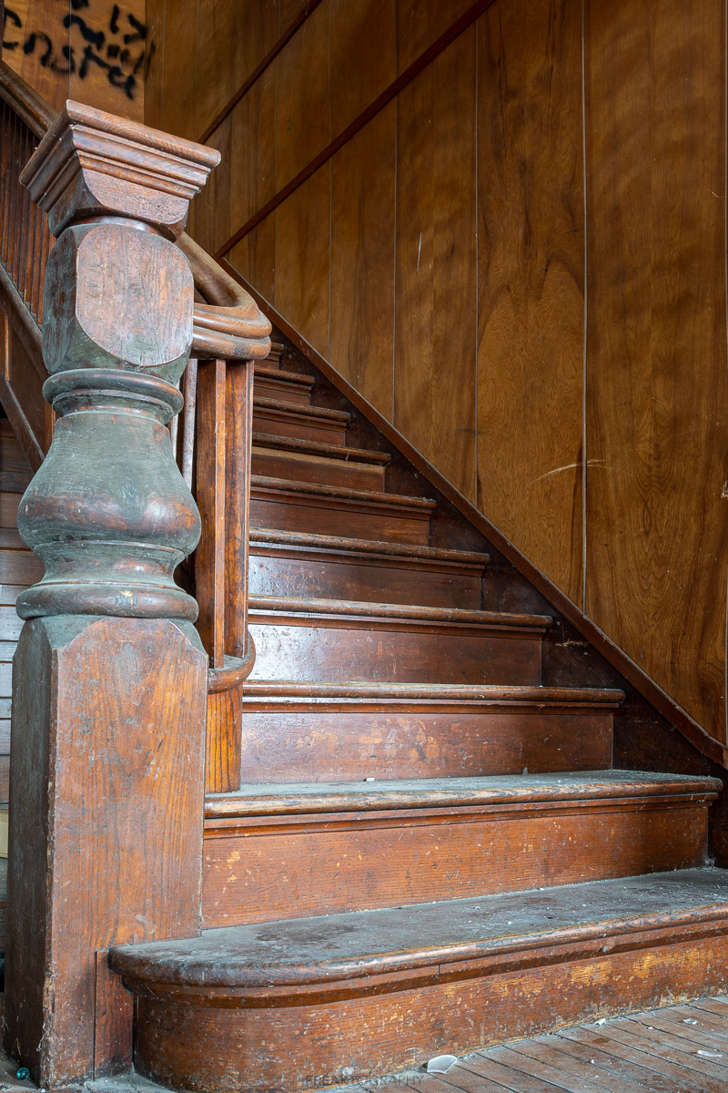 In many abandoned homes the newel, balusters and handrails have either been removed and repurposed or smashed by kids, but thankfully (for now) the whole thing seems intact! The only thing that seems to be missing is the decorative cap on the top of the newel post.