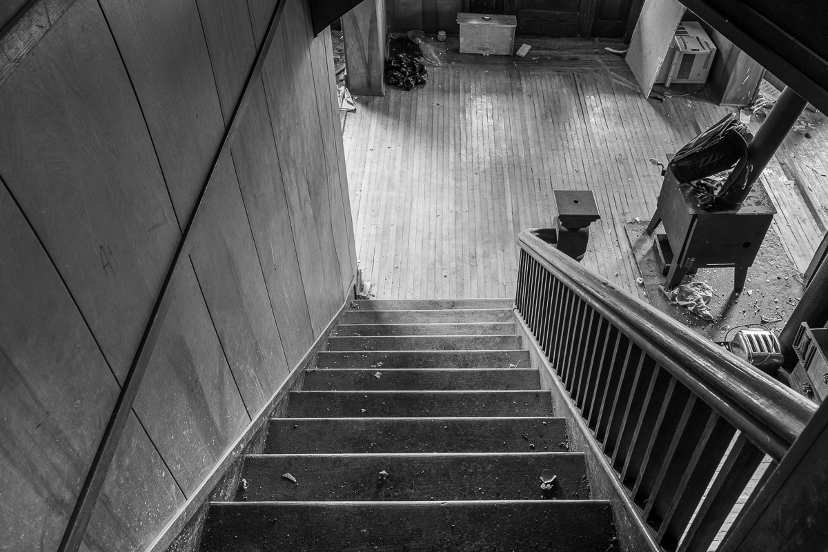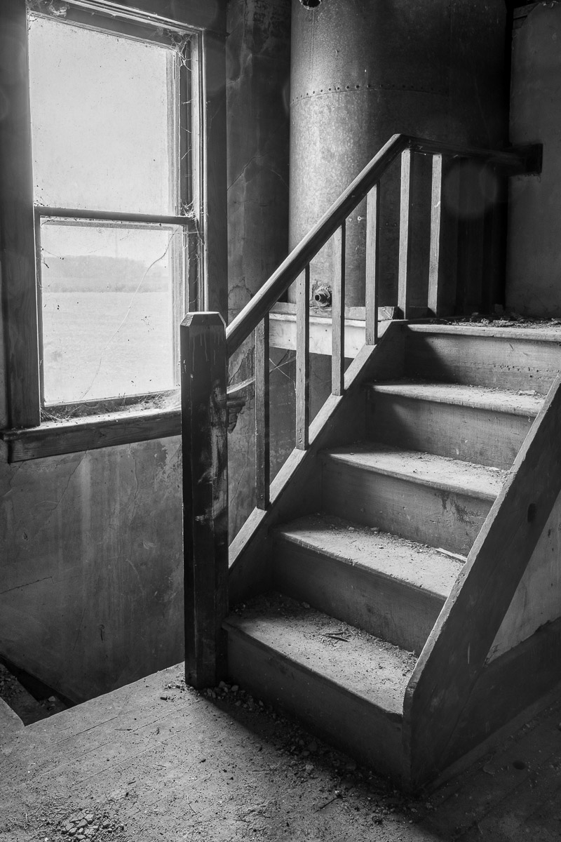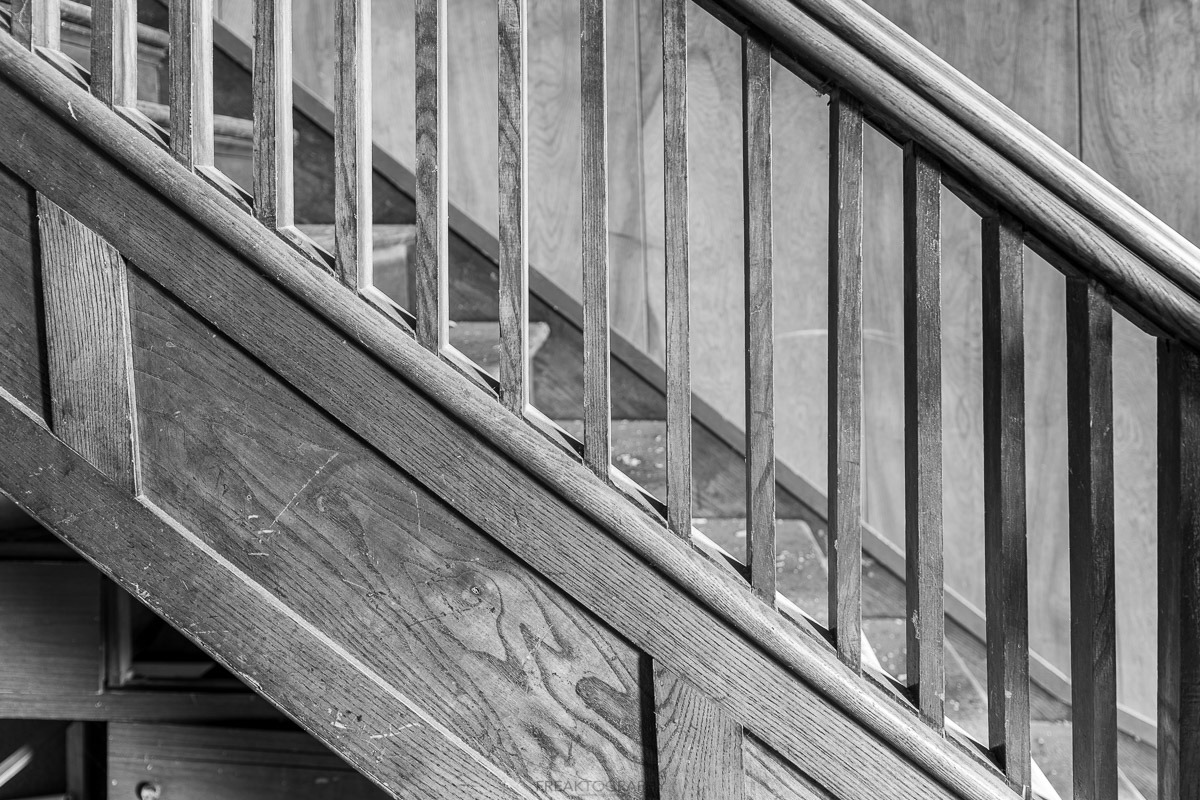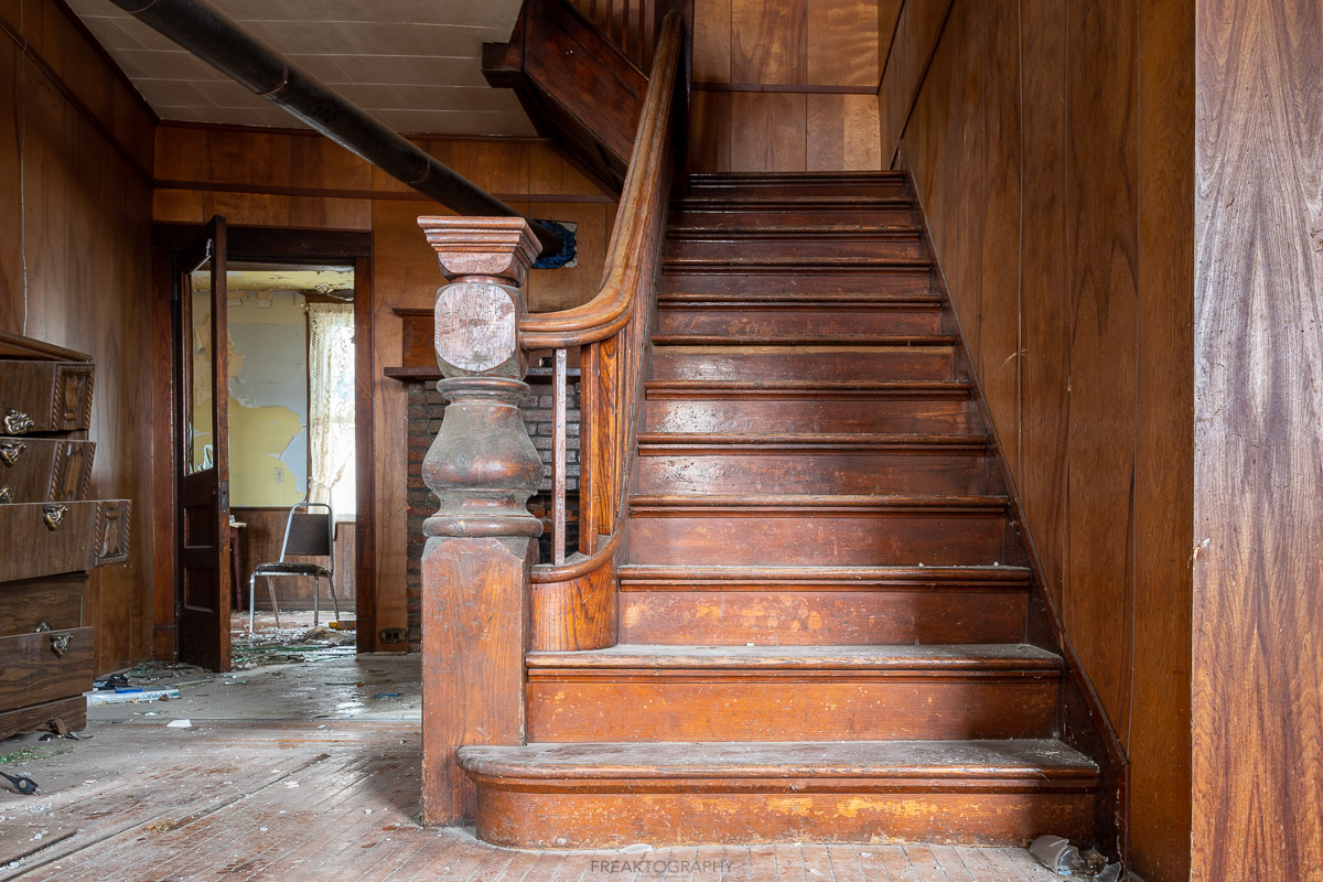 In many abandoned homes the newel, balusters and handrails have either been removed and repurposed or smashed by kids, but thankfully (for now) the whole thing seems intact! The only thing that seems to be missing is the decorative cap on the top of the newel post.