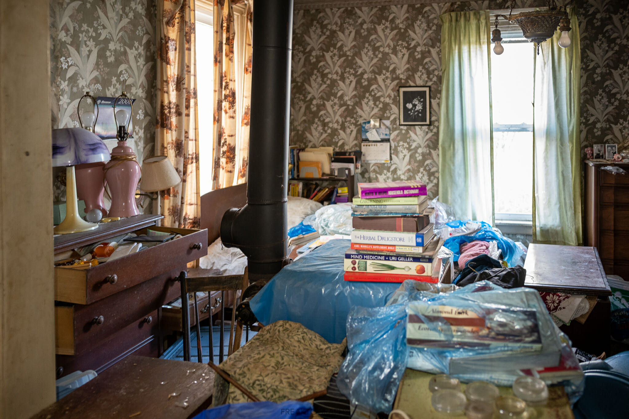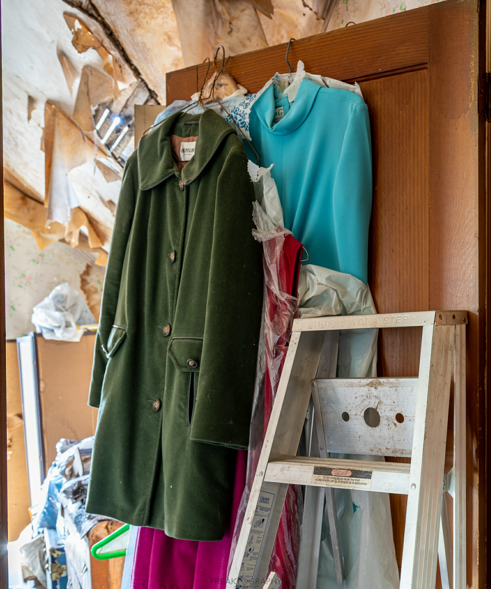 With the neighbour’s dog barking at me aggressively I made my way to the house and found the opened door, stepping inside I nearly tripped on all of the debris. I already know how this is going to go, these types of homes are near impossible to shoot, there is too much stuff, too many piles and it is so hard to navigate from room to room.