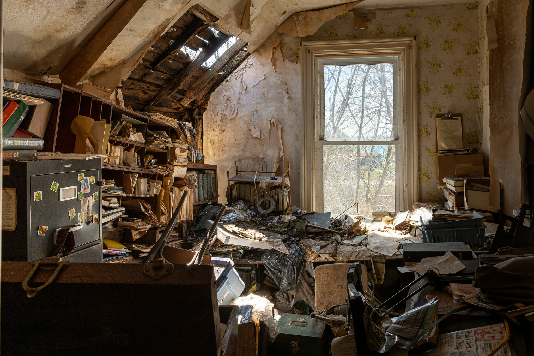 I decided to start with video and I’ll shoot pictures later, tripping over debris, stepping on things and trying my best to not disrupt things too badly. I work from room to room.