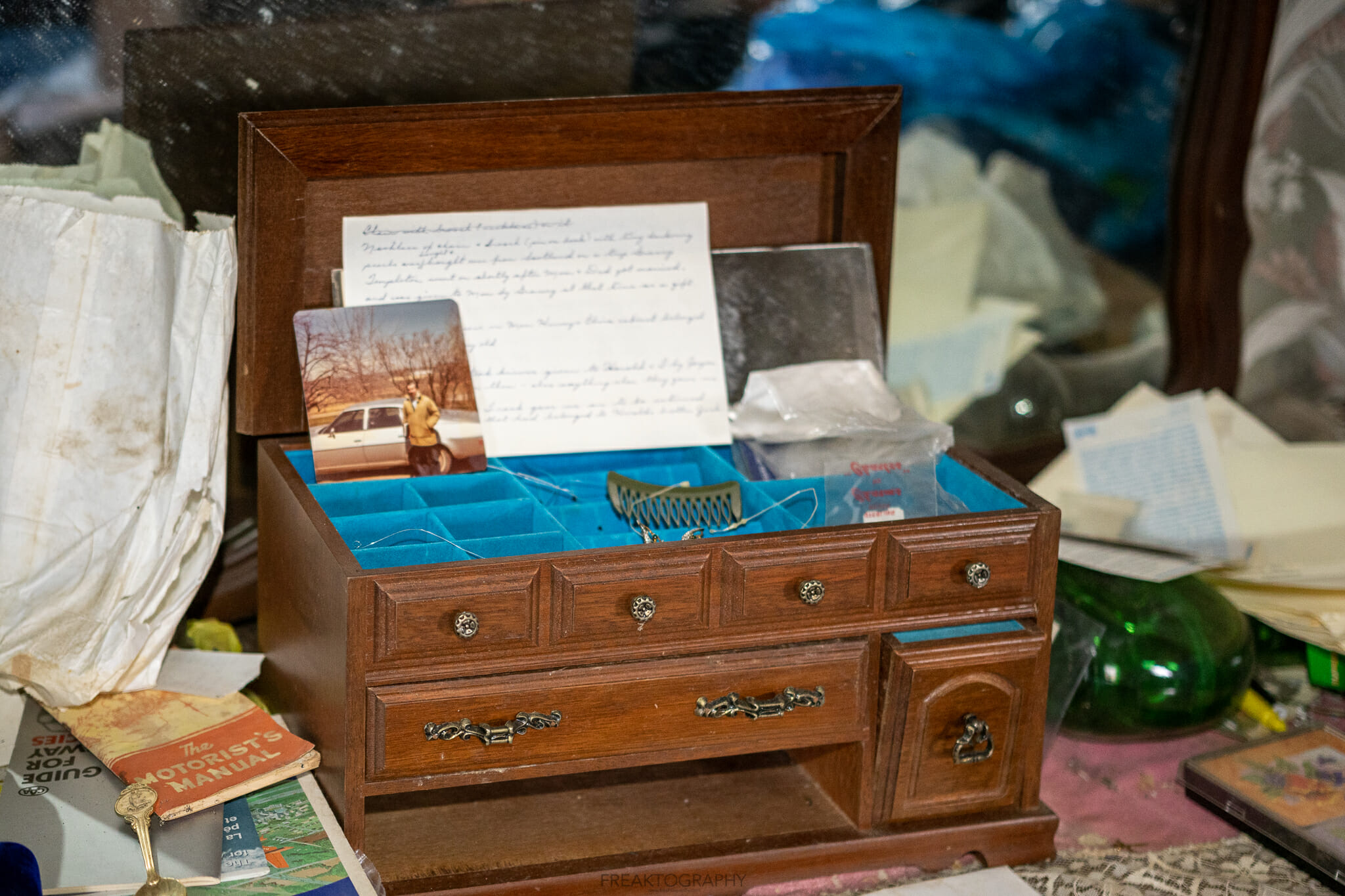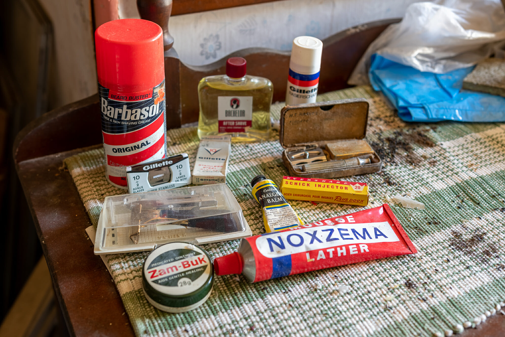 Not wanting to remove the items, I place the boxes low, amongst a pile of books, somewhere less obvious and not at eye level. I plan to head home and see if I can locate family or whoever owns the property and advise them of what I’ve found and where they can go to retrieve them. It’s time to pack my gear and head home and make sense of all this.