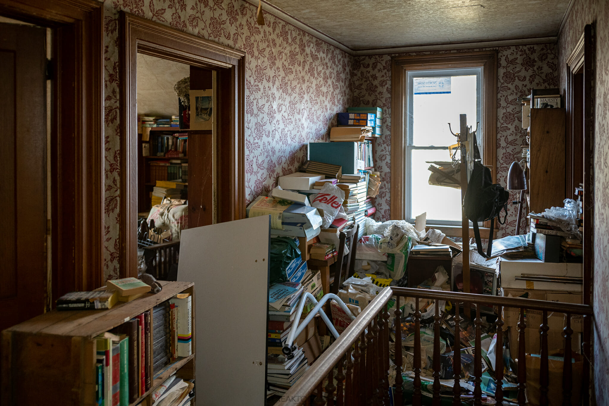 Stumbling my way across I came to the staircase to bring me upstairs, the stairs would be no different than the rest of the house with debris scattered on every step. Making my way up I find myself with 5 rooms up here to explore, each filled with more books, magazines, furniture, dressers, beds etc.