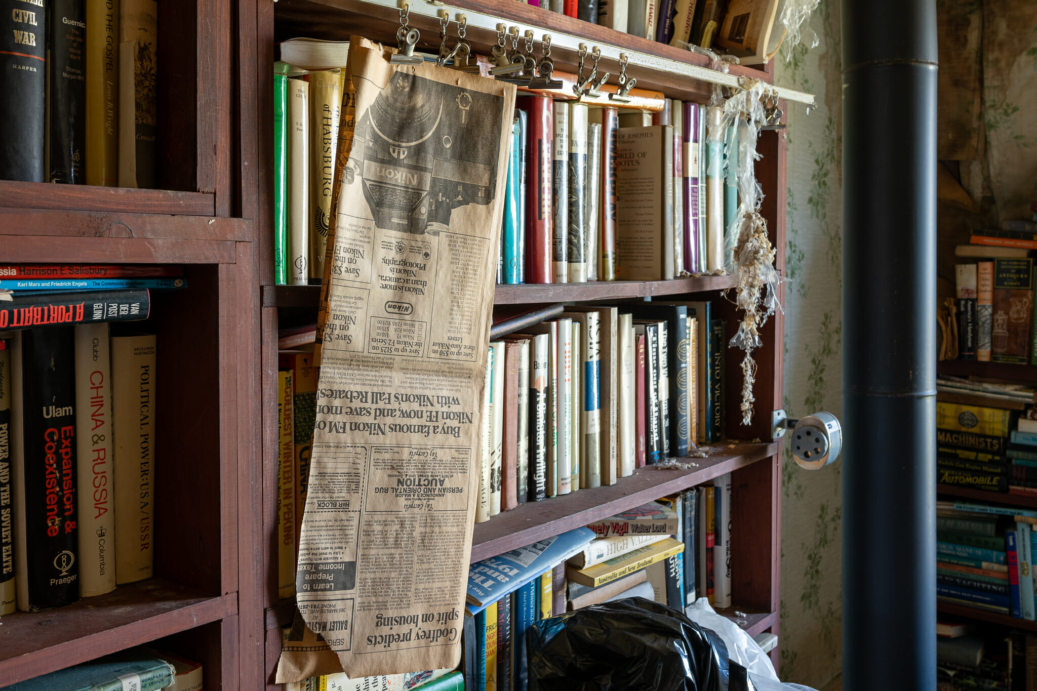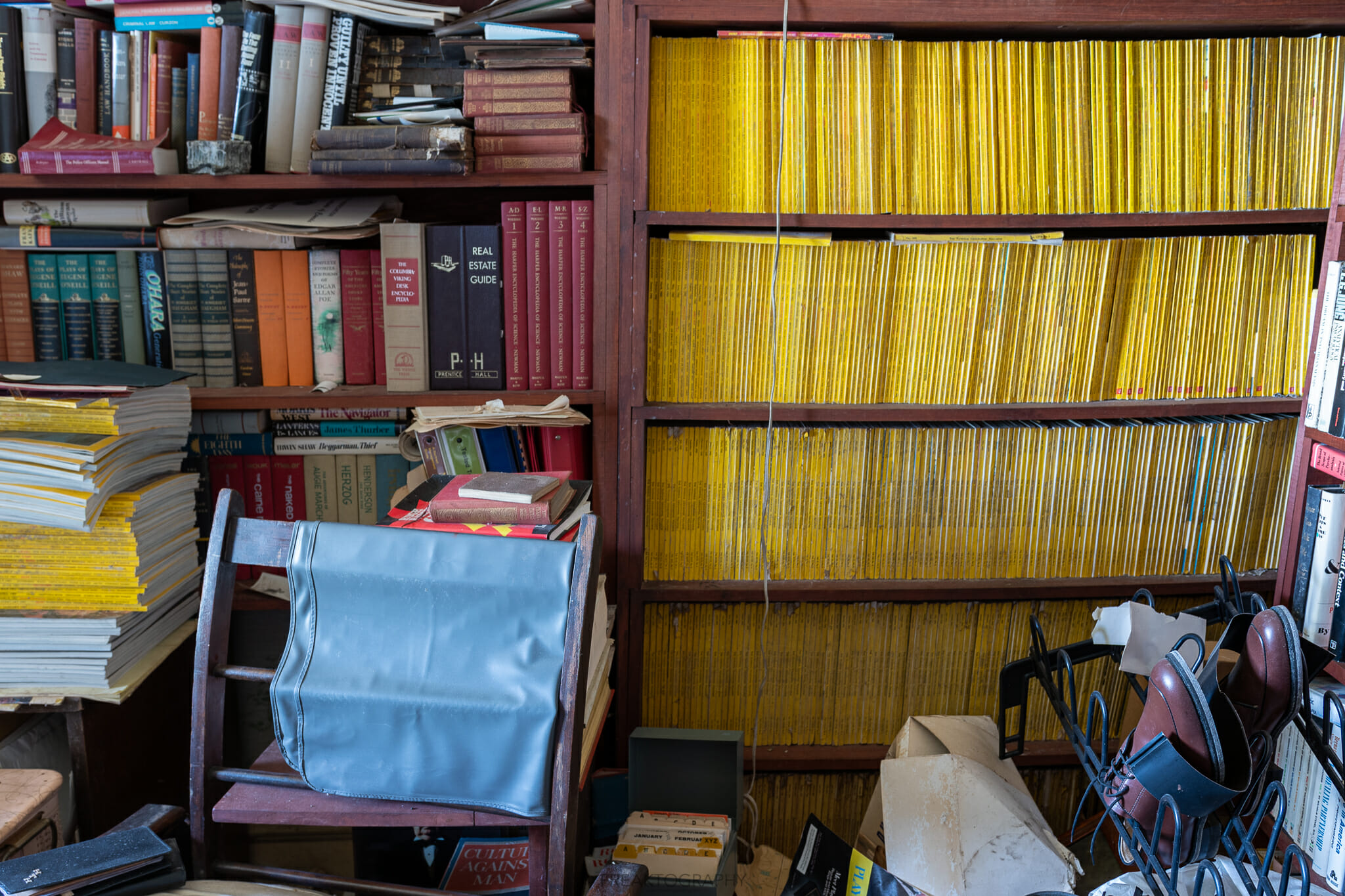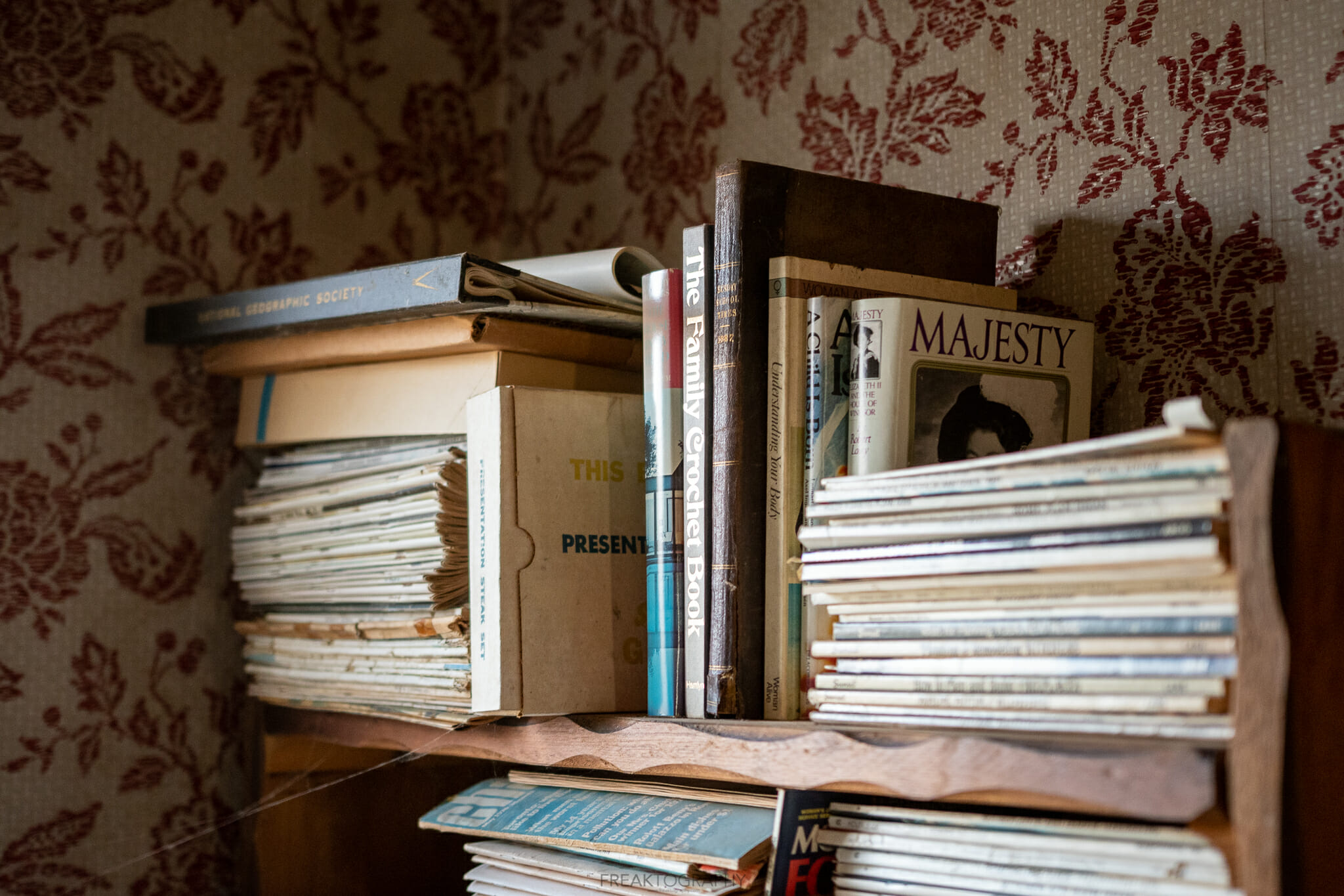 Entering room #4, this room seems to be a library and an office space, every wall is covered with books about wars, religions, travel, poetry, leadership, world history, real estate along with every single issue of National Geographic ever published during the time that this home was active.